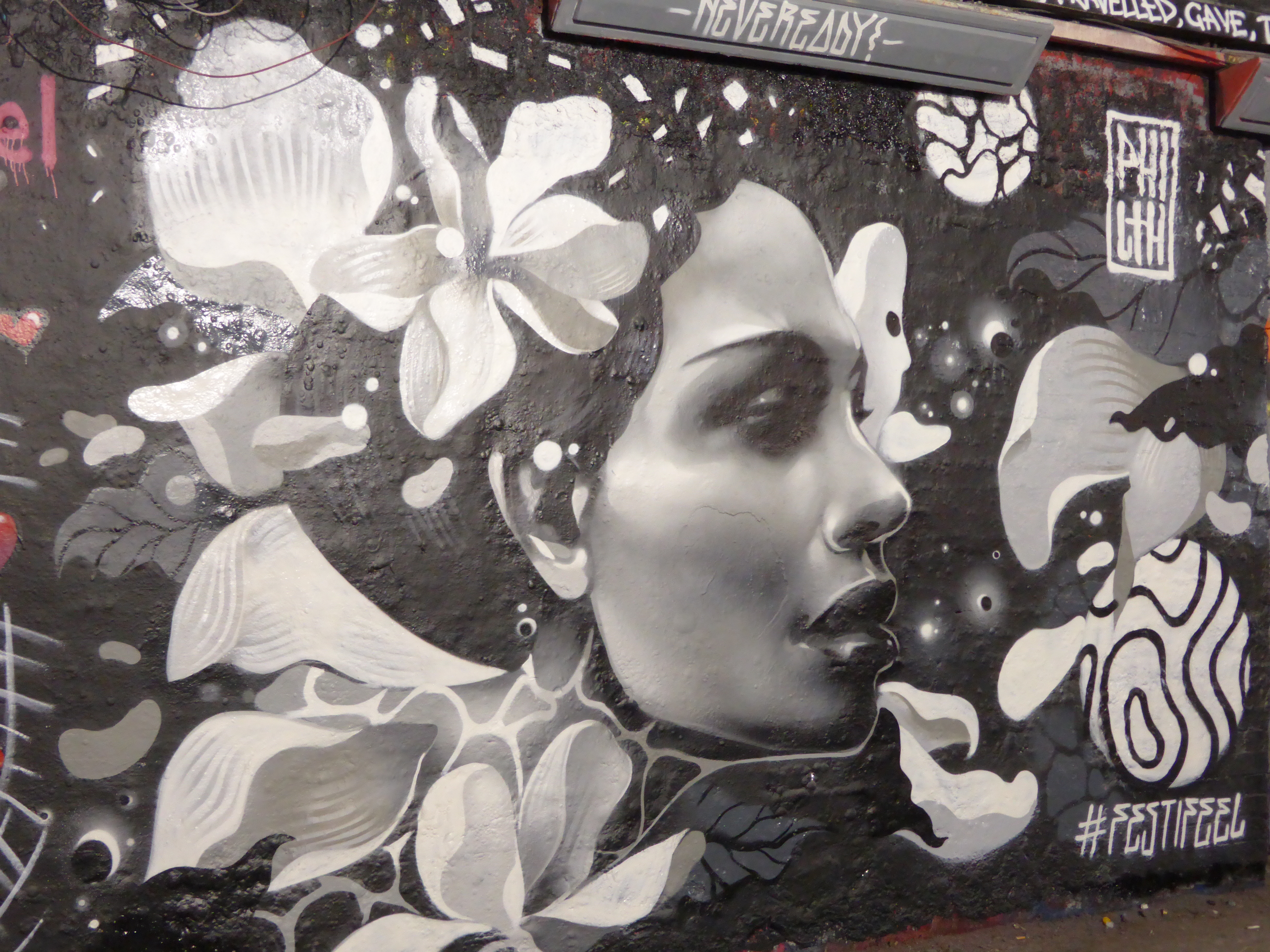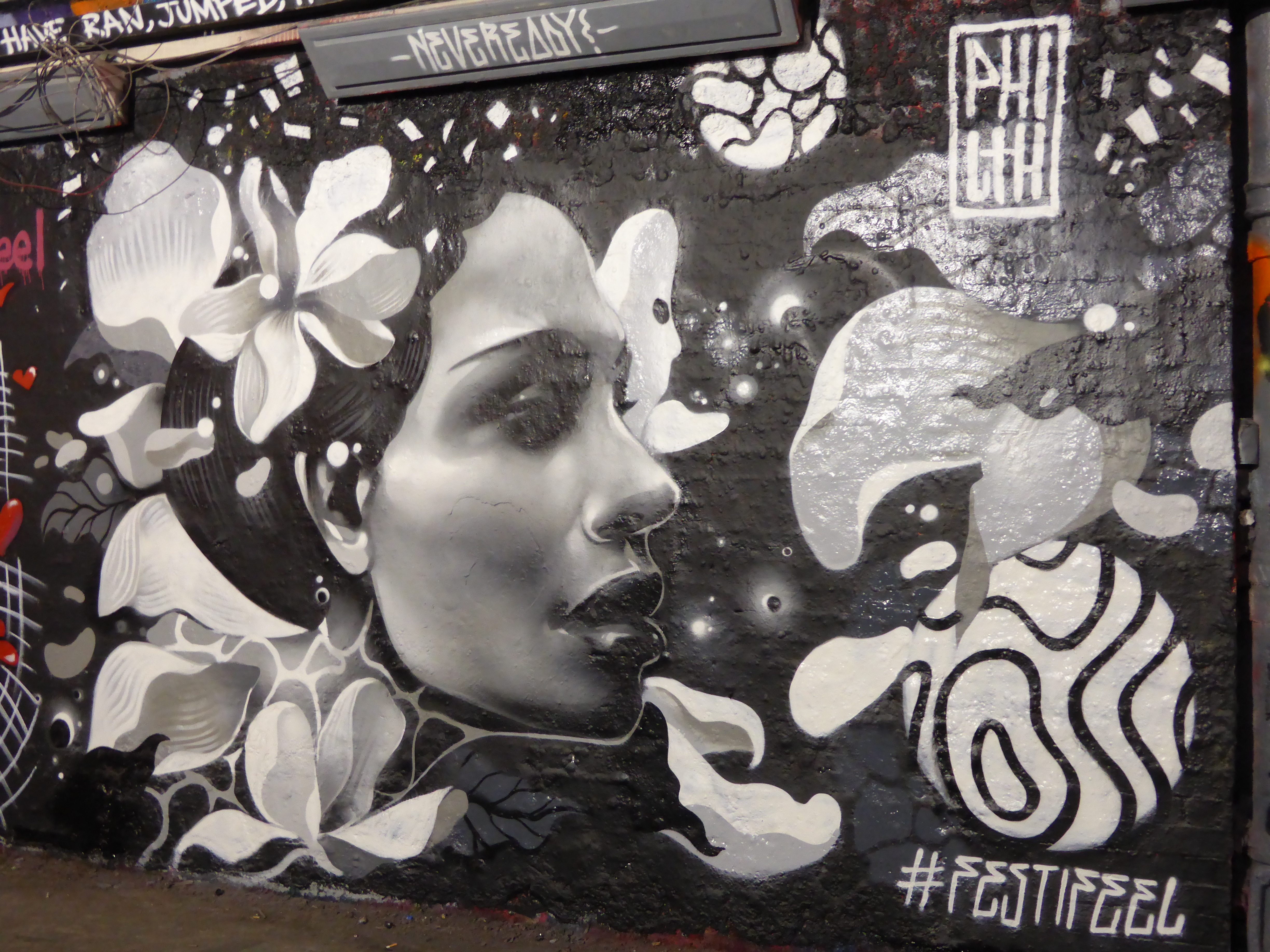 Beautiful work by Philth Blake, an artist whose work we very much admire and only hope to see more of in London. This piece really is stunning in his trademark grey-scale colour palette, an exceptional treat to spy in the legal Graffiti tunnel.