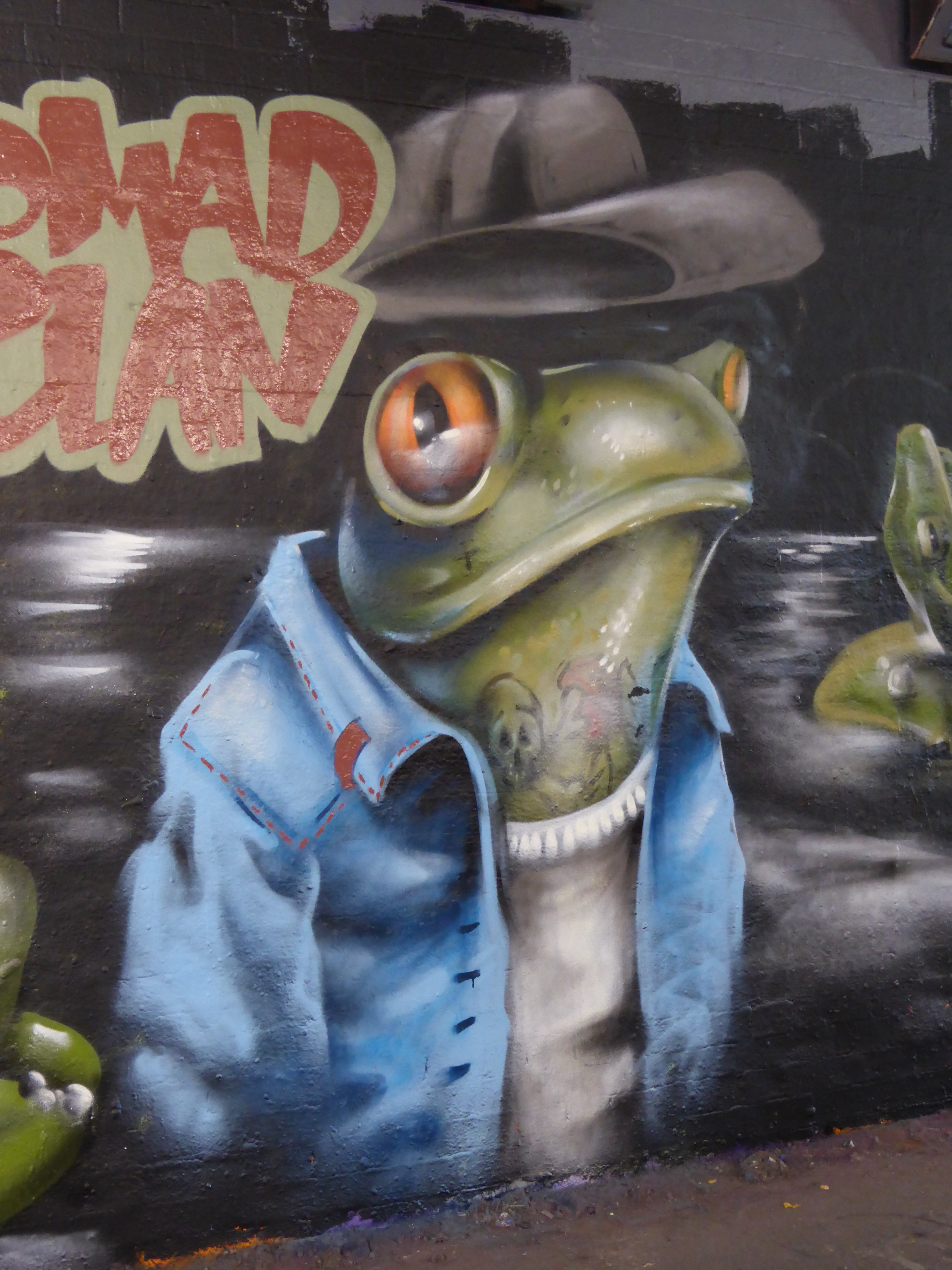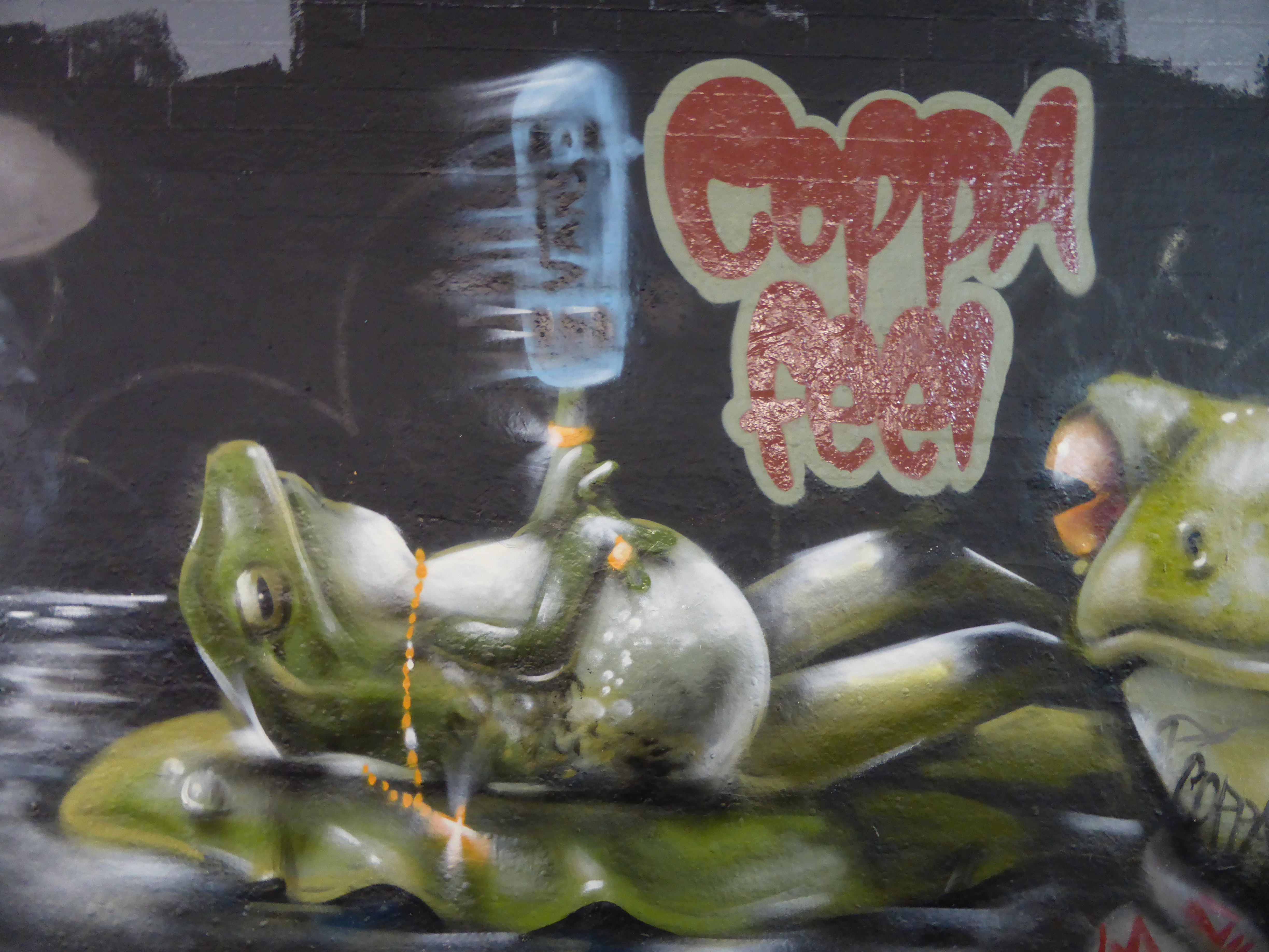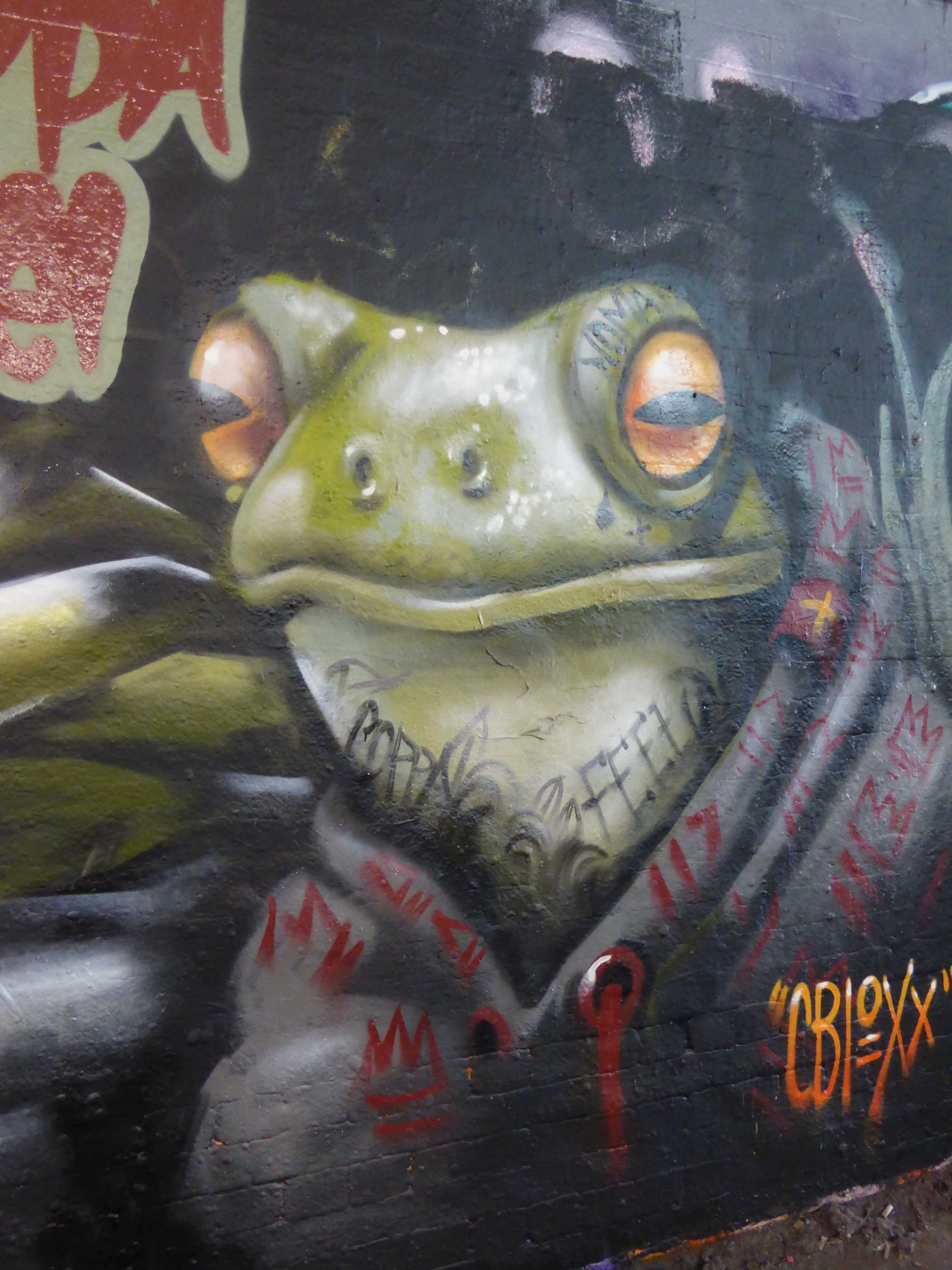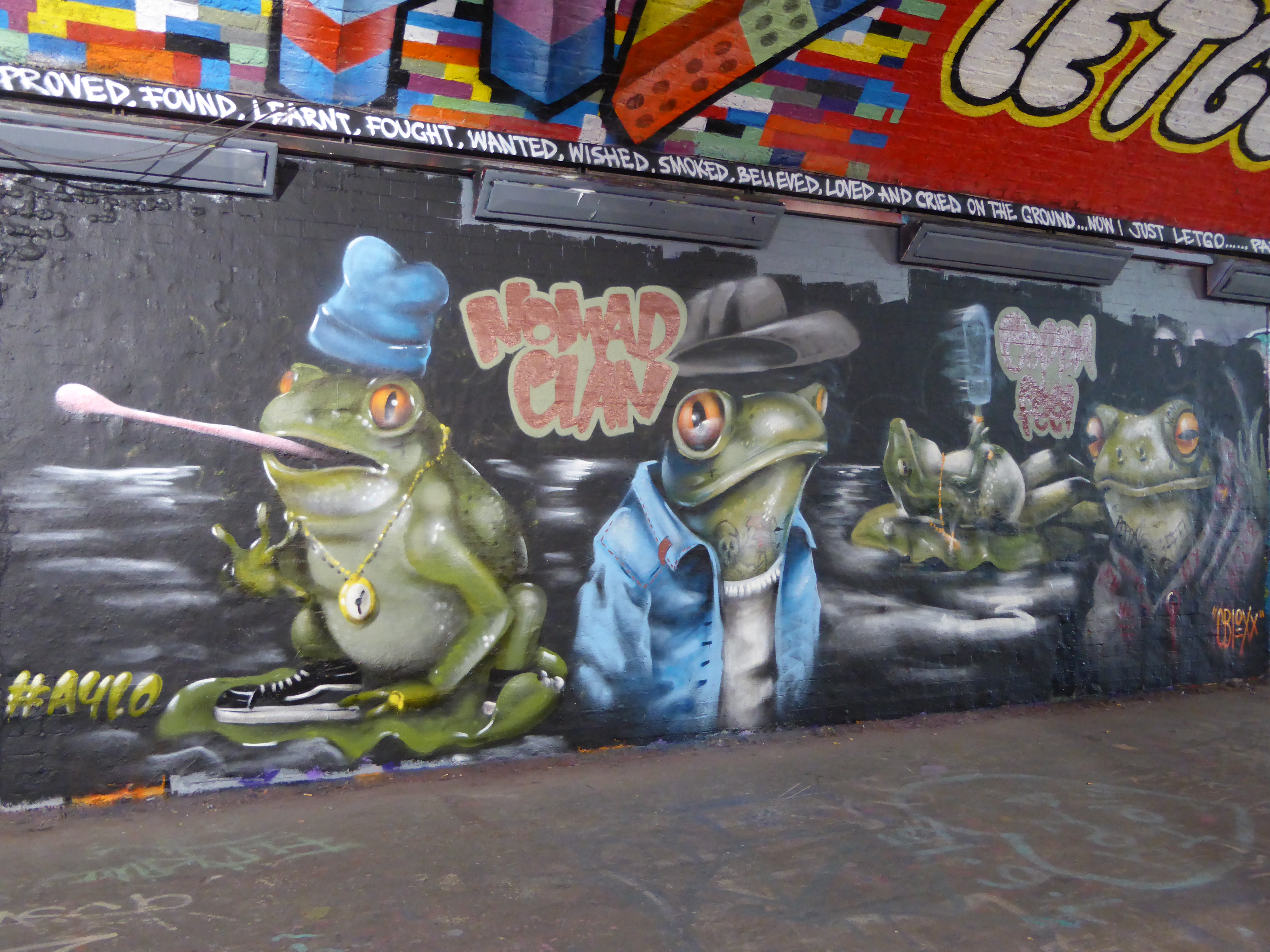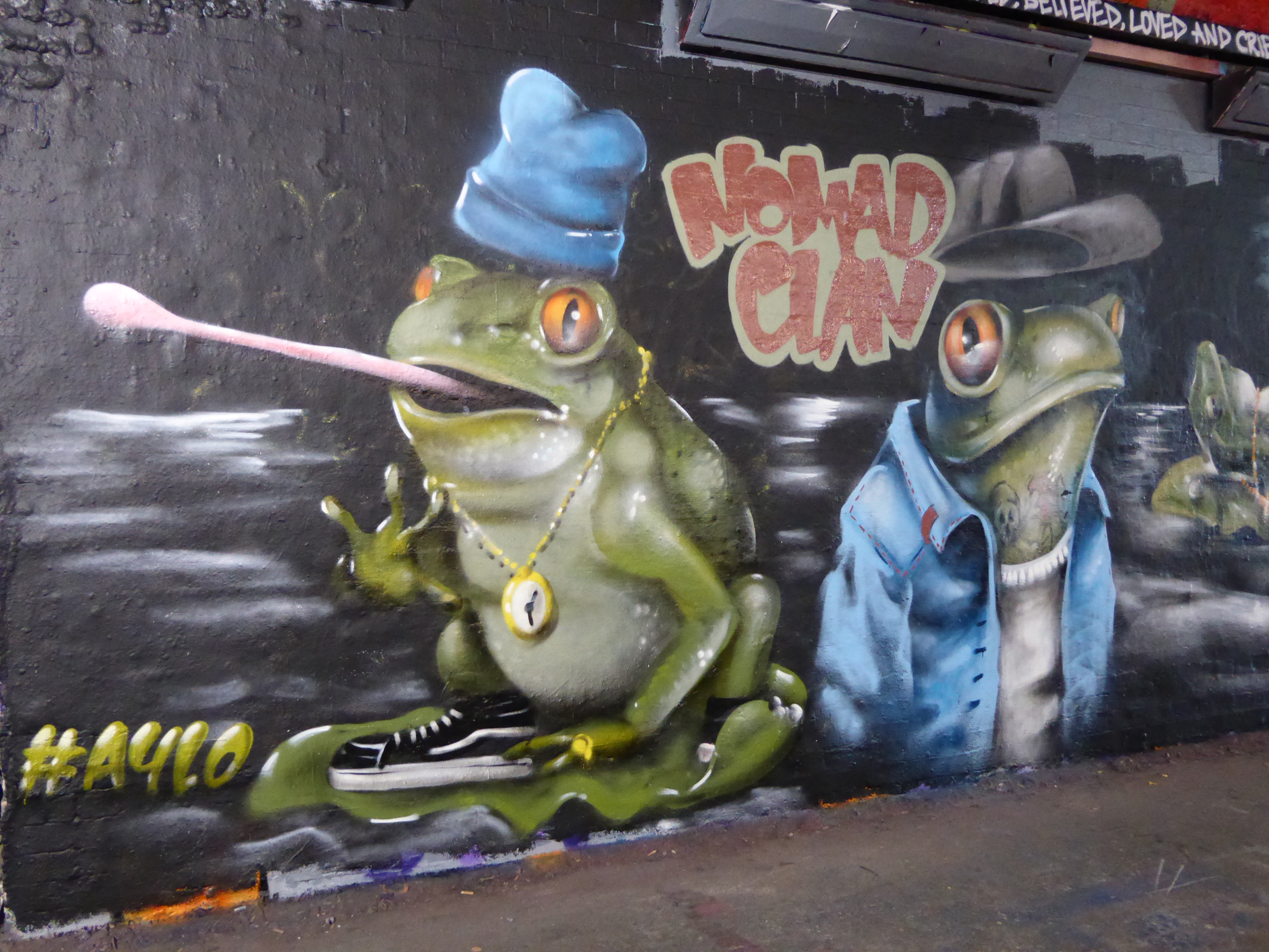 Delightful work from Nomad Clan duo, Aylo & CBloxx, two of our very favourite artists here at London Calling Blog, and again a duo we are always pleased to find painting London way. This work is very much fundamental Nomad Clan, with their surreal creations, on this occasion featuring several personified hip-hop frog characters. Love the tattoo details added to the frogs in this piece. A great contribution for sure, but to be honest we expect little else from this pair.