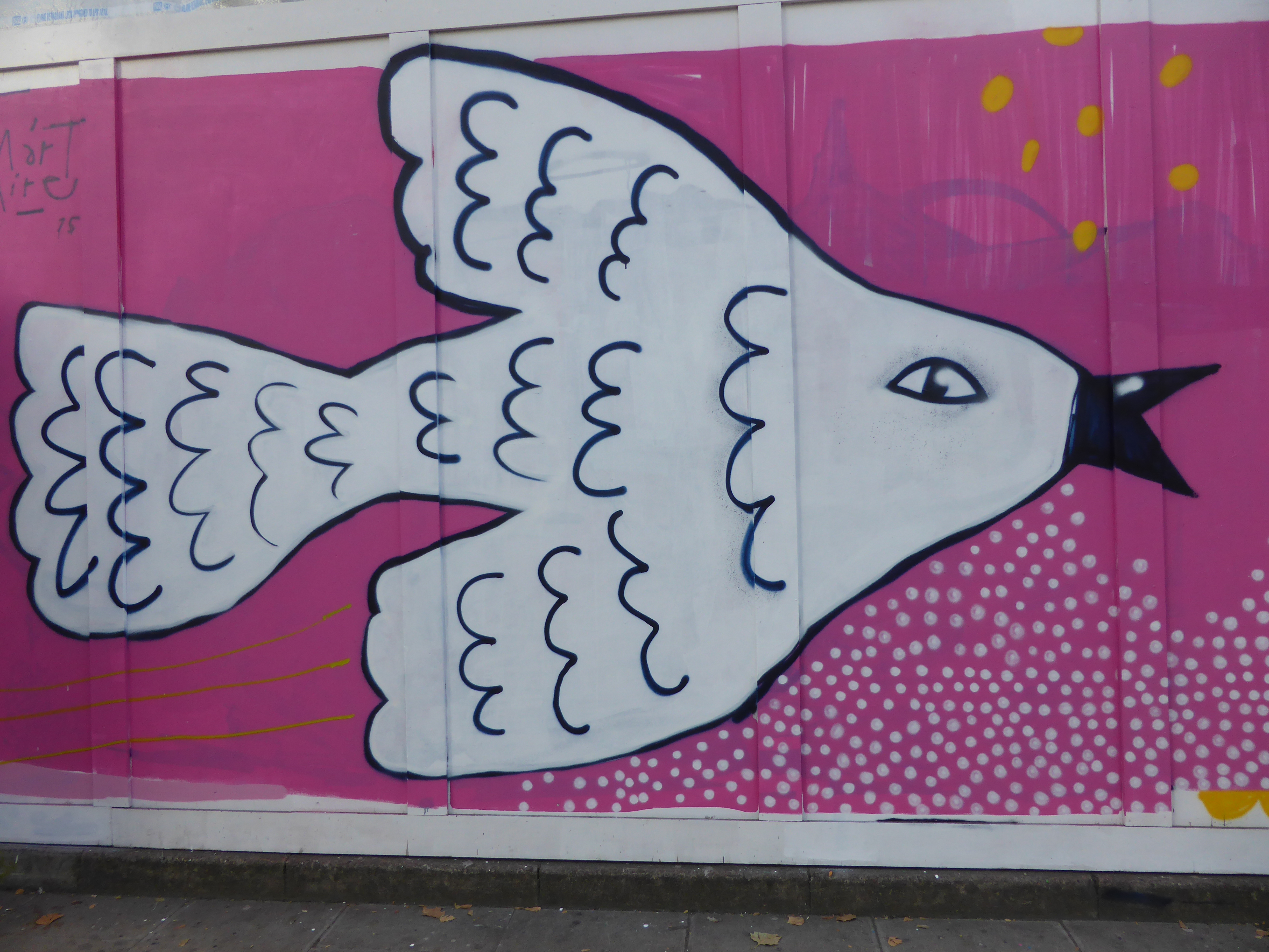 Over the last week London received a whistle-stop visit from Argentinian Street Artist Mart Aires, who hit up two works around London’s East End ahead of the Moniker Art Fair. This marks the second visit from Mart Aires to London this year with a visit to Camden Town in July, which saw him complete two works, one solo and one collaboration with Onesto (covered here). This pair of works in his distinctive minimalist, colourful and loose styling are very typical of Mart Aire’s style, promoting a sense of fun and playfulness in the process. This trip was organised with support from Pigment who works to take South American Street Artists around the world, sharing their talent, something we admire and are grateful for the Latin American artists he has thus far brought to London this year alone.