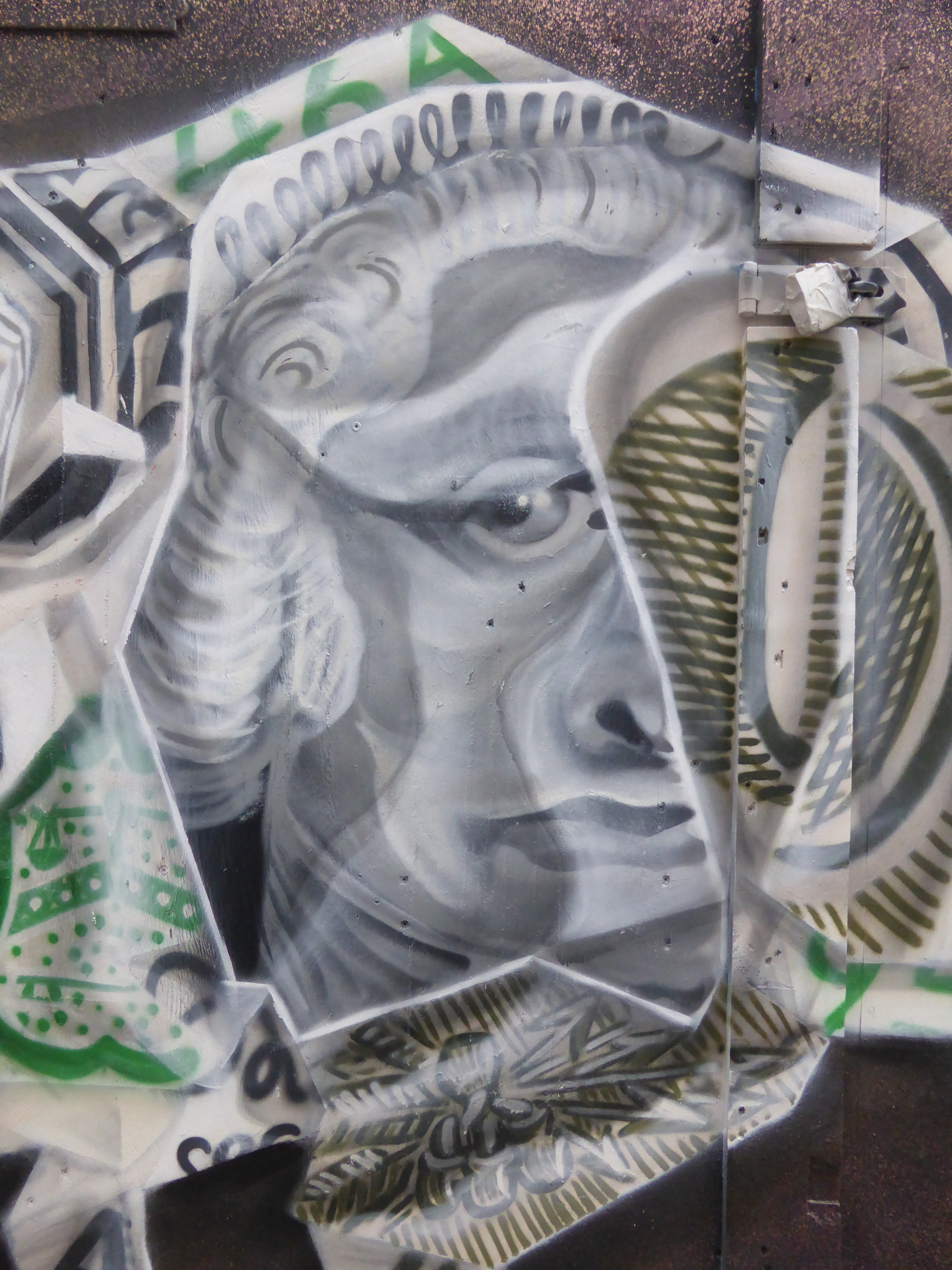 It’s been a month since we last caught Airborne Mark at work, at that point in Camden Town (covered here) and since then Mark has been working on some new concepts and twists to his trademark Origami creations. Following on from a collaboration with Irony placed up in Camden Town at the very beginning of the year which depicted a series of three piranhas, each progressively larger and each setting to devour the previous piranha, with the smallest piranha representing £5, the middle one being £20 and the alpha predator being £50. So for this work we have an Origami Buffalo created from a folded $1 bill. The effect provides an interesting contrast to Airborne Mark’s regular creations, which we very much enjoy, but it is always nice to see an artist expand on their repertoire. The all round effect is intriguing and certainly an apt choice for his subject of choice, the buffalo really appears to be leaping out of the hoarding on which it is placed.