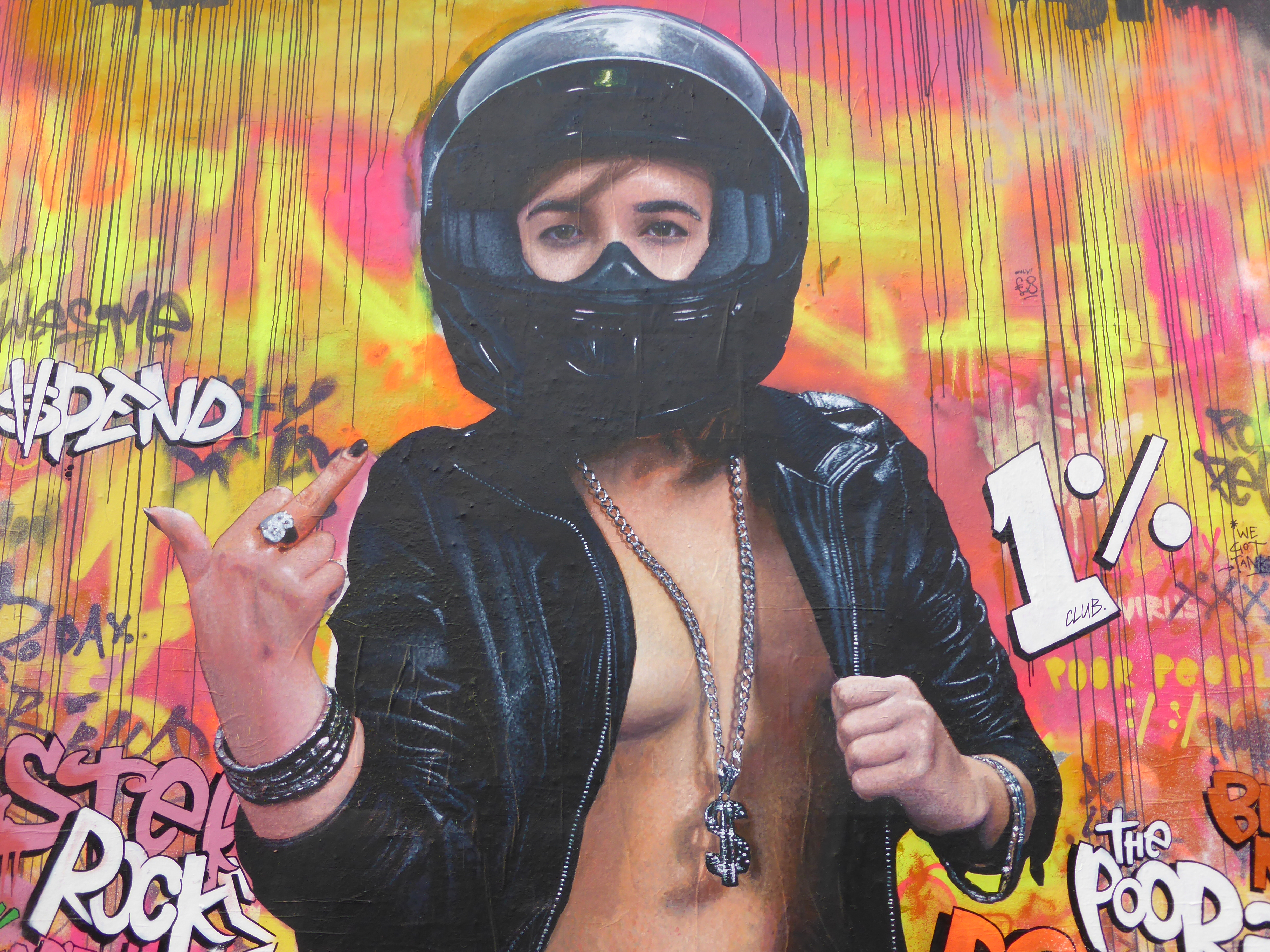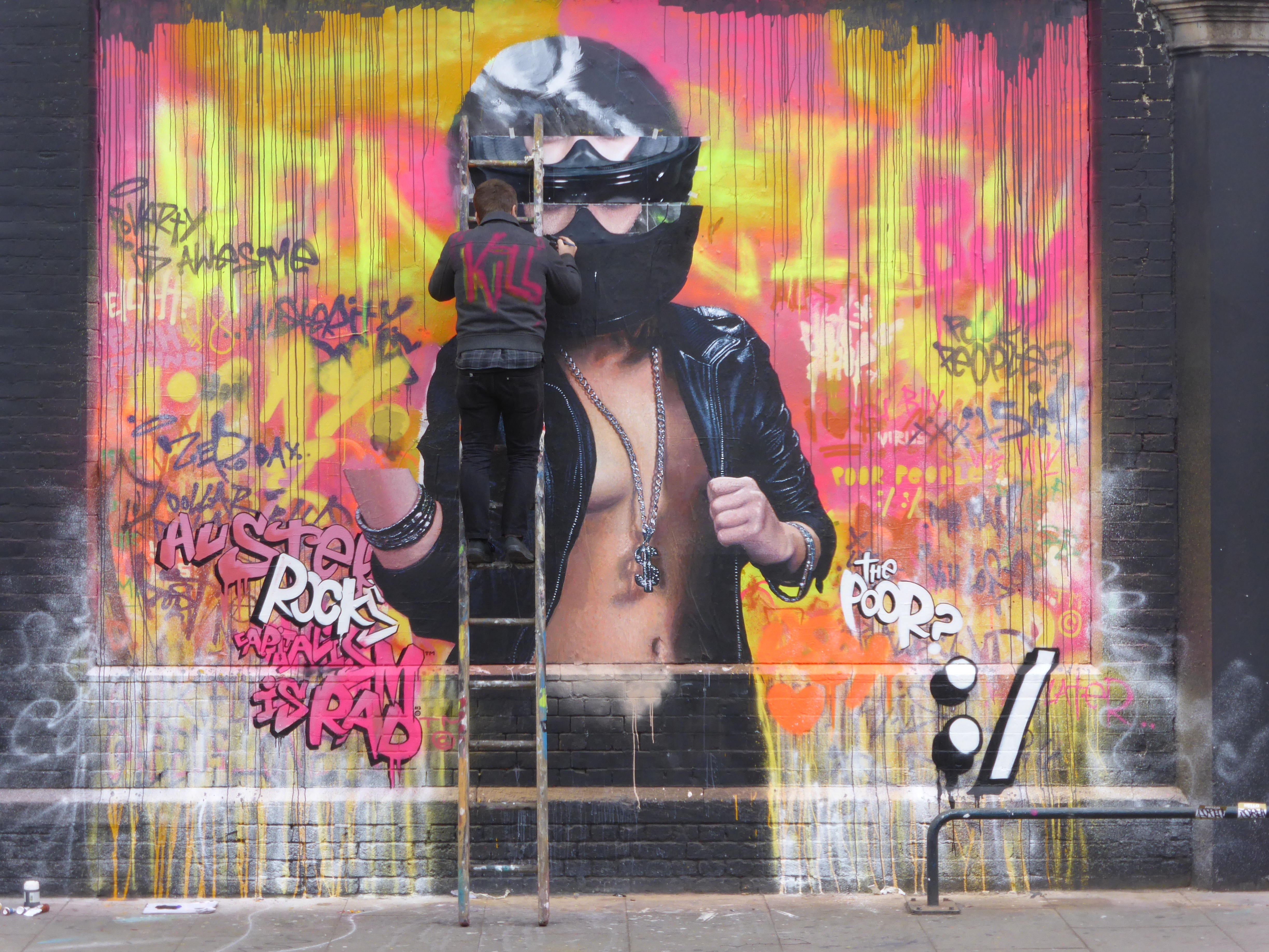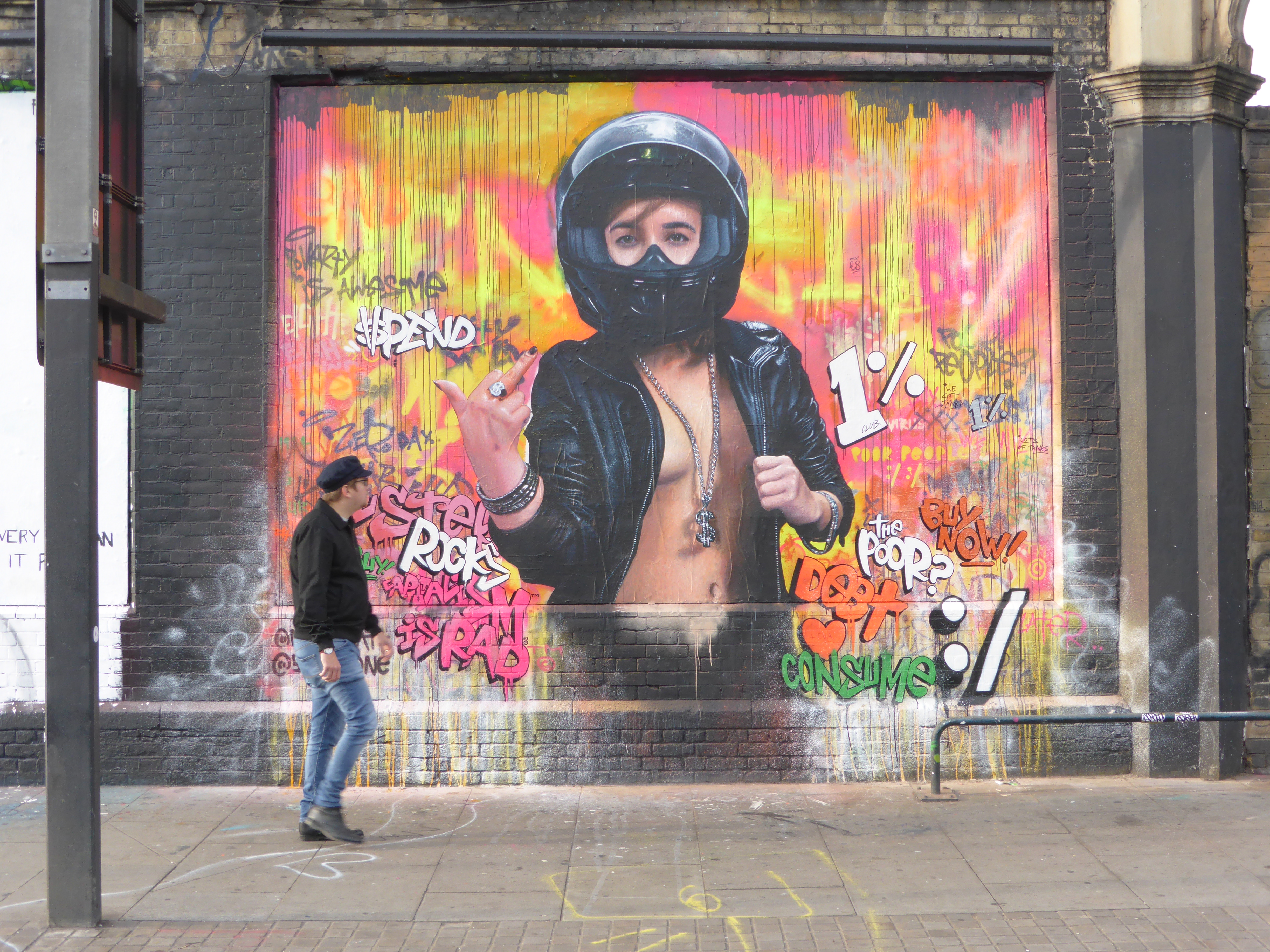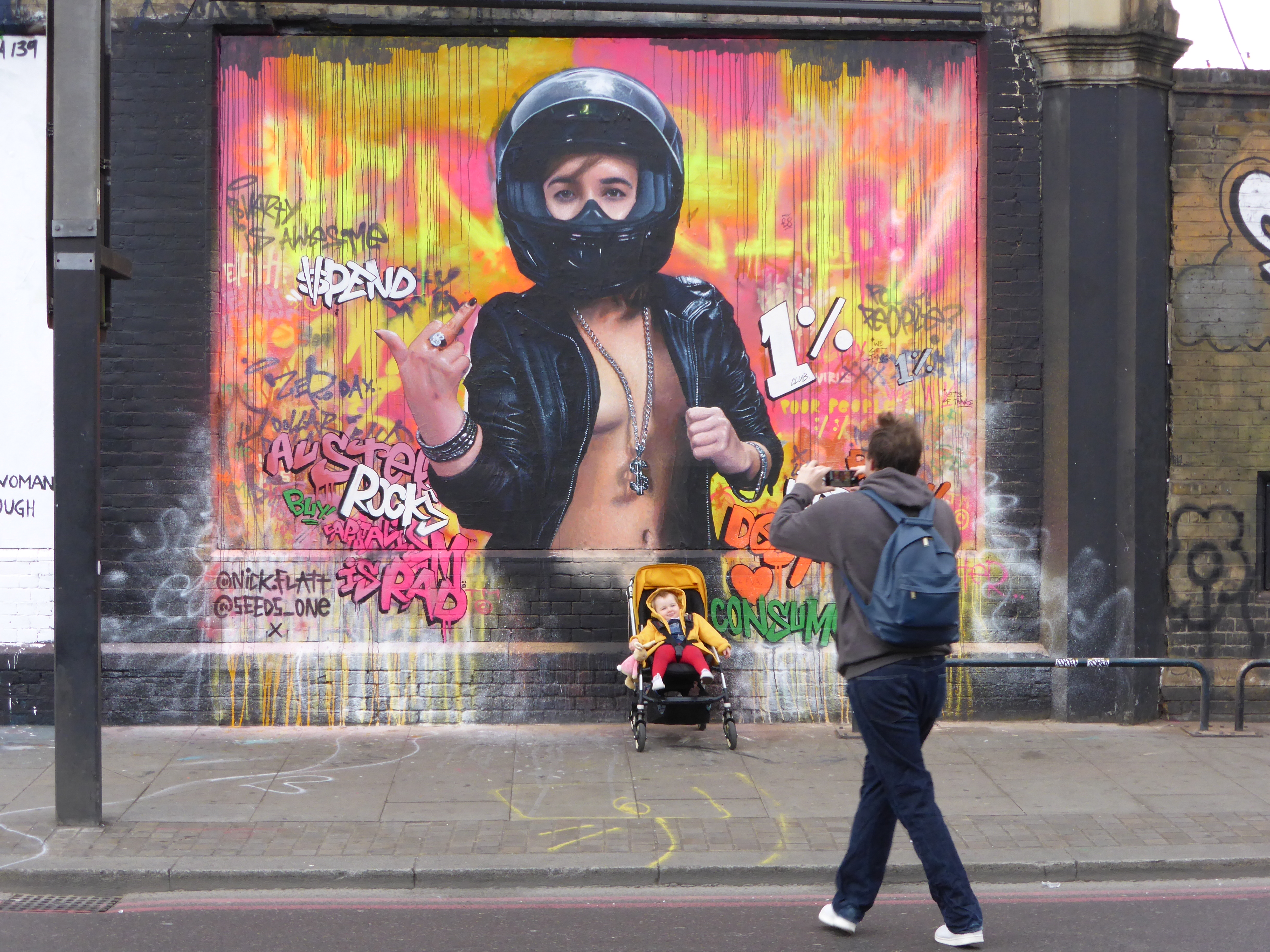 This piece which takes a look at the consumer culture we live in is entitled ‘Capitalism Is Rad™’ and was set to make a statement against gentrification and the financial gap in society, and is encapsulated by Nick’s central character who represents that glamorous all-powerful 1% who control the world’s wealth and just really doesn’t care, nothing will stand in her way, epitomized by the action of offering the finger to all in her path. Whilst Seeds’ accompanying text portrays the underlying narcissistic thoughts and attitude of this elitist force, feeling that people should buy more, get in debt, aspire to be better and frankly just consume and accept their fate, in order to maintain the status quo. For the wealthy 1% ‘Austerity Rocks©’, a choice of language designed to highlight such practices as the appropriation of terminology and cultural practices for their own use.