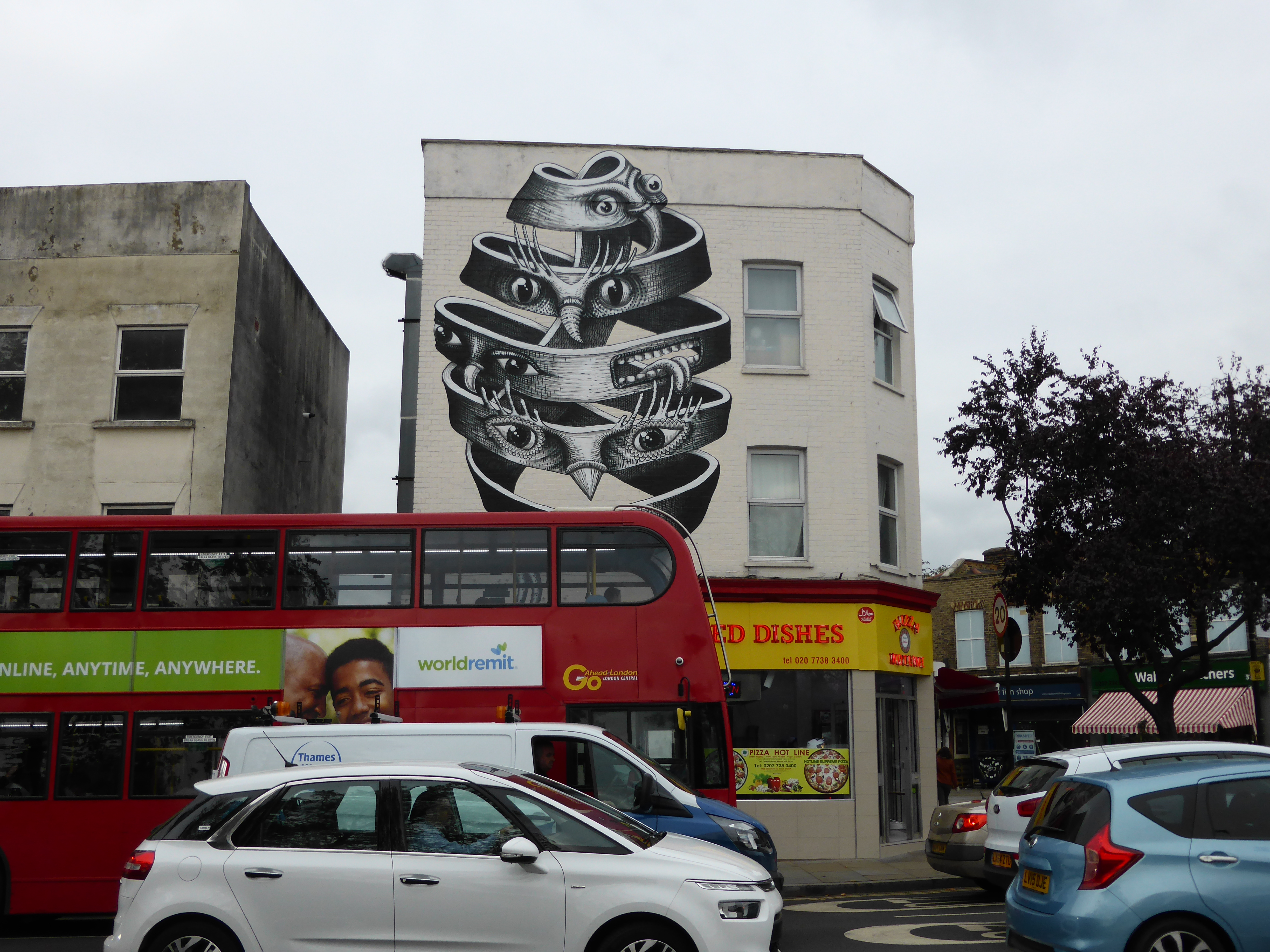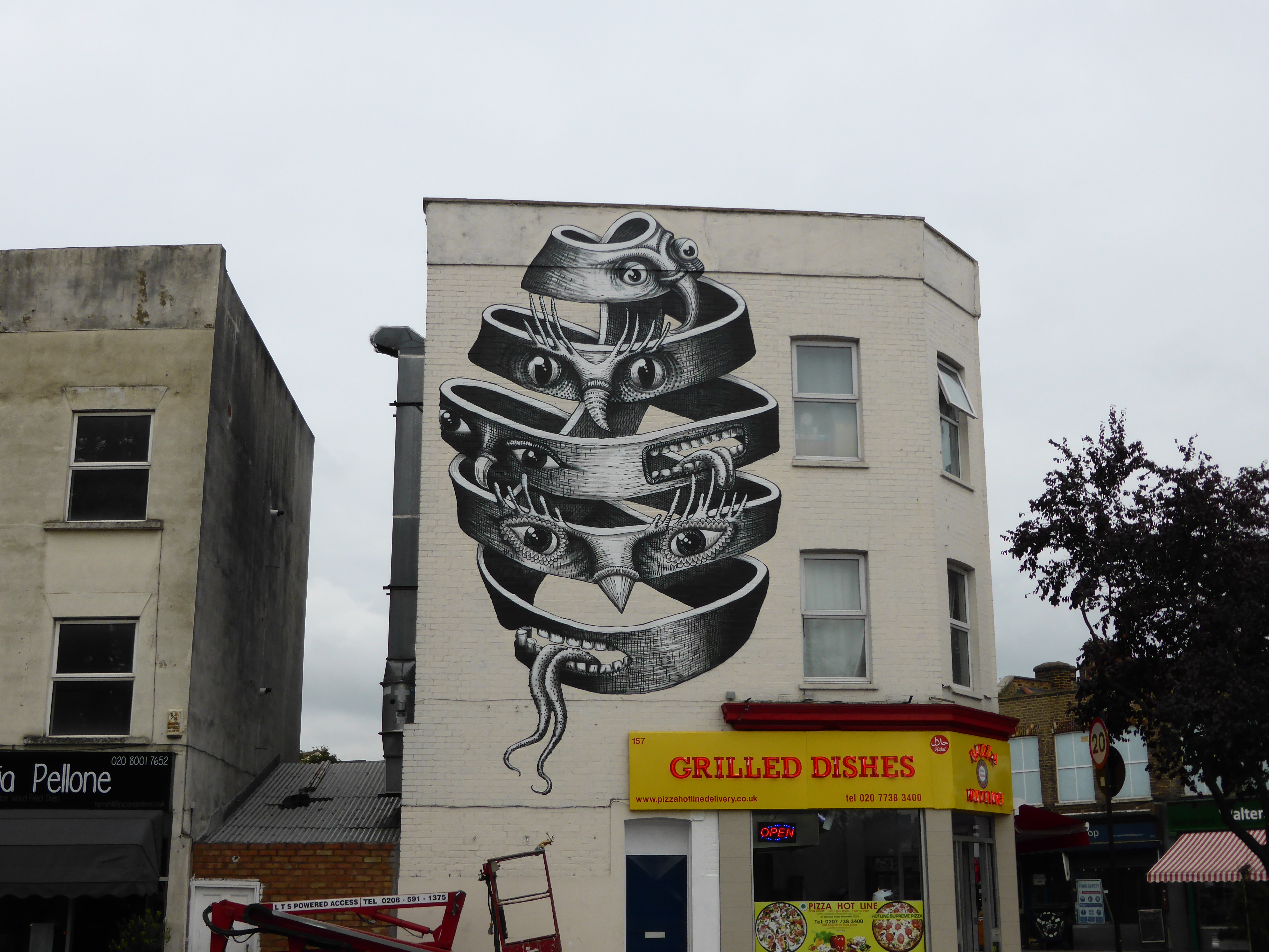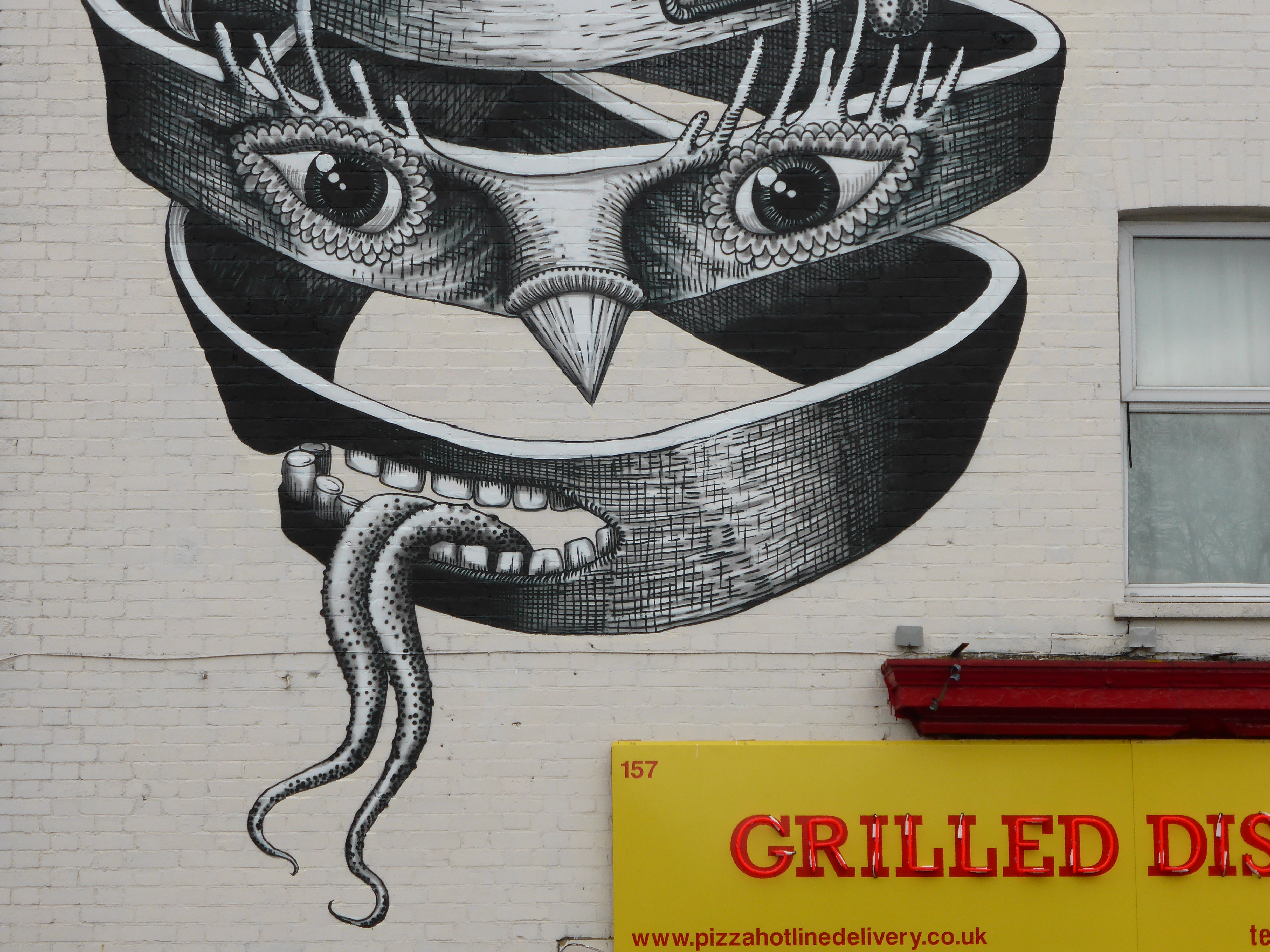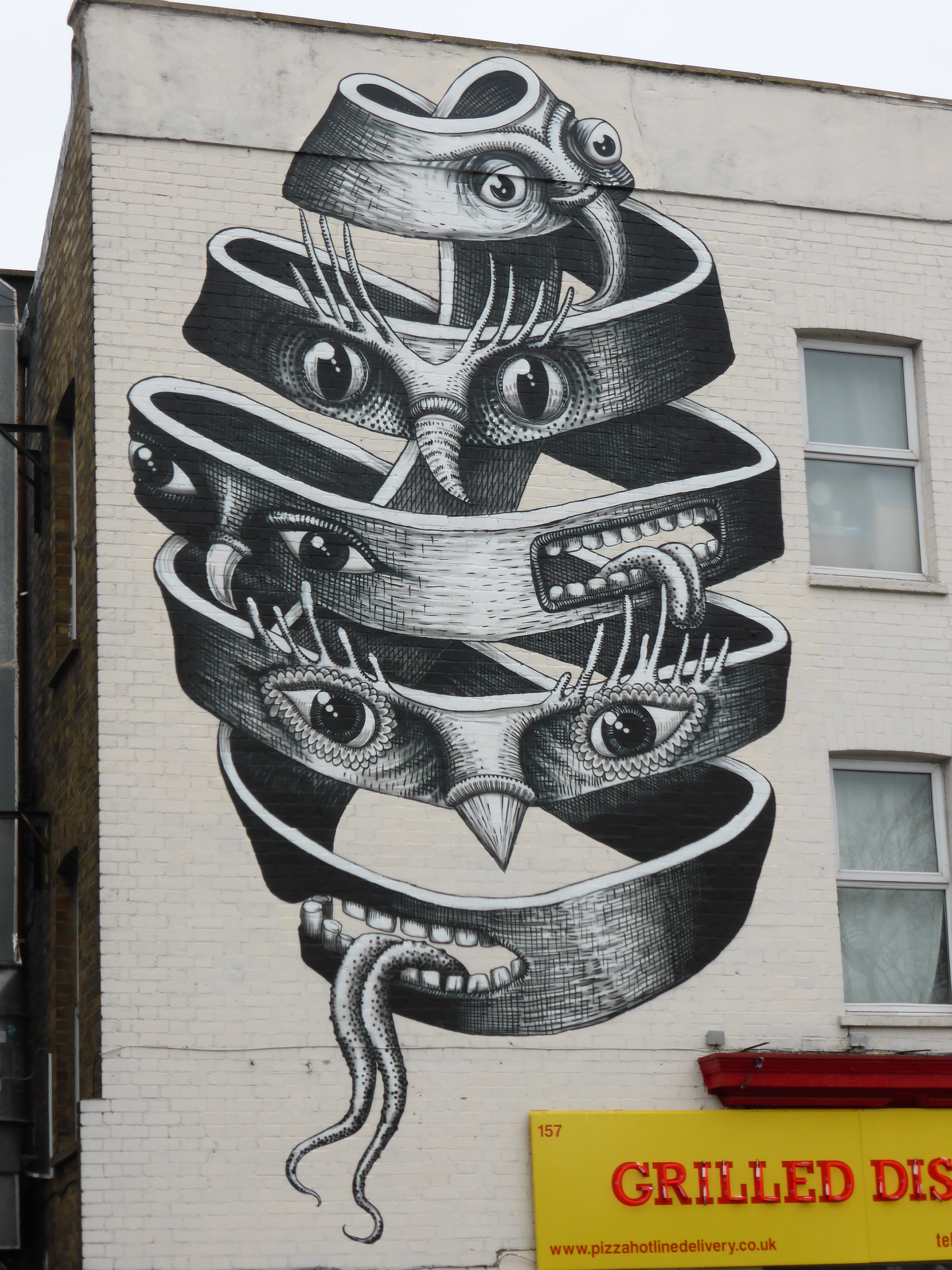 This work which is very much fundamentally Phlegm in appearance is inspired by an M.C. Esher lithograph entitled ‘Bond of Union’, who is currently the subject of the latest feature exhibition at the Dulwich Picture Gallery. M.C. Esher is a Dutch graphic designer most famous for his so-called impossible constructions, for example presenting scenes depicting ascending and descending relativity and explorations of concepts of infinity through architecture. These scenes of impossible senses of reality make Phlegm the perfect choice for such a tribute driven scene as his works depict Gothic characters who generally inhabit scenarios between the Dark Ages and the Age of Enlightenment and are often engaging in thankless tasks and striving for scientific advancements and technological breakthroughs in his own slightly surreal way. This impressive work can be found along Dulwich Road, just next to Herne Hill train station.