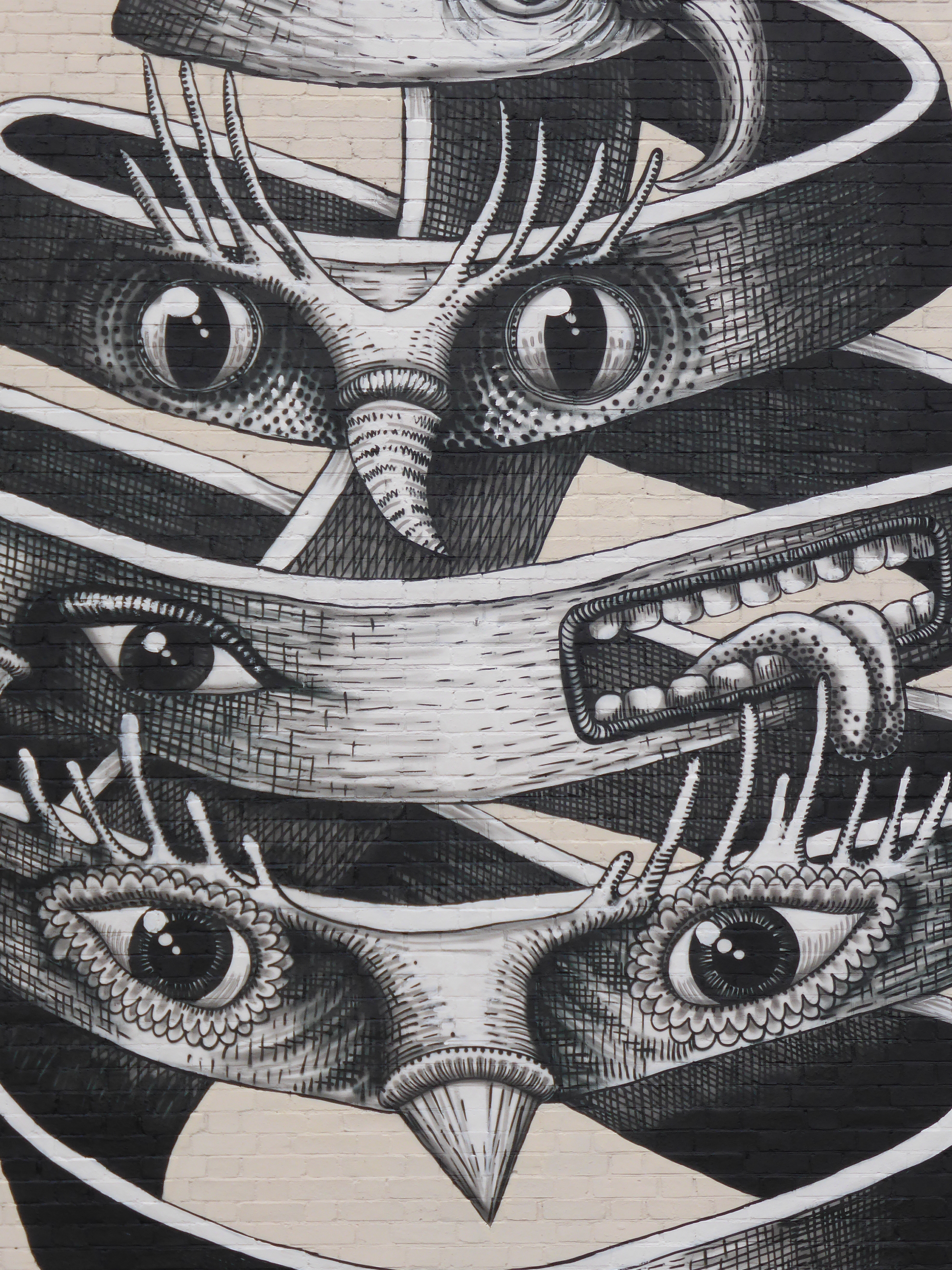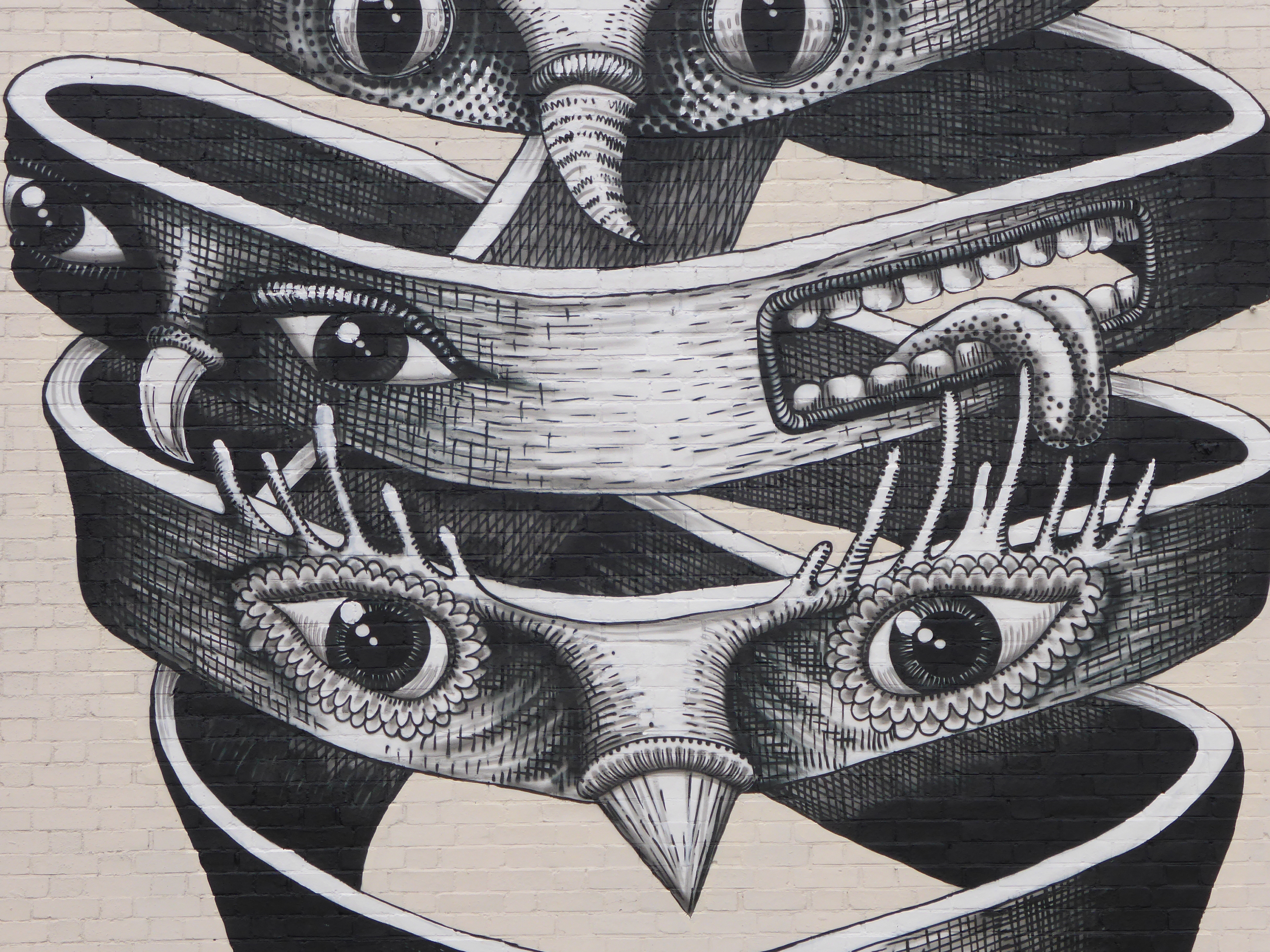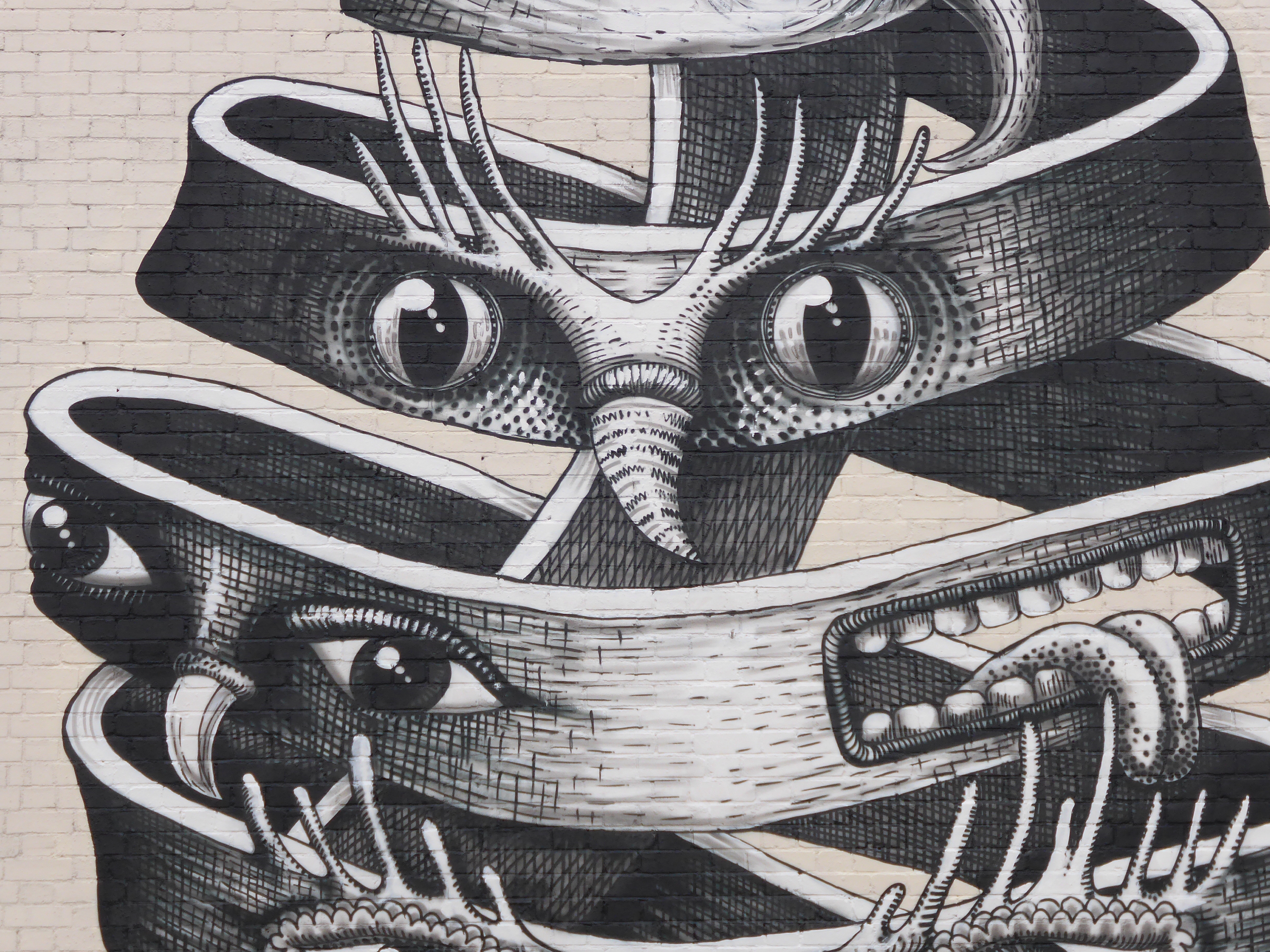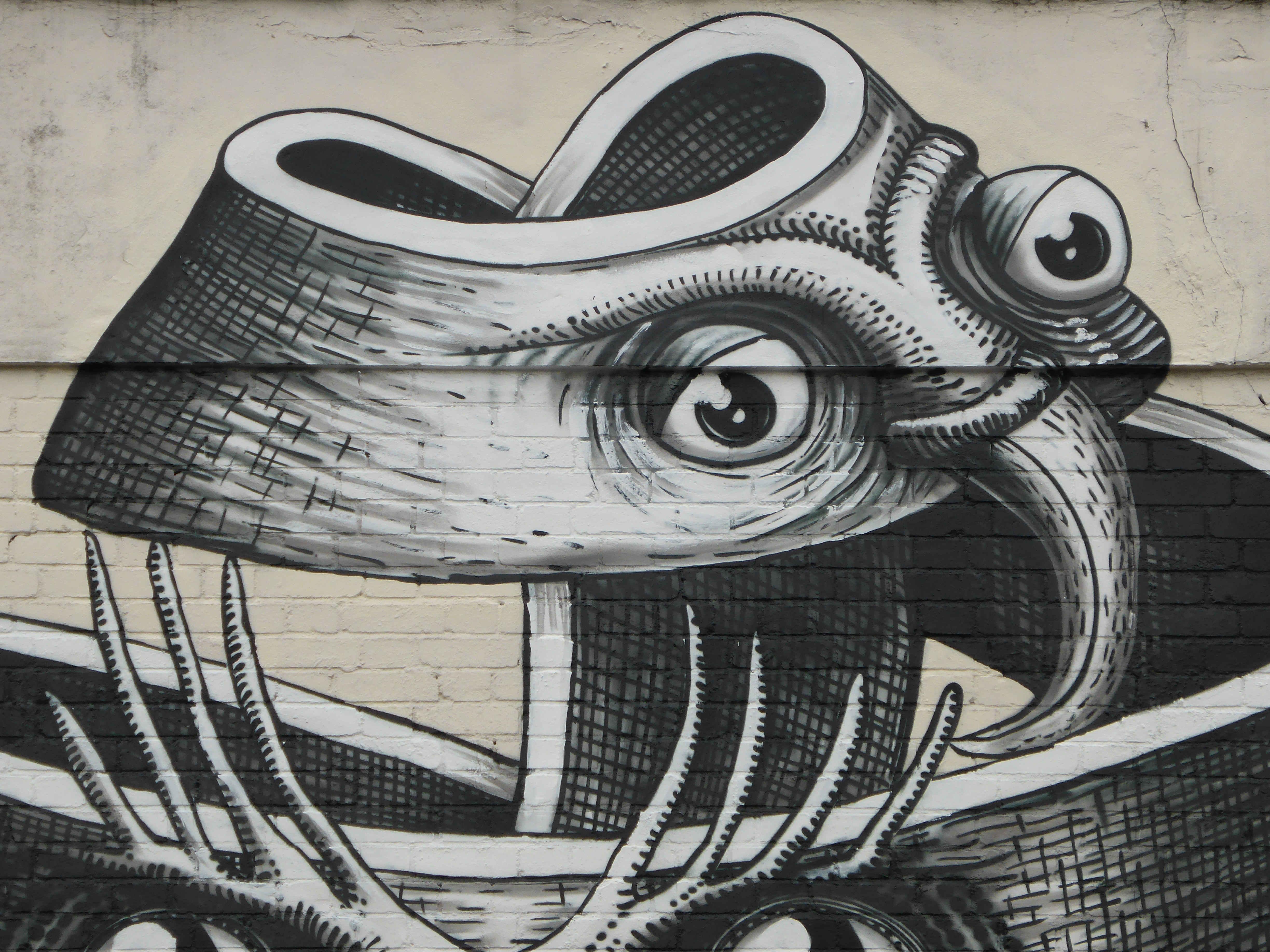 This work which is very much fundamentally Phlegm in appearance is inspired by an M.C. Esher lithograph entitled ‘Bond of Union’, who is currently the subject of the latest feature exhibition at the Dulwich Picture Gallery. M.C. Esher is a Dutch graphic designer most famous for his so-called impossible constructions, for example presenting scenes depicting ascending and descending relativity and explorations of concepts of infinity through architecture. These scenes of impossible senses of reality make Phlegm the perfect choice for such a tribute driven scene as his works depict Gothic characters who generally inhabit scenarios between the Dark Ages and the Age of Enlightenment and are often engaging in thankless tasks and striving for scientific advancements and technological breakthroughs in his own slightly surreal way. This impressive work can be found along Dulwich Road, just next to Herne Hill train station.