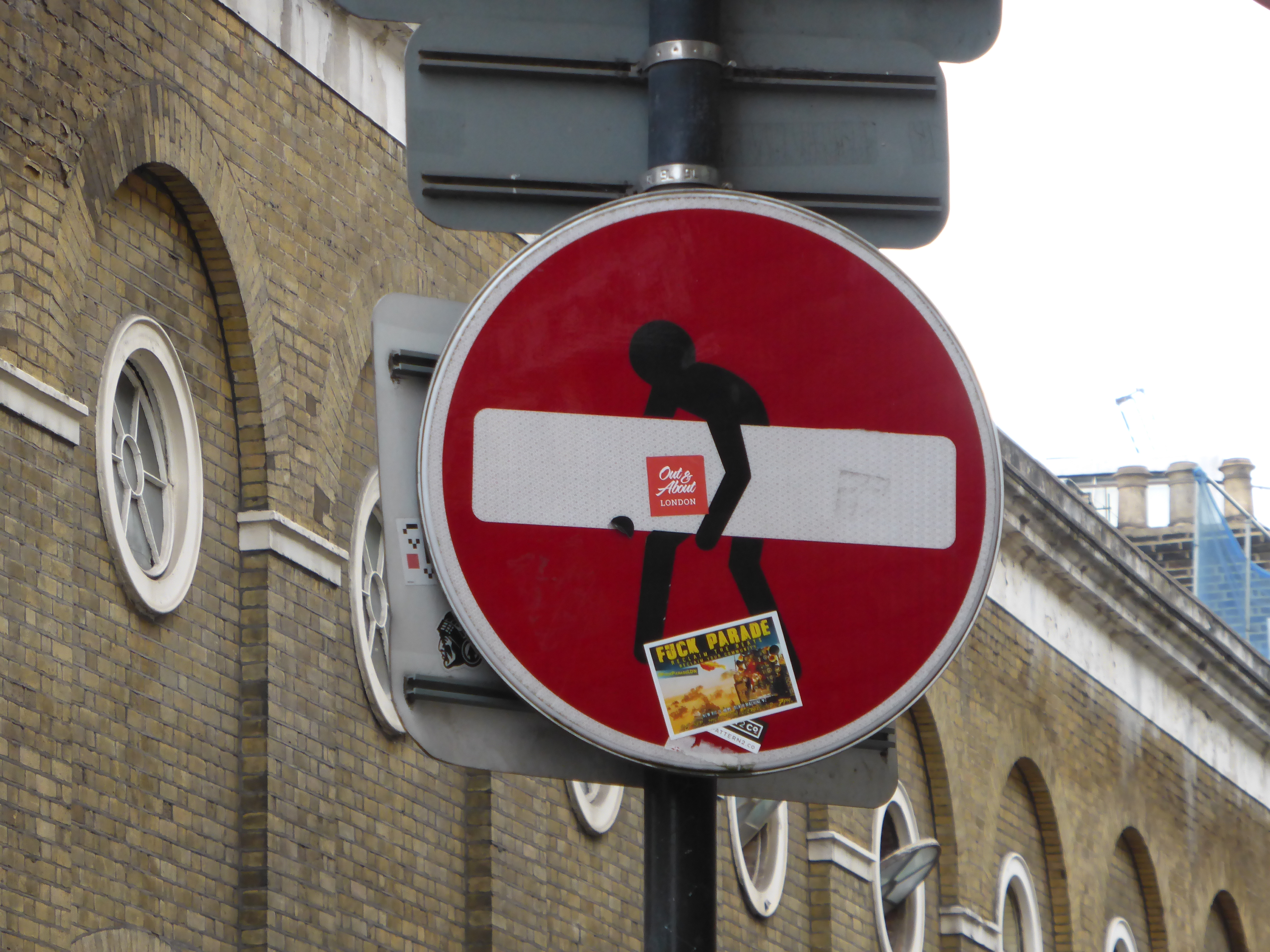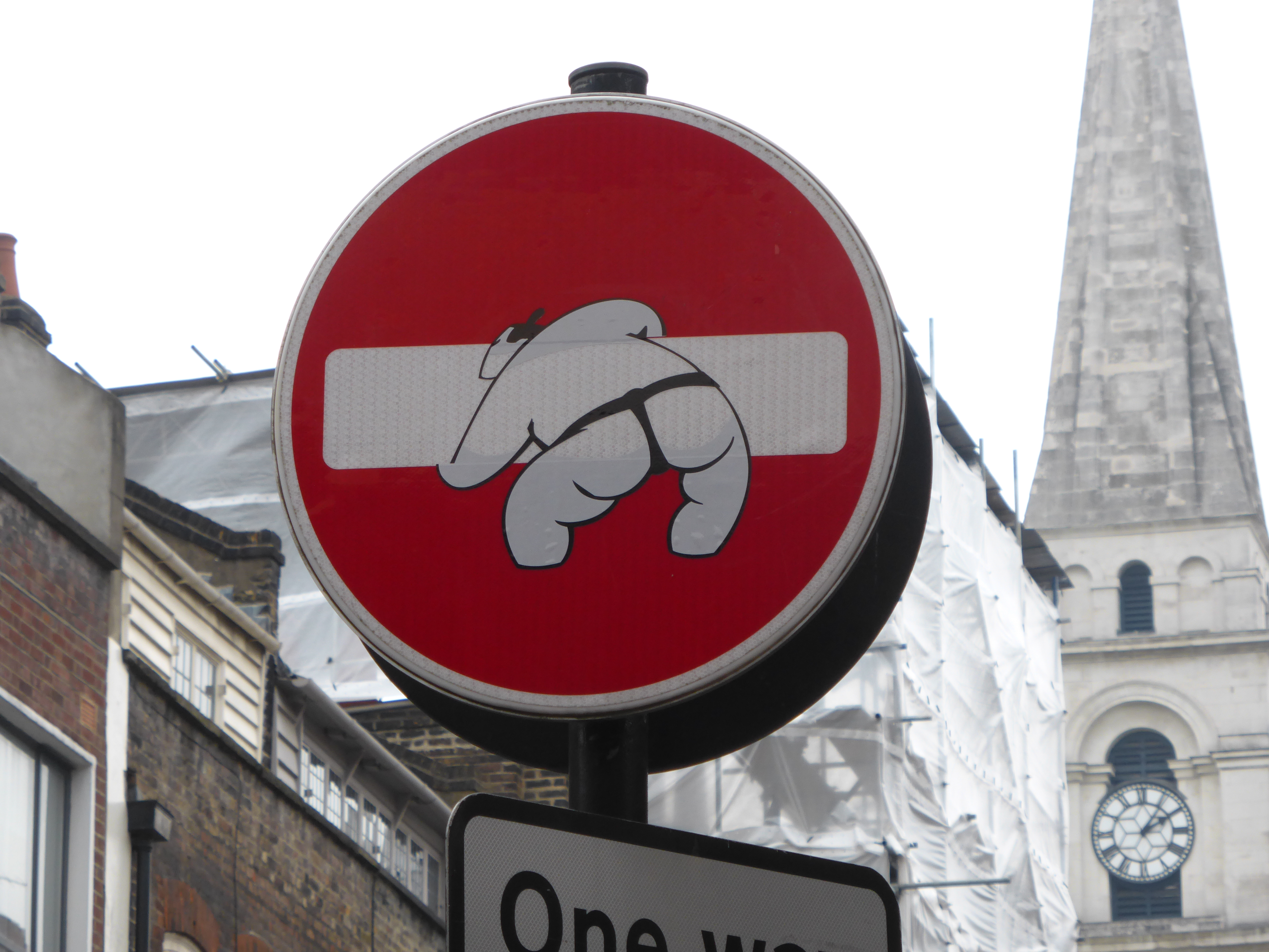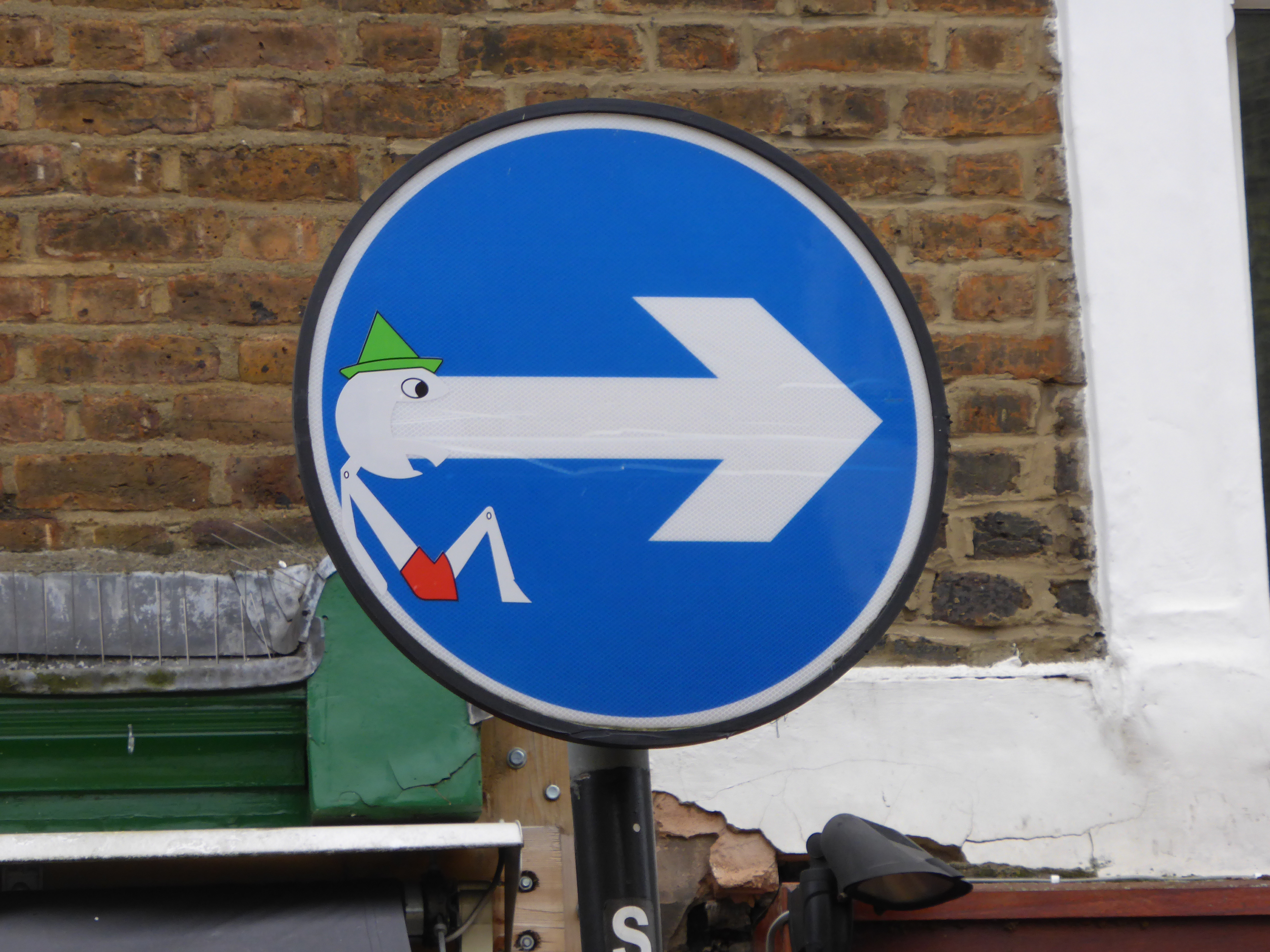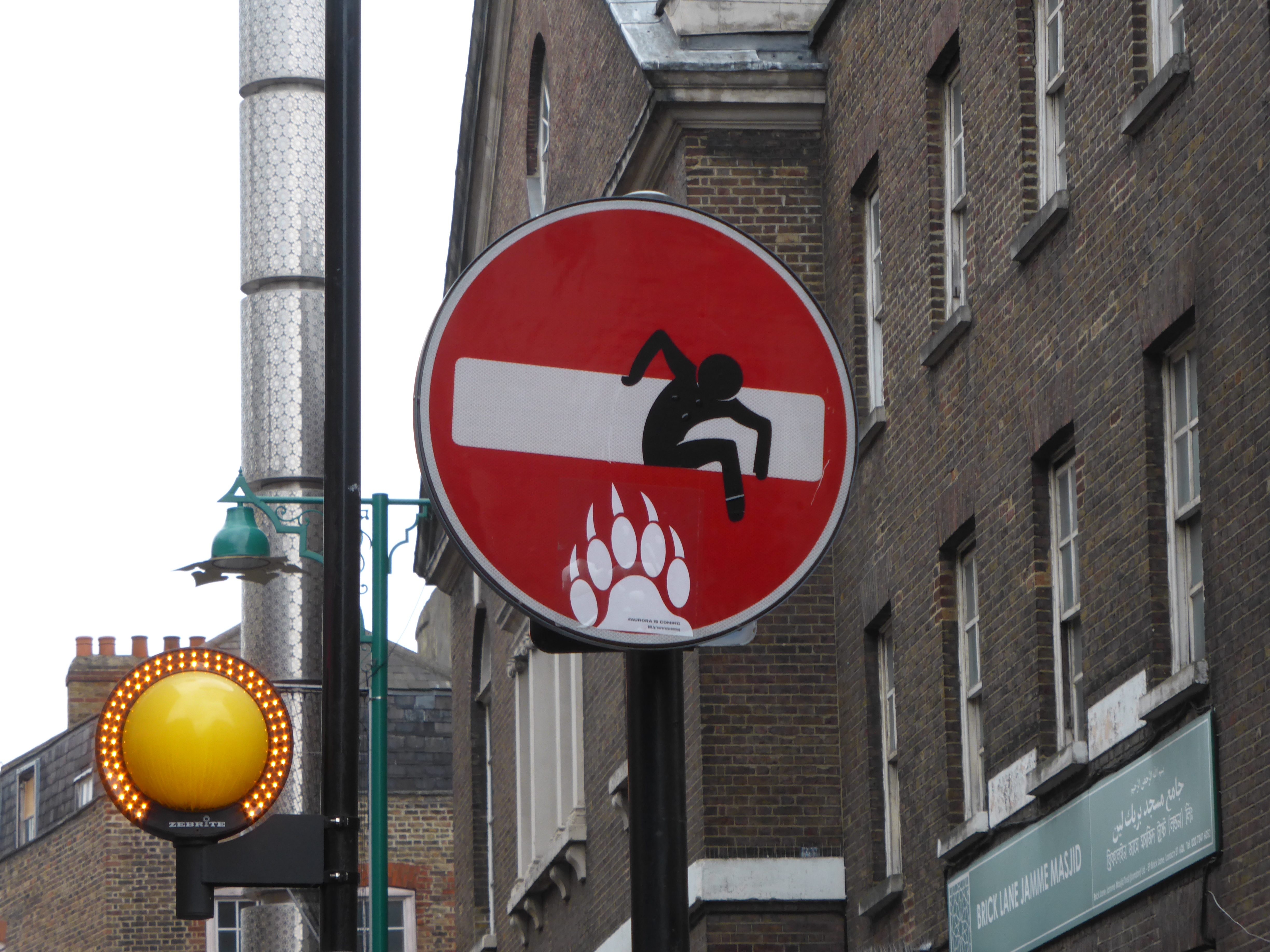Just over a week ago Street Artist Clet Abraham made his most recent visit to London whilst he was over with the Graffik Gallery who showcased his work at the Moniker Art Fair (covered here) and to present his very first UK exhibition at their own gallery (covered here). It’s been five years since Clet Abraham started his unique and humorous approach to guerilla Street Art, and four years since he first visited London. Utilizing this opportunity Clet went on a short but prolific tour of applying his unique brand of witty humour to many of London’s street signs, primarily around East London in the Brick Lane area and along Portobello Road in west London.