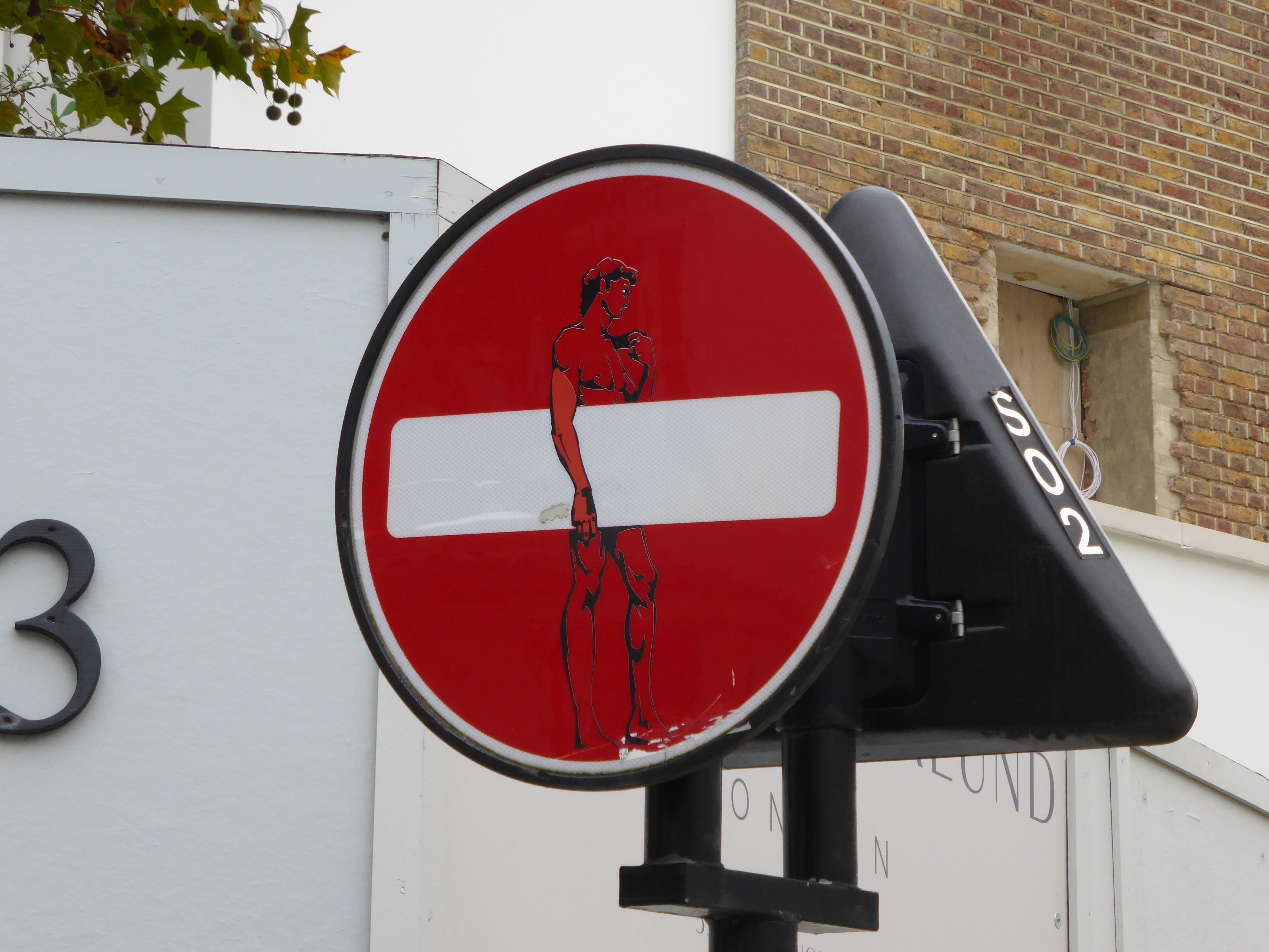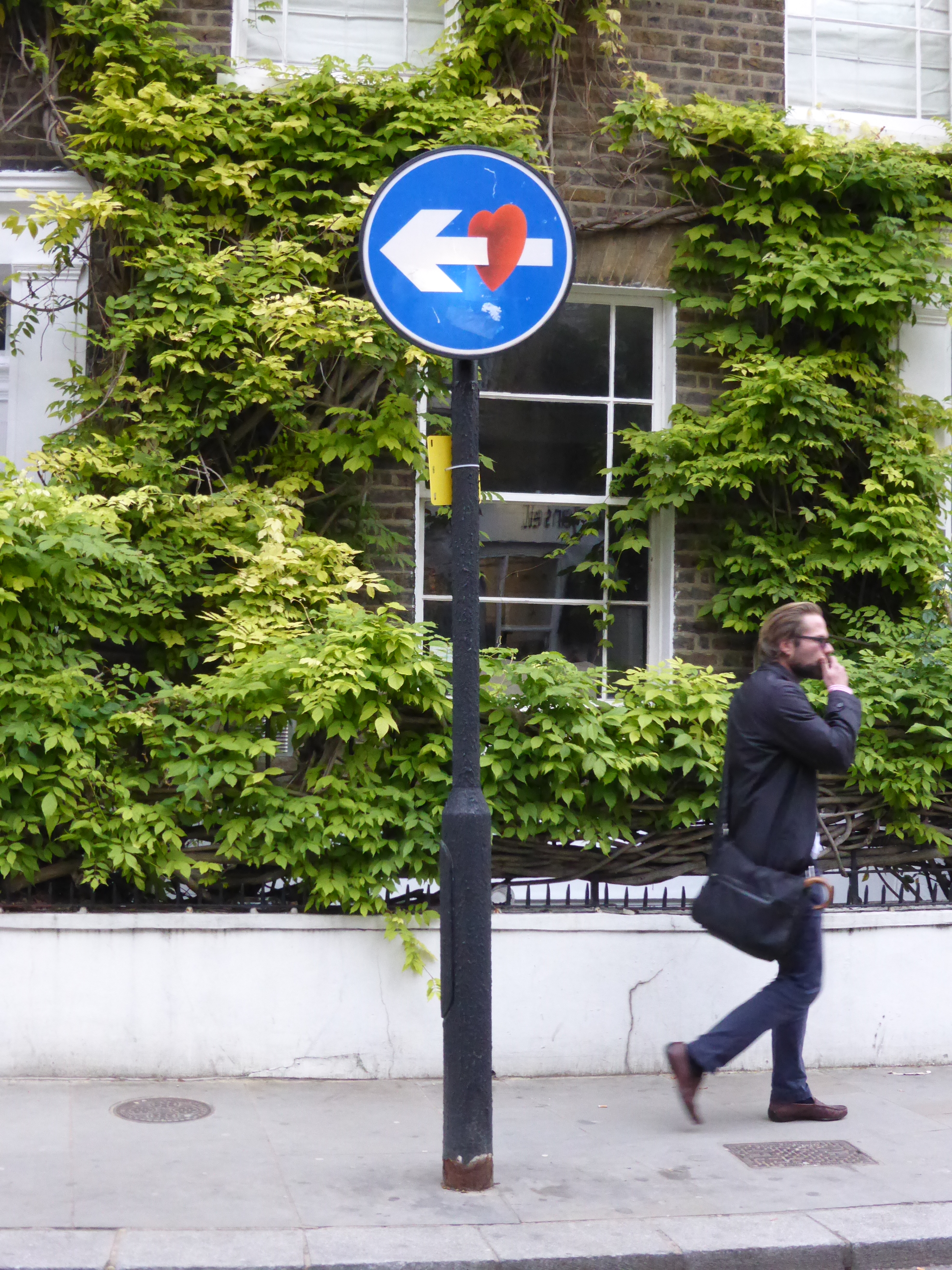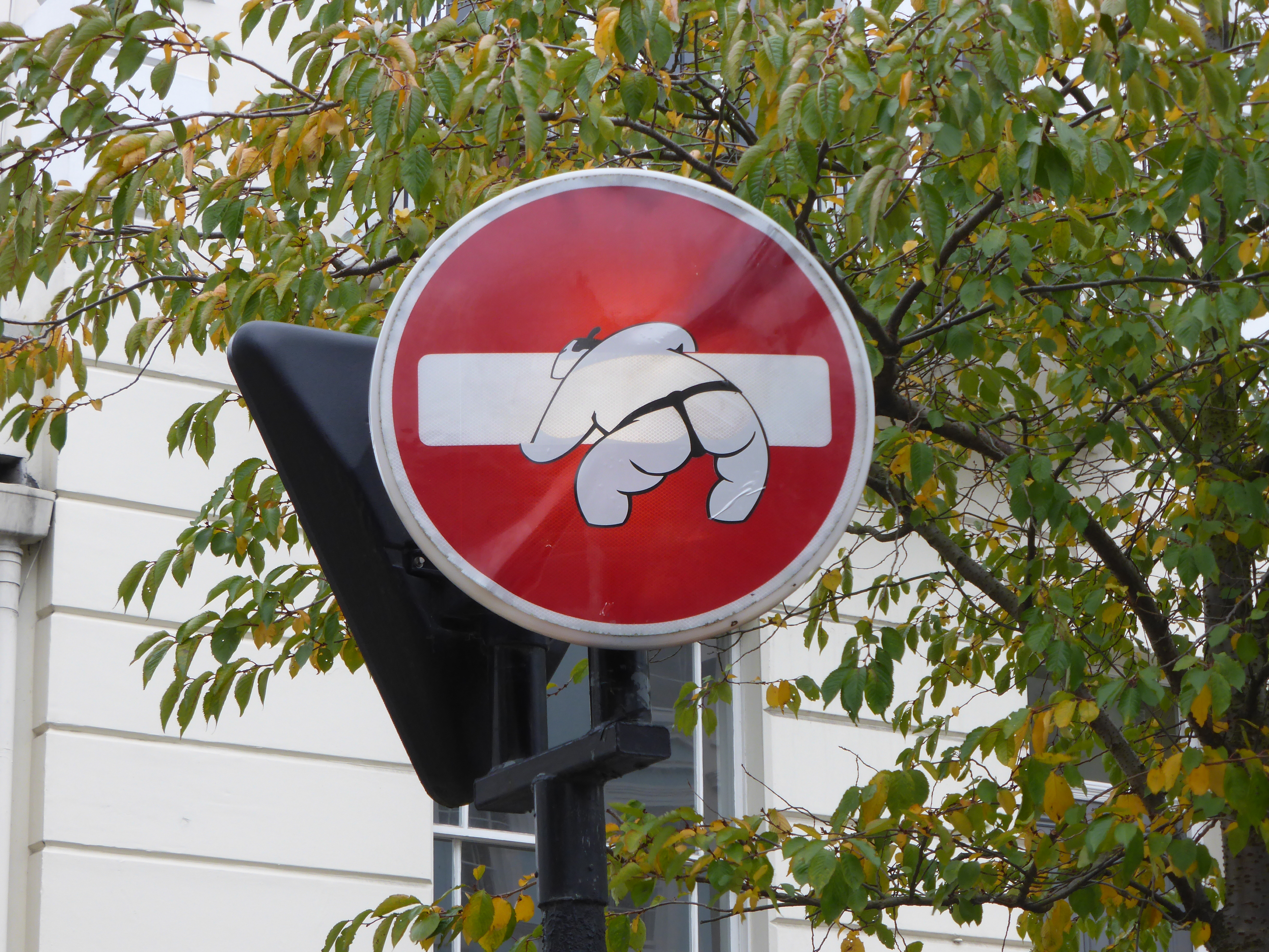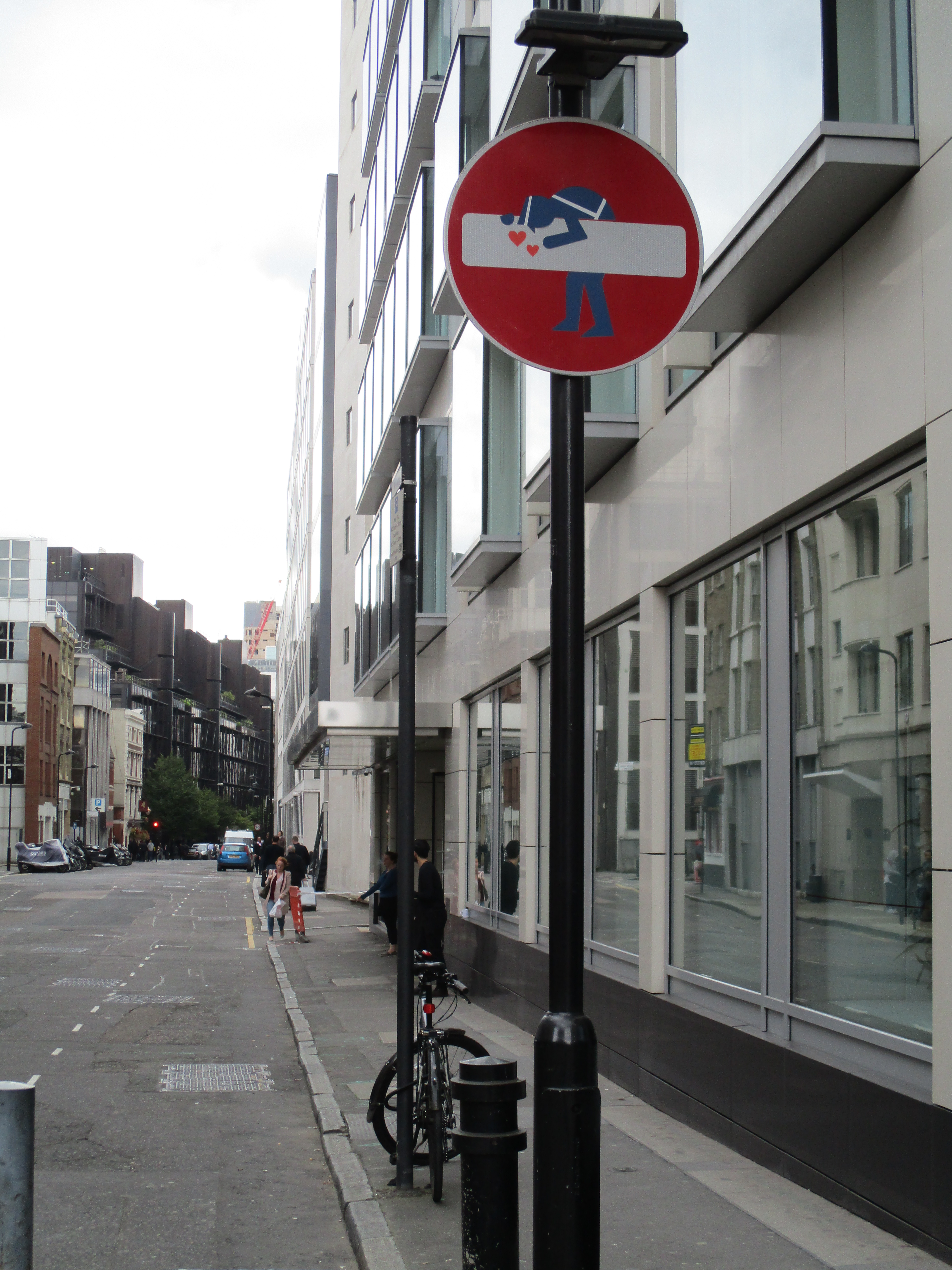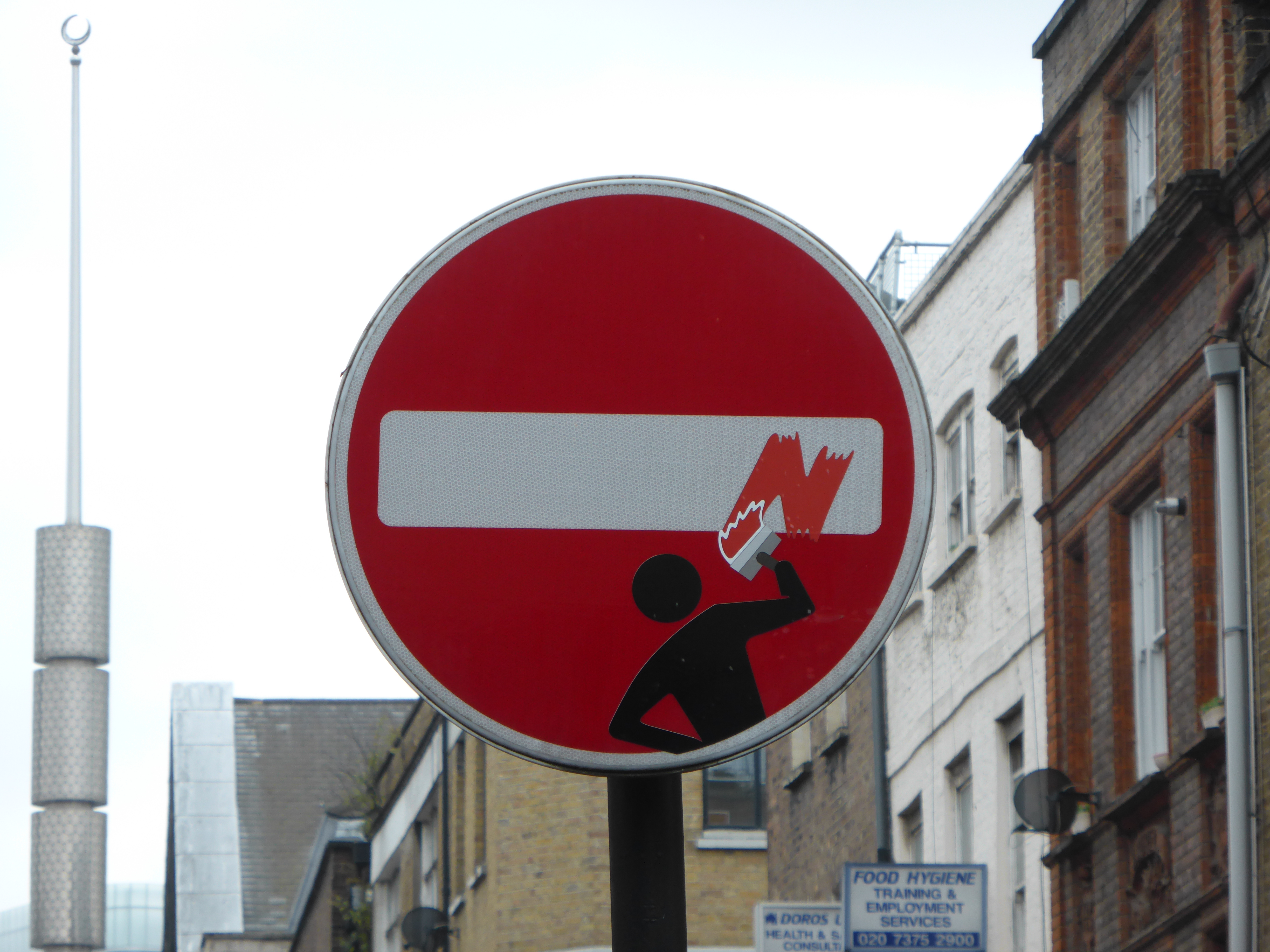 Just over a week ago Street Artist Clet Abraham made his most recent visit to London whilst he was over with the Graffik Gallery who showcased his work at the Moniker Art Fair (covered here) and to present his very first UK exhibition at their own gallery (covered here). It’s been five years since Clet Abraham started his unique and humorous approach to guerilla Street Art, and four years since he first visited London. Utilizing this opportunity Clet went on a short but prolific tour of applying his unique brand of witty humour to many of London’s street signs, primarily around East London in the Brick Lane area and along Portobello Road in west London.
