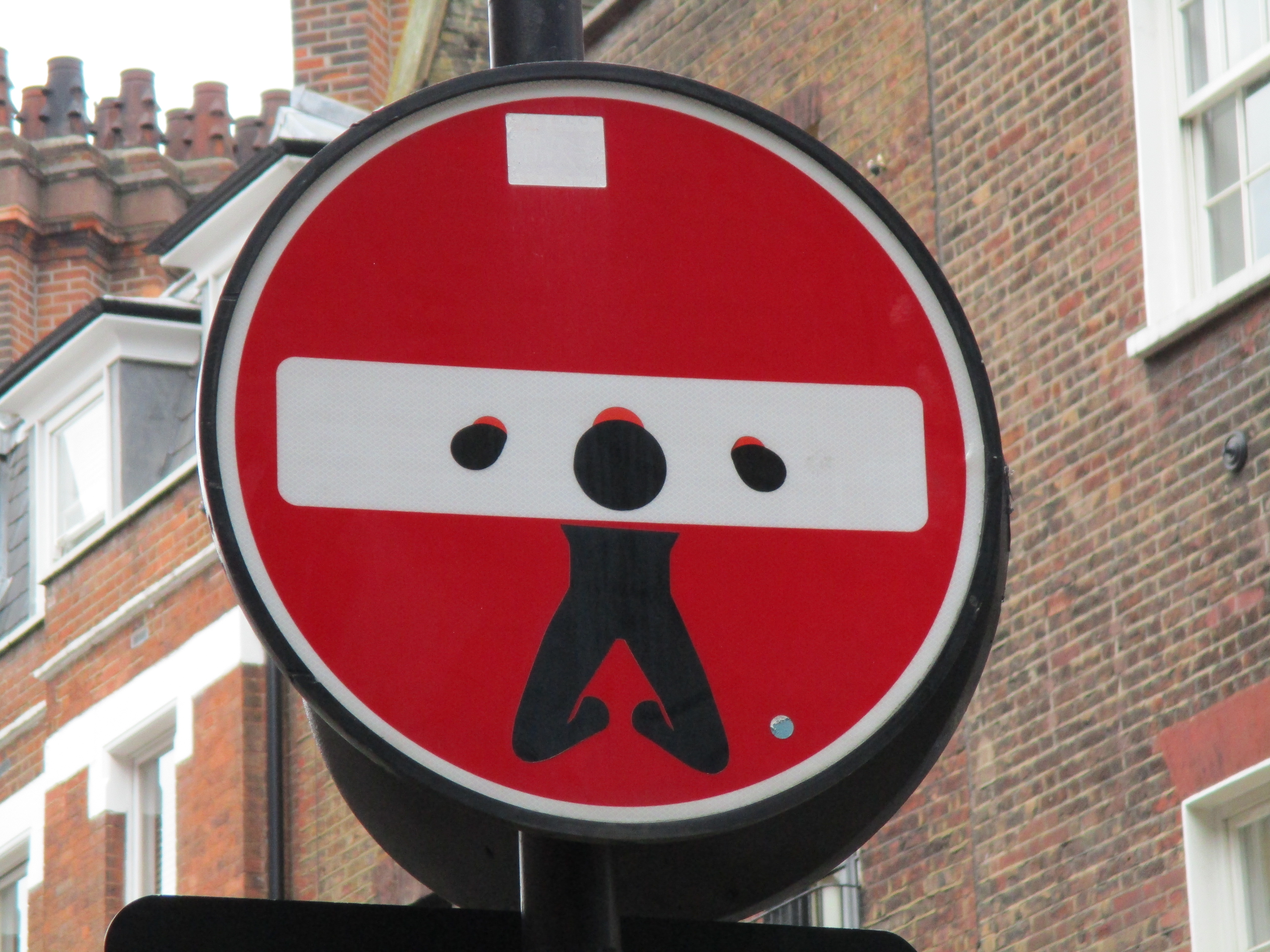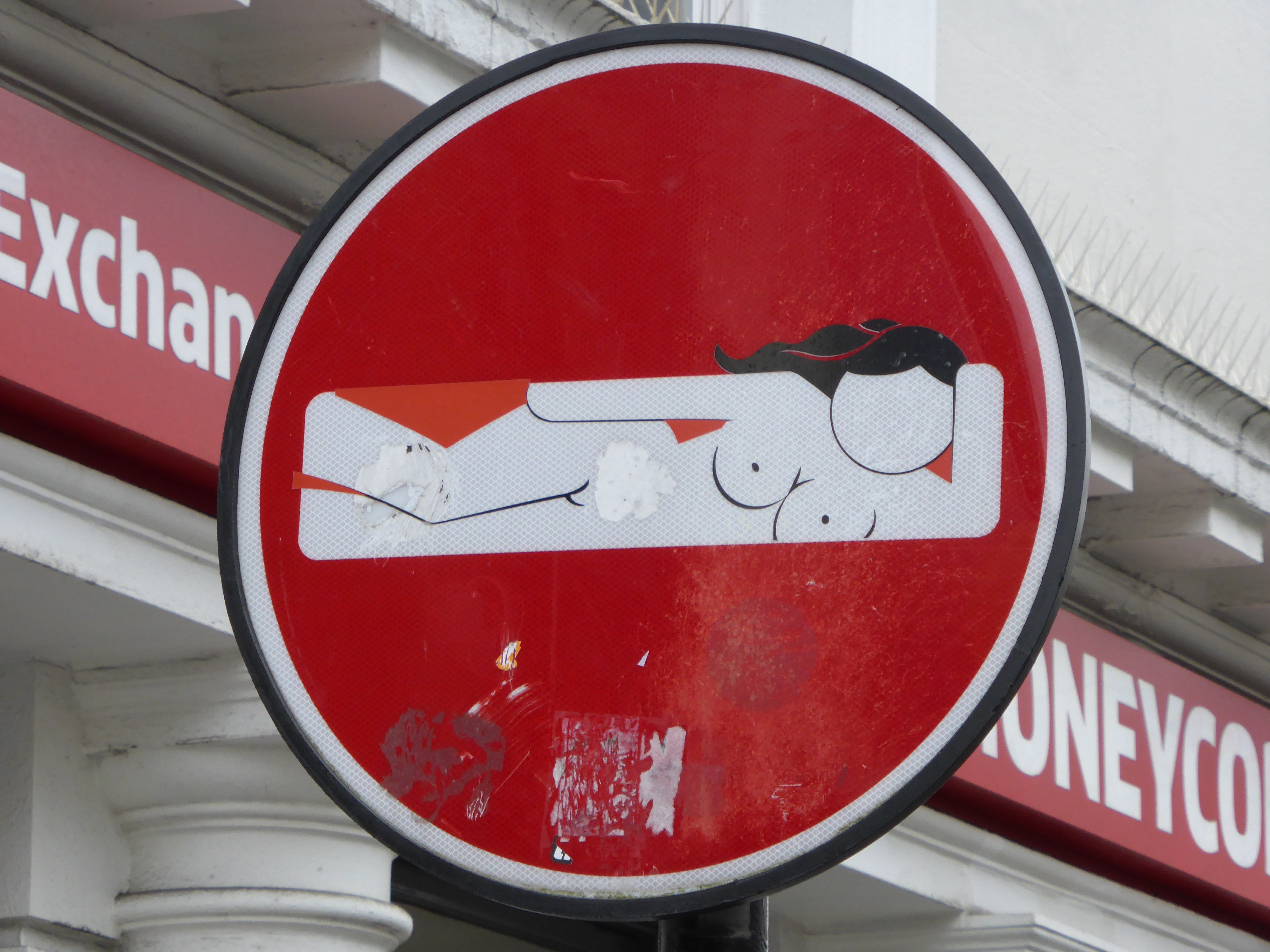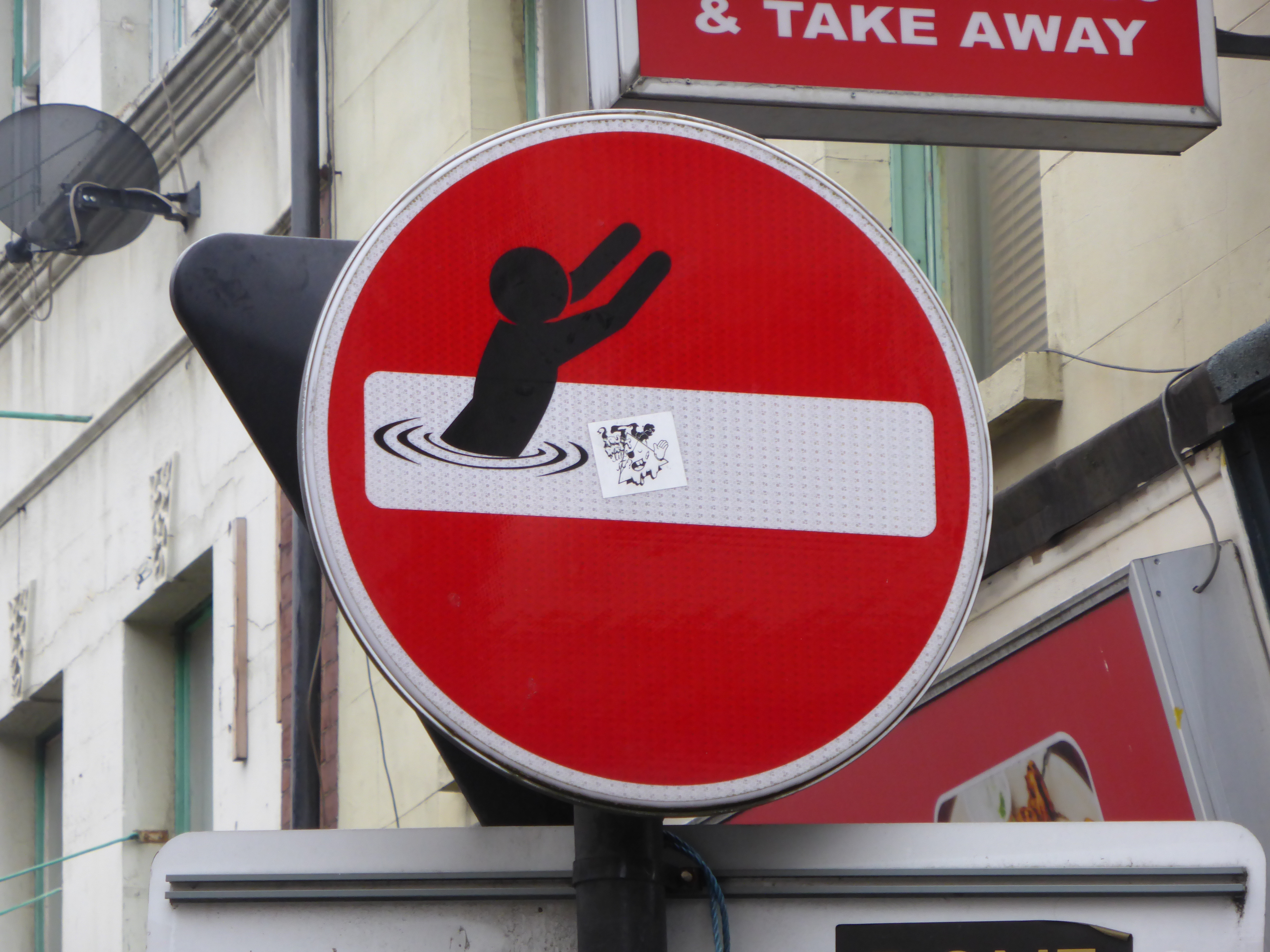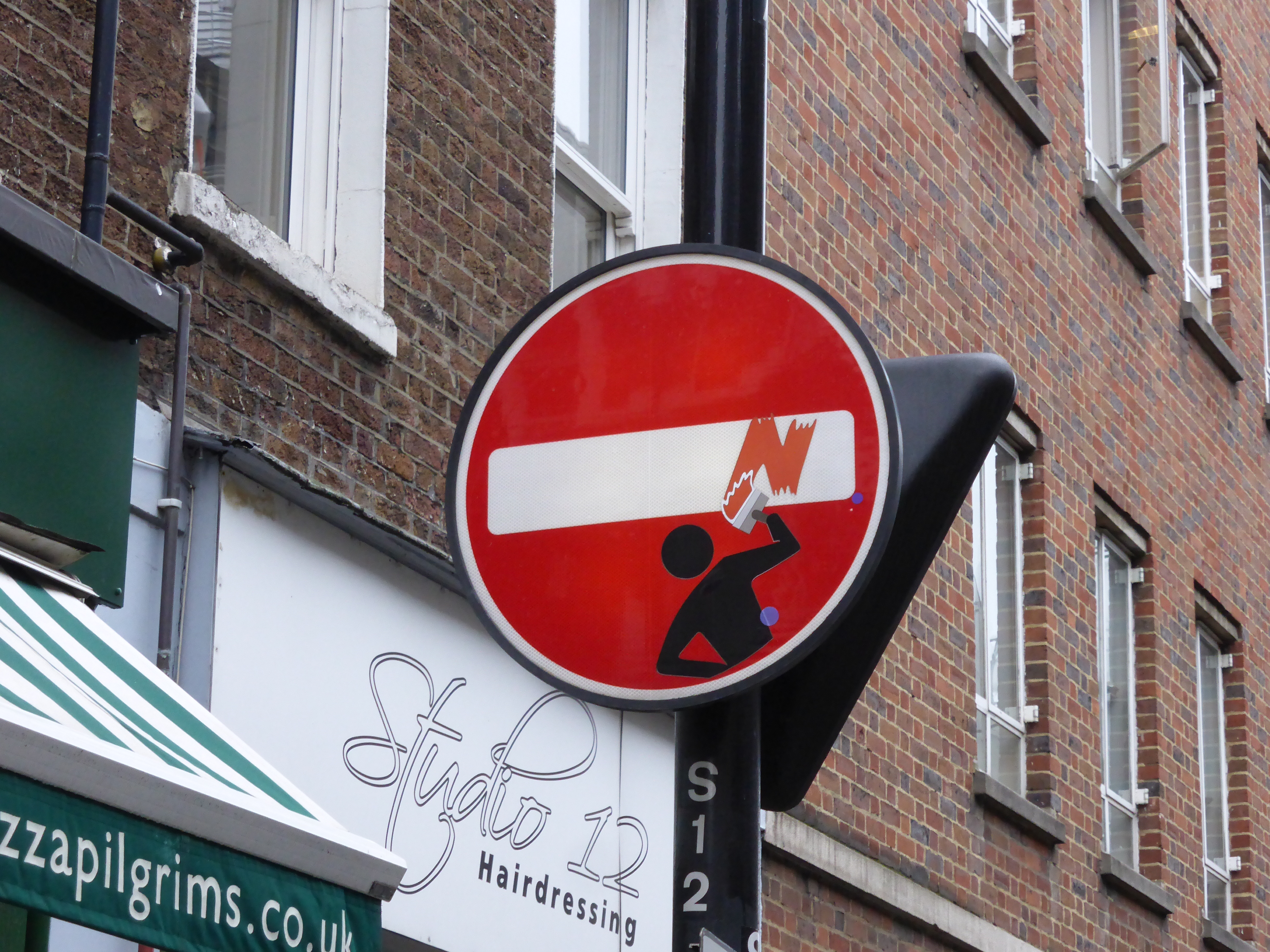 Just over a week ago Street Artist Clet Abraham made his most recent visit to London whilst he was over with the Graffik Gallery who showcased his work at the Moniker Art Fair (covered here) and to present his very first UK exhibition at their own gallery (covered here). It’s been five years since Clet Abraham started his unique and humorous approach to guerilla Street Art, and four years since he first visited London. Utilizing this opportunity Clet went on a short but prolific tour of applying his unique brand of witty humour to many of London’s street signs, primarily around East London in the Brick Lane area and along Portobello Road in west London.