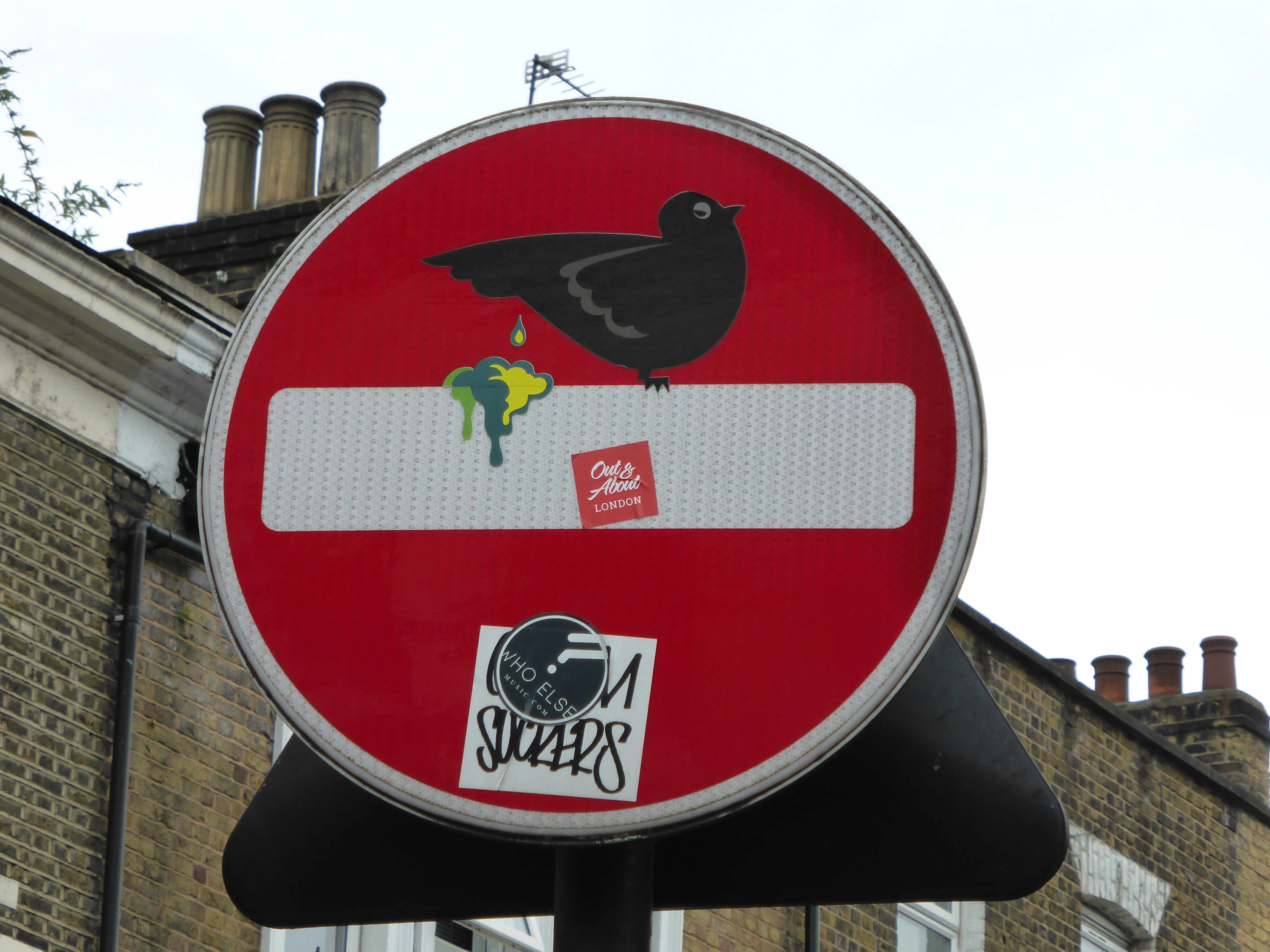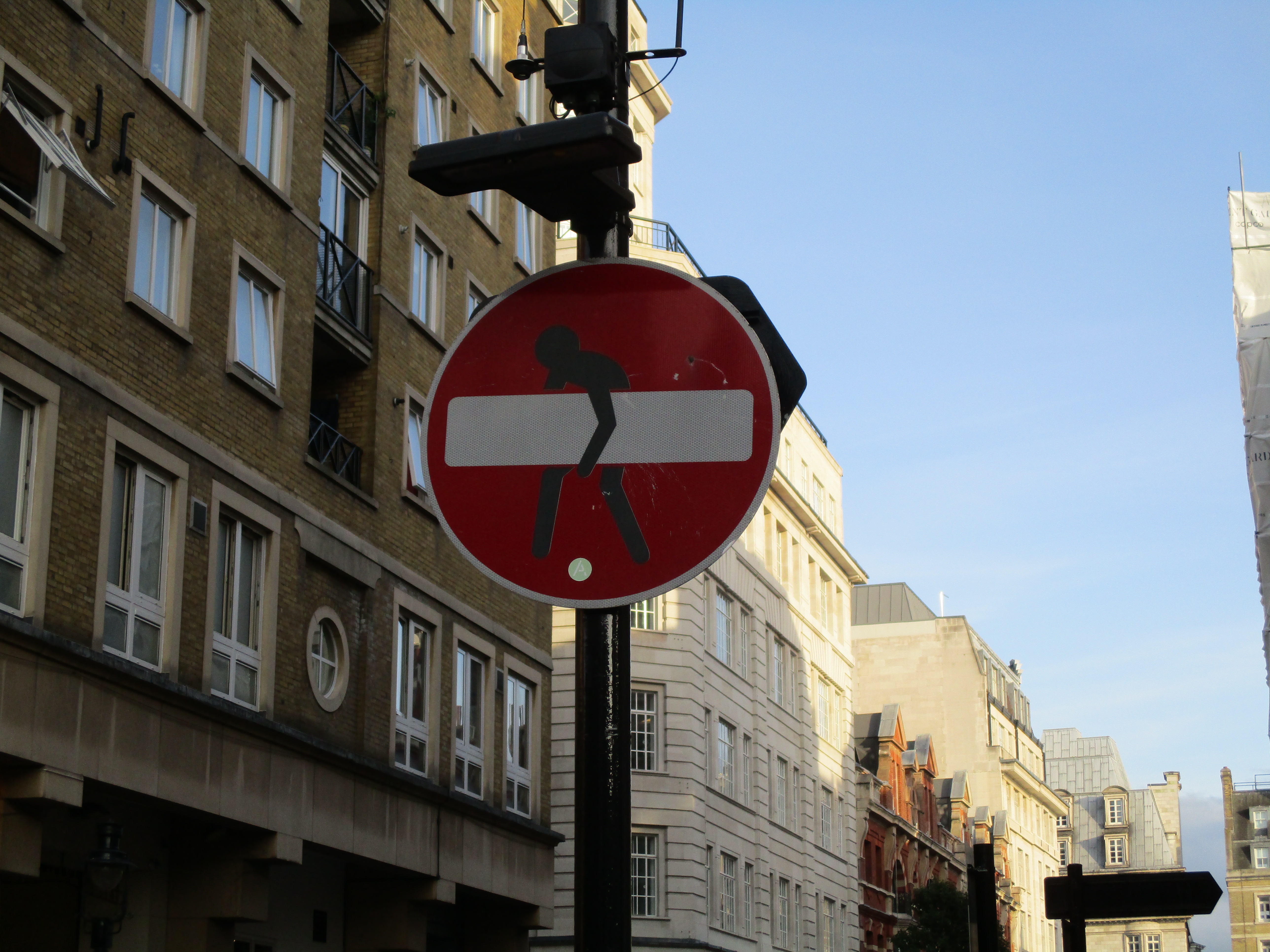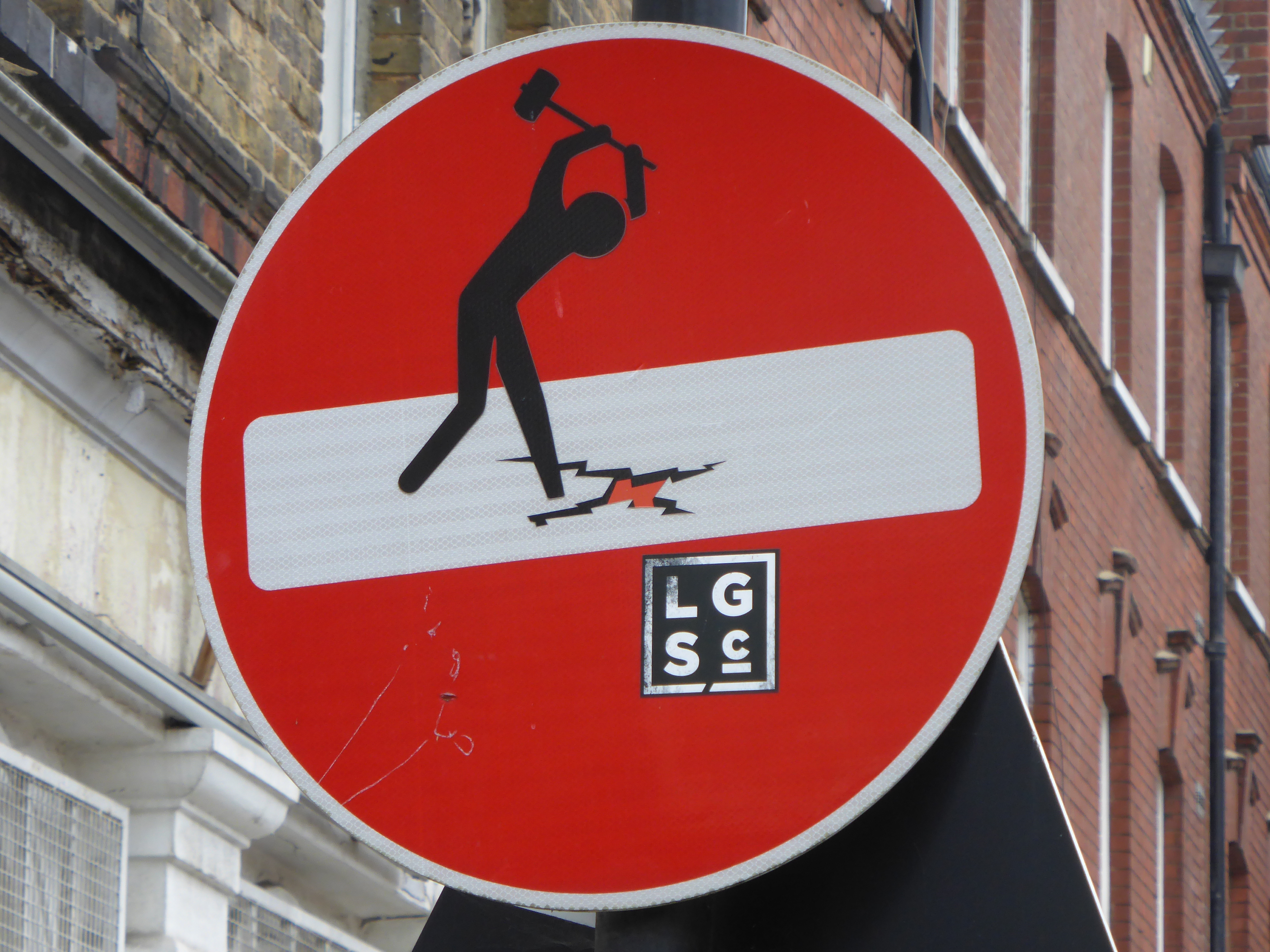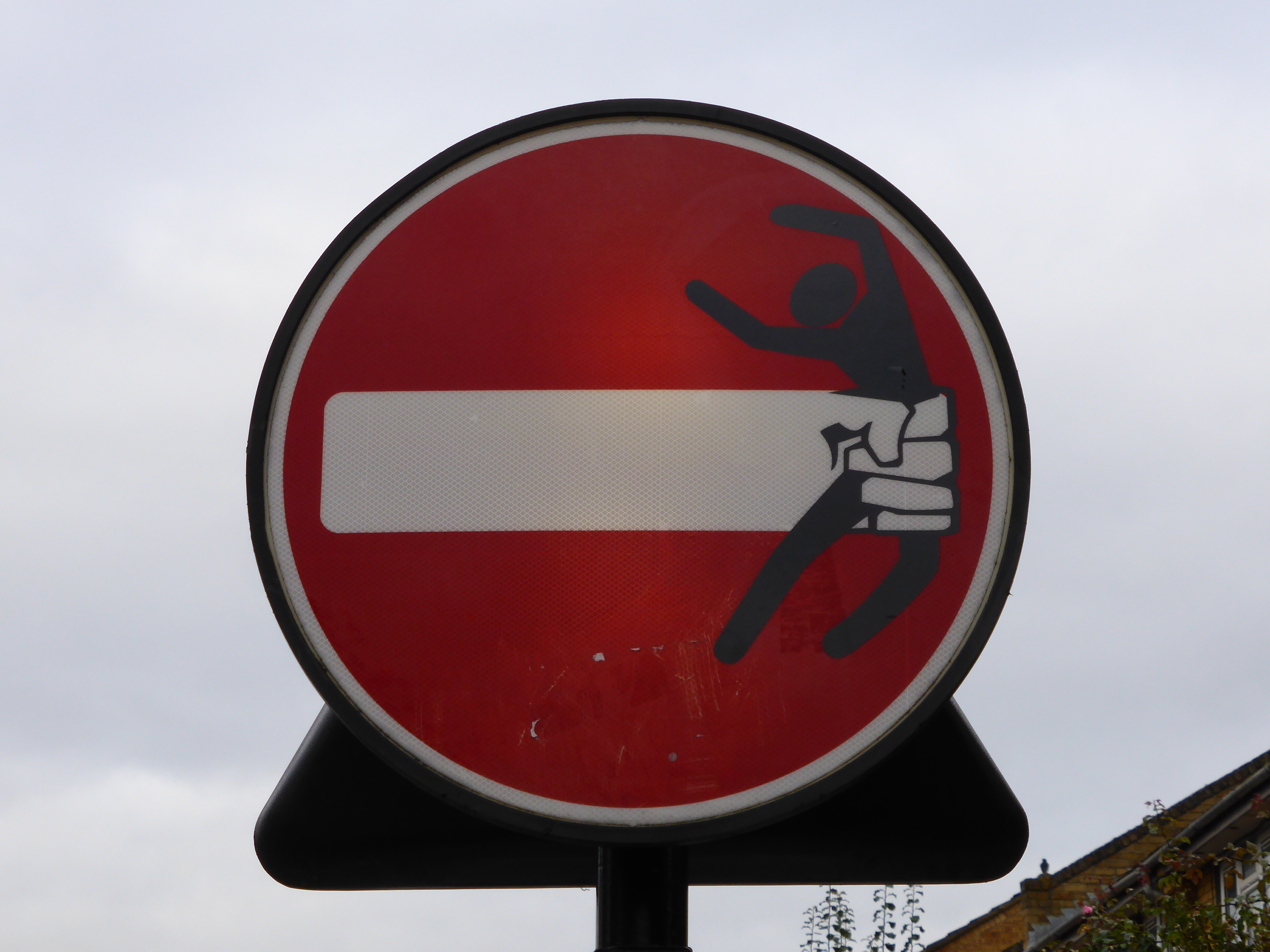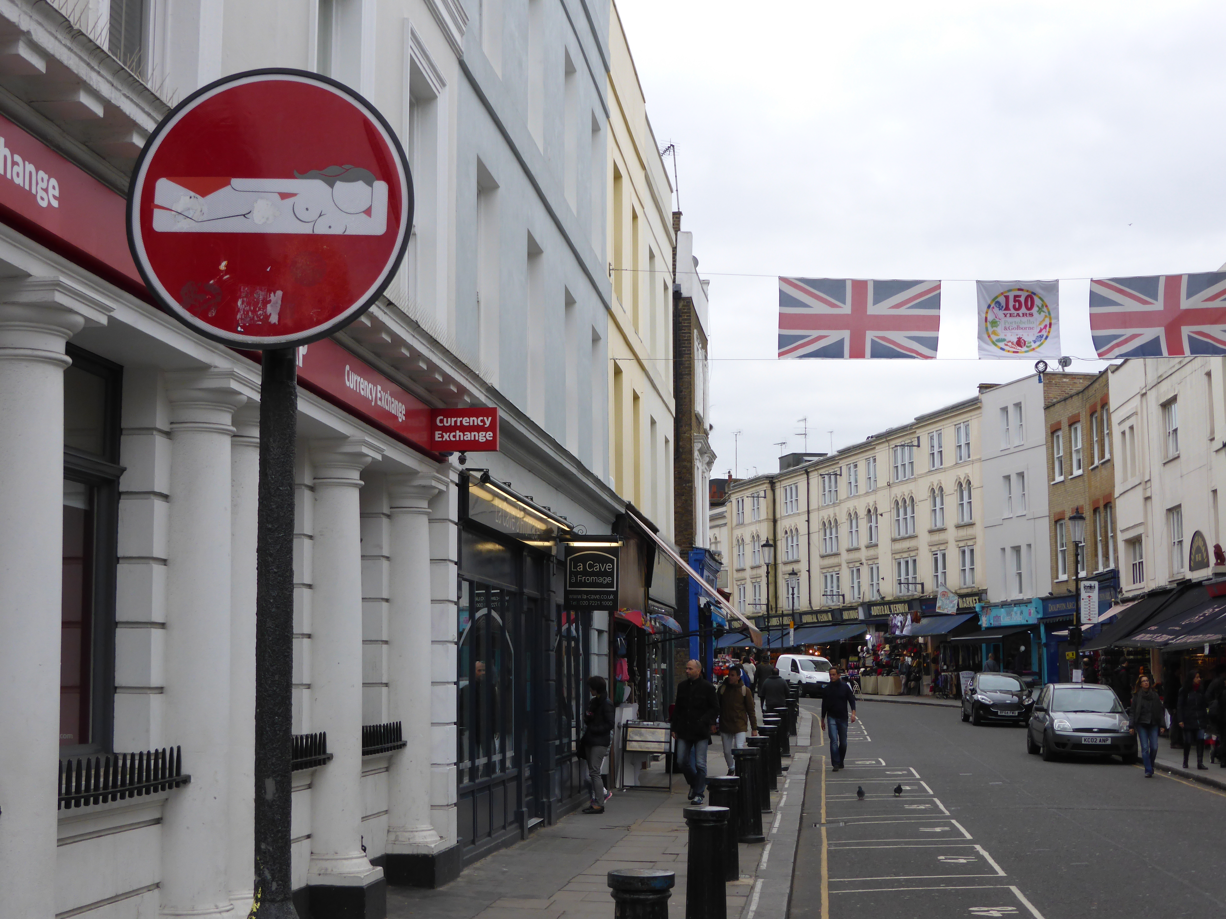 Just over a week ago Street Artist Clet Abraham made his most recent visit to London whilst he was over with the Graffik Gallery who showcased his work at the Moniker Art Fair (covered here) and to present his very first UK exhibition at their own gallery (covered here). It’s been five years since Clet Abraham started his unique and humorous approach to guerilla Street Art, and four years since he first visited London. Utilizing this opportunity Clet went on a short but prolific tour of applying his unique brand of witty humour to many of London’s street signs, primarily around East London in the Brick Lane area and along Portobello Road in west London.