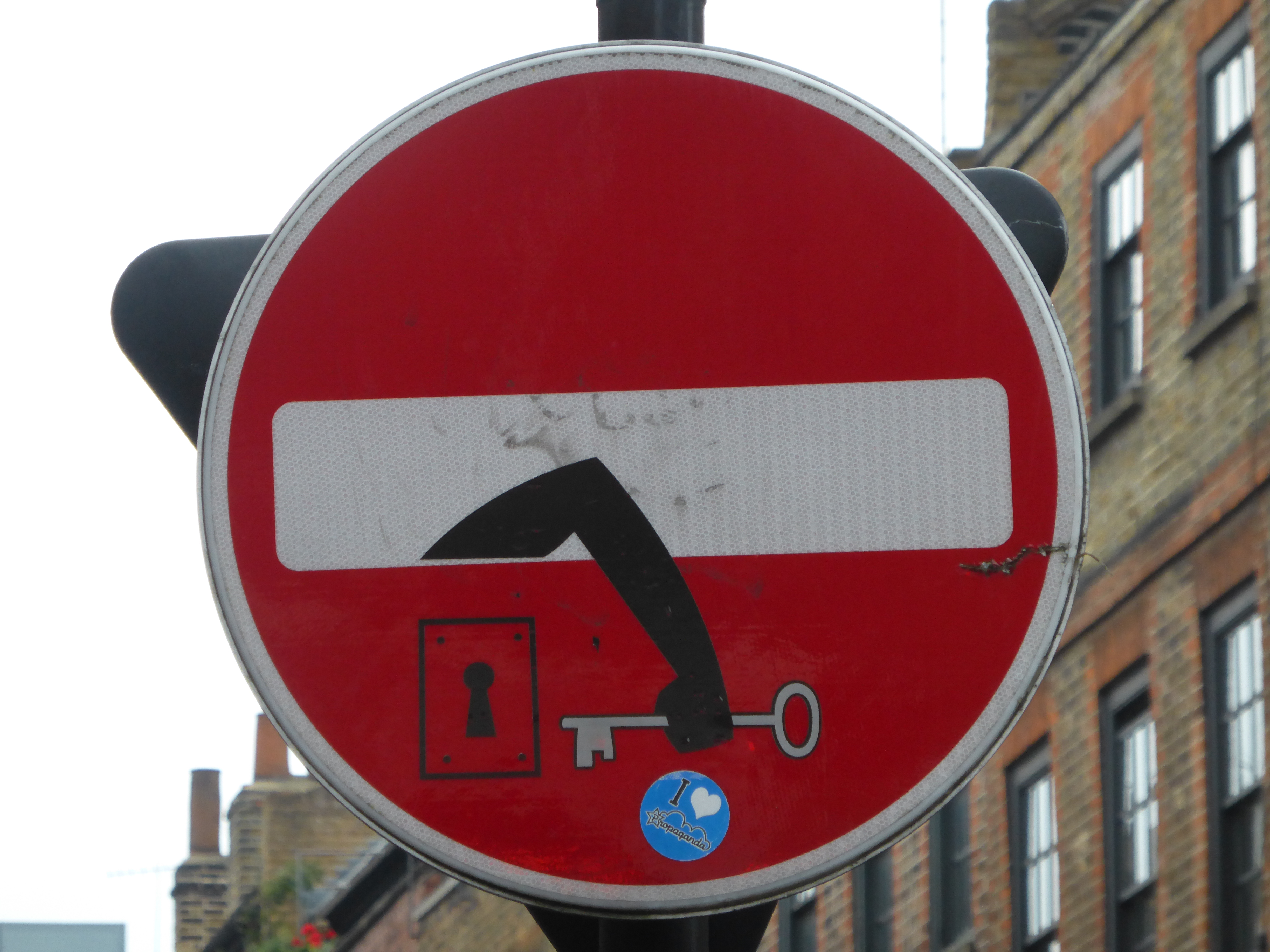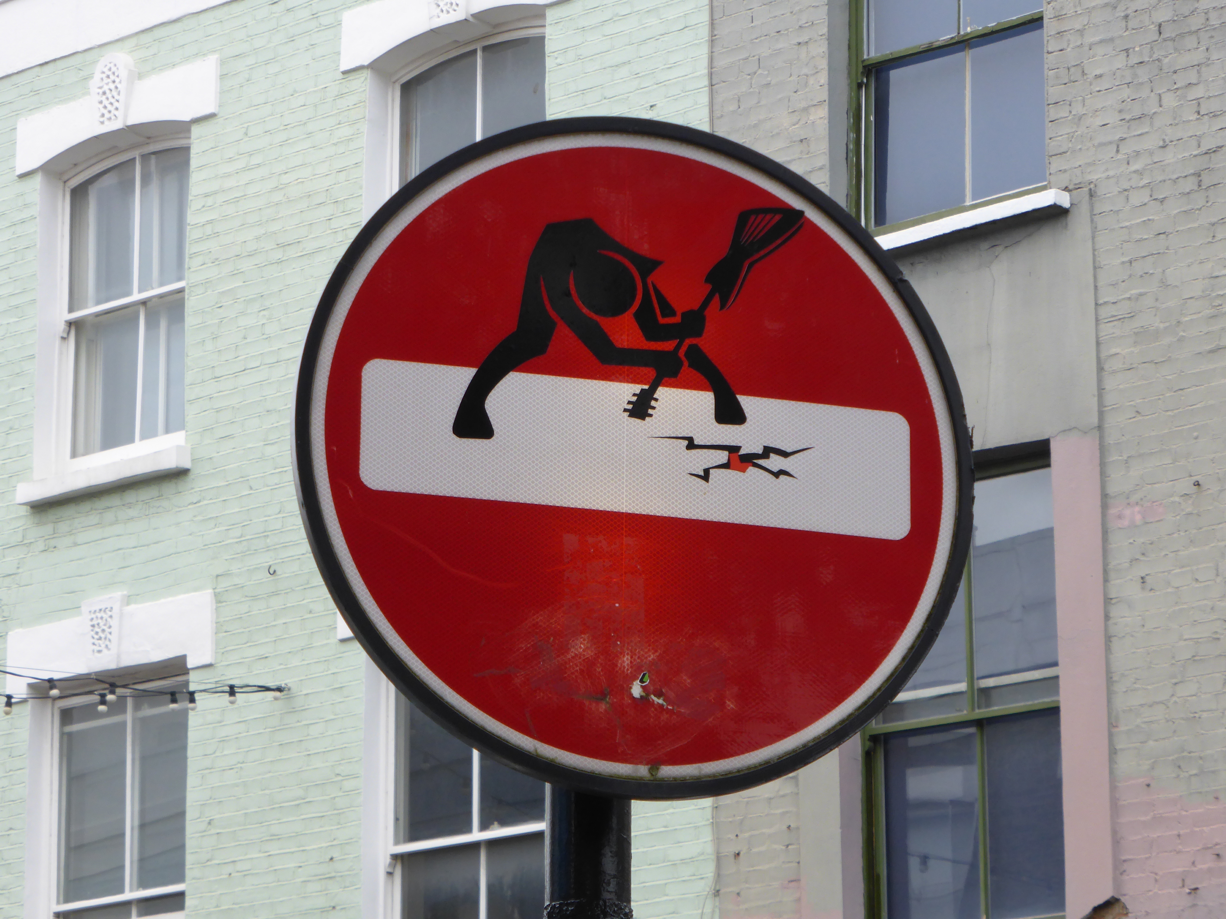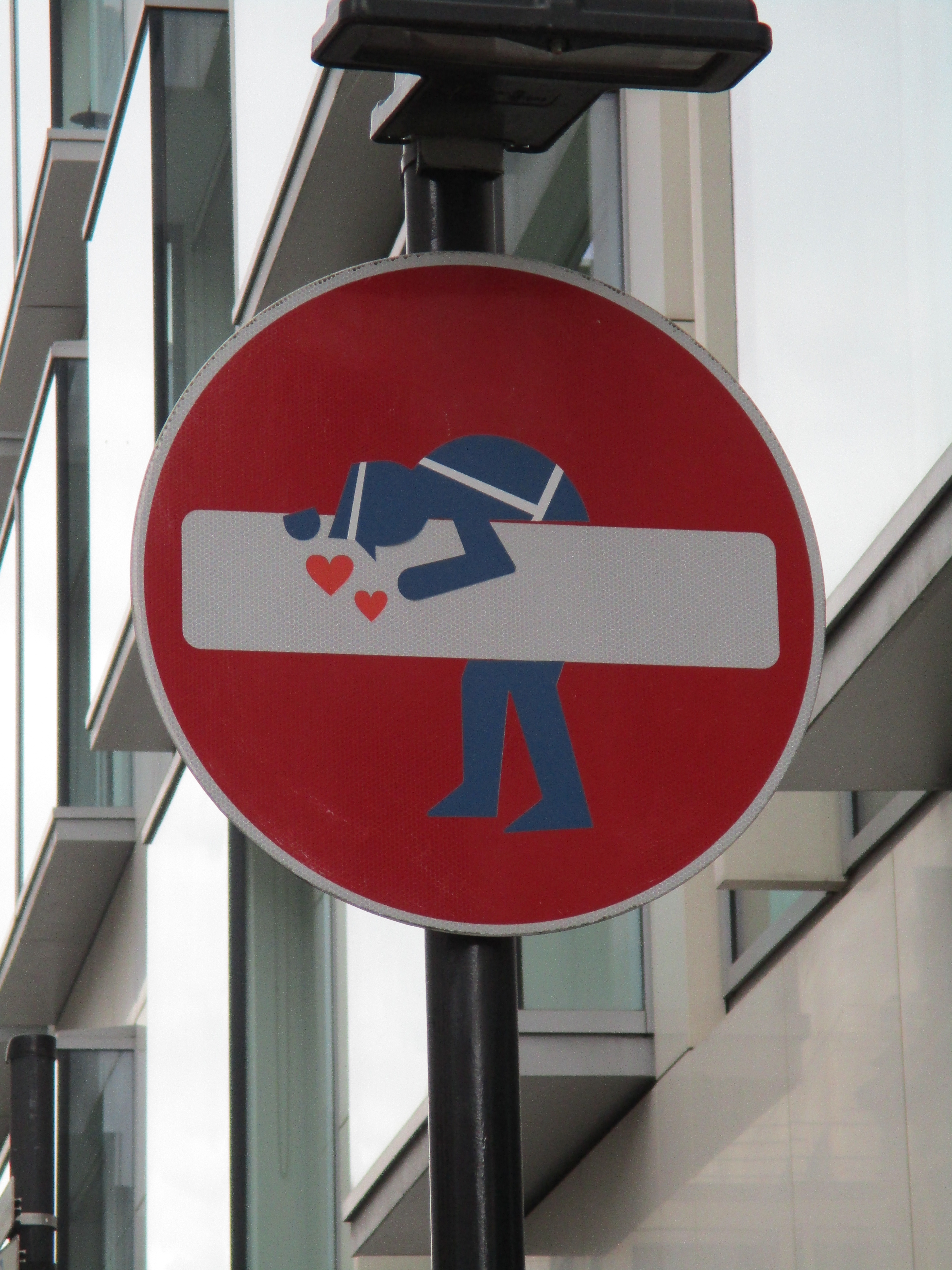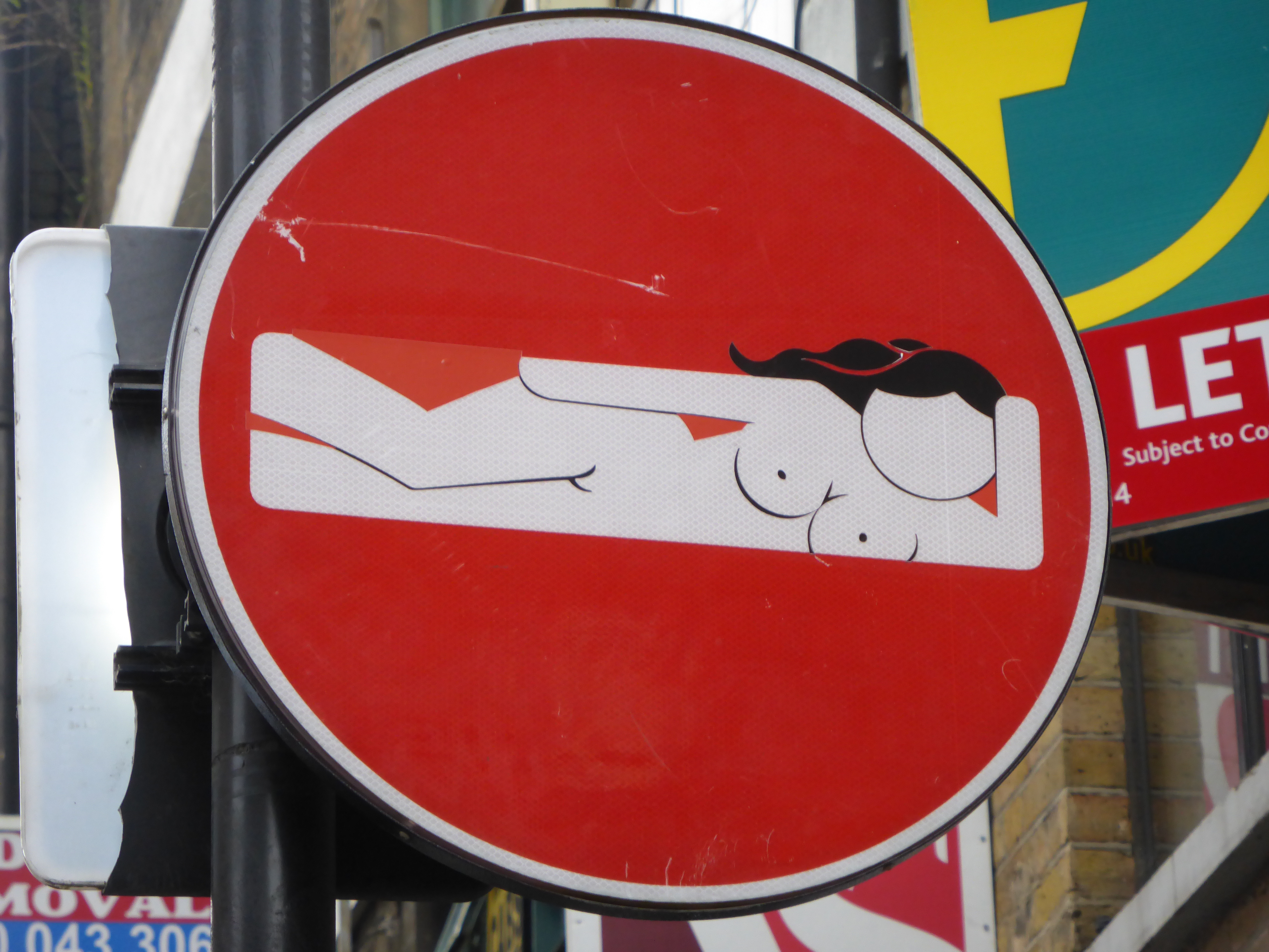 Just over a week ago Street Artist Clet Abraham made his most recent visit to London whilst he was over with the Graffik Gallery who showcased his work at the Moniker Art Fair (covered here) and to present his very first UK exhibition at their own gallery (covered here). It’s been five years since Clet Abraham started his unique and humorous approach to guerilla Street Art, and four years since he first visited London. Utilizing this opportunity Clet went on a short but prolific tour of applying his unique brand of witty humour to many of London’s street signs, primarily around East London in the Brick Lane area and along Portobello Road in west London.