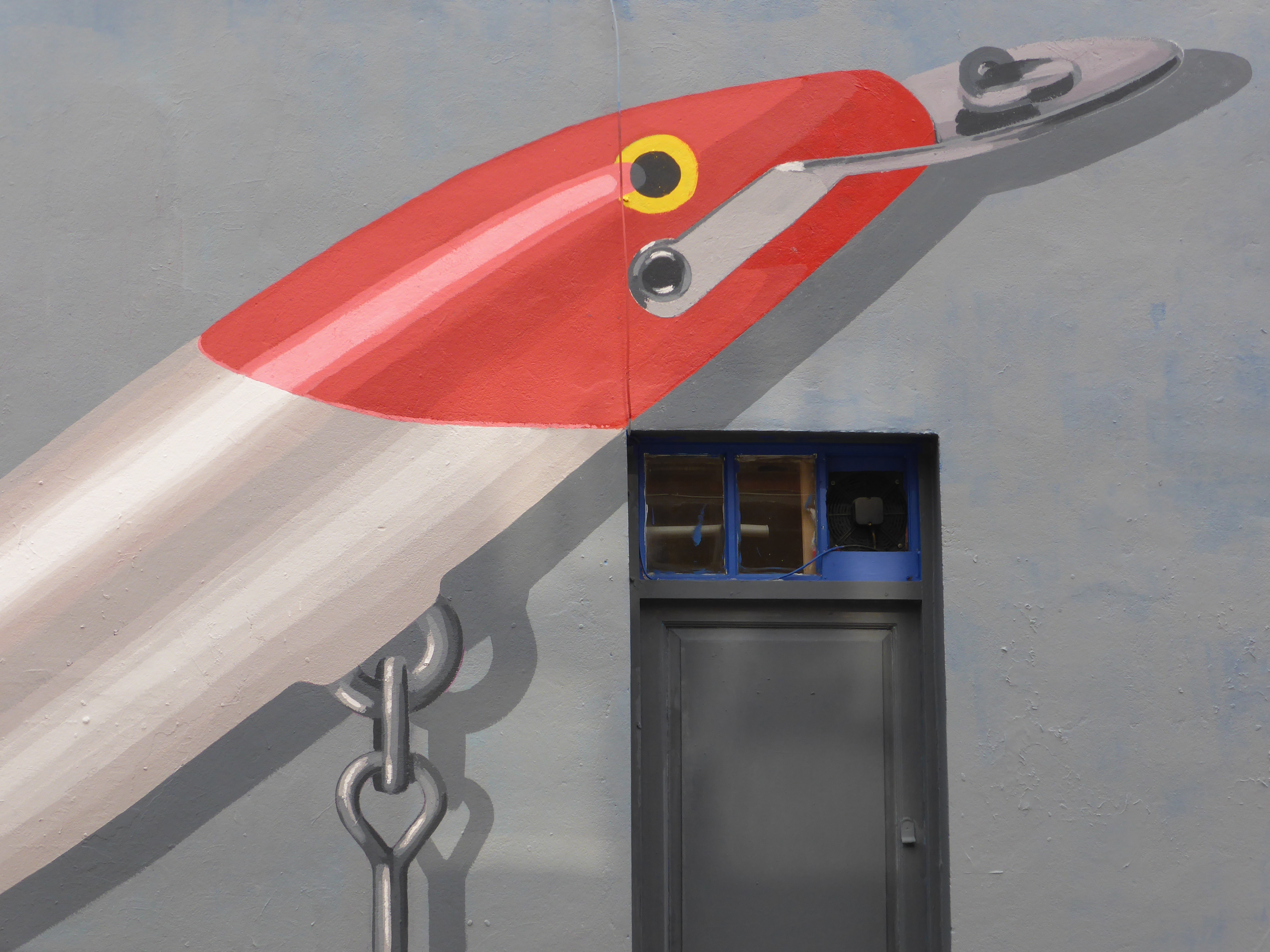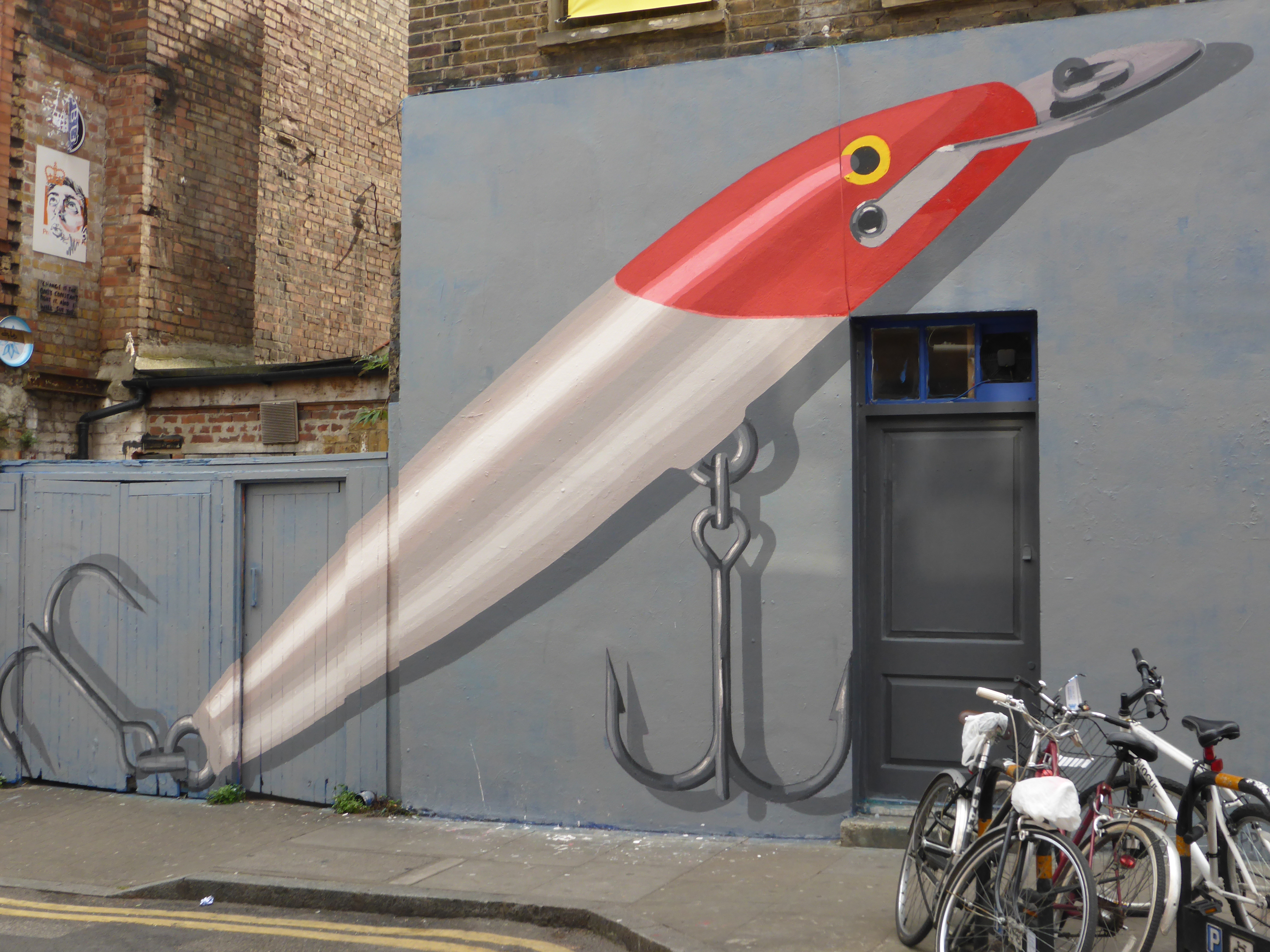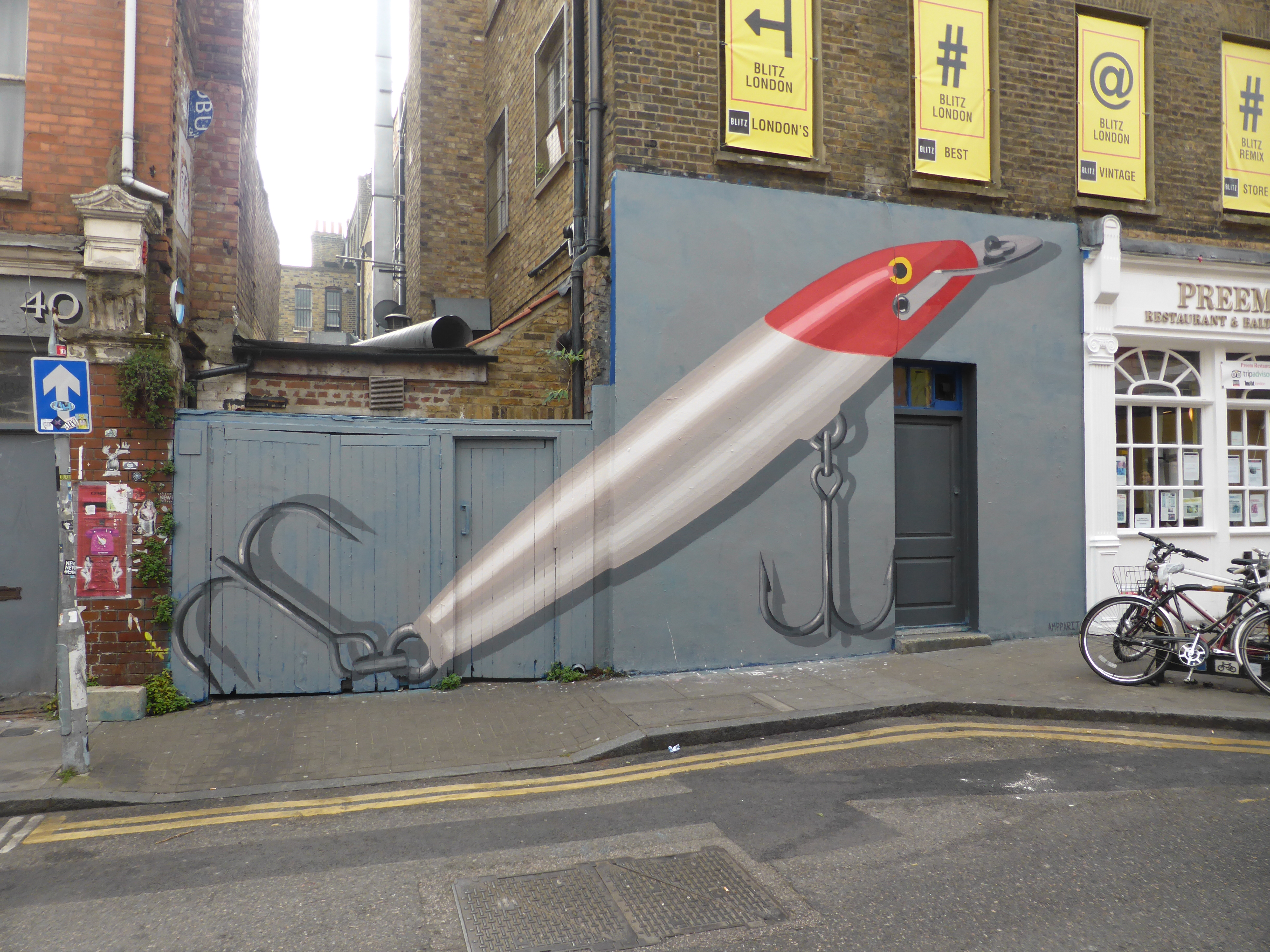 This piece is a part of a project Ampparito started three months ago now entitled ‘I Accept The Terms & Conditions’, with similar works in Madrid, Milan and now London. The work is a reflection on ideas pertaining to ‘Big Data’ and the consequences of accepting the terms and conditions intrinsically linked to every app and piece of software which accompany our lives. For Ampparito this piece is based on the idea that “when something is free, you are the product.” As free services increase, which most see as a good point, free newspapers, online services, apps, Ampparito doesn’t disagree with this, but sets to counter the viewpoint in his pieces. The fish bait subject works as a metaphor for the concept of ‘adverts’, the fish bait and lure represents something artificial, shiny and simple but comes with hooks, the catches and consequence of such actions and beliefs. Modern societies are offered an increasing number of lures and tasty treats everyday without considering the result of such exchanges.