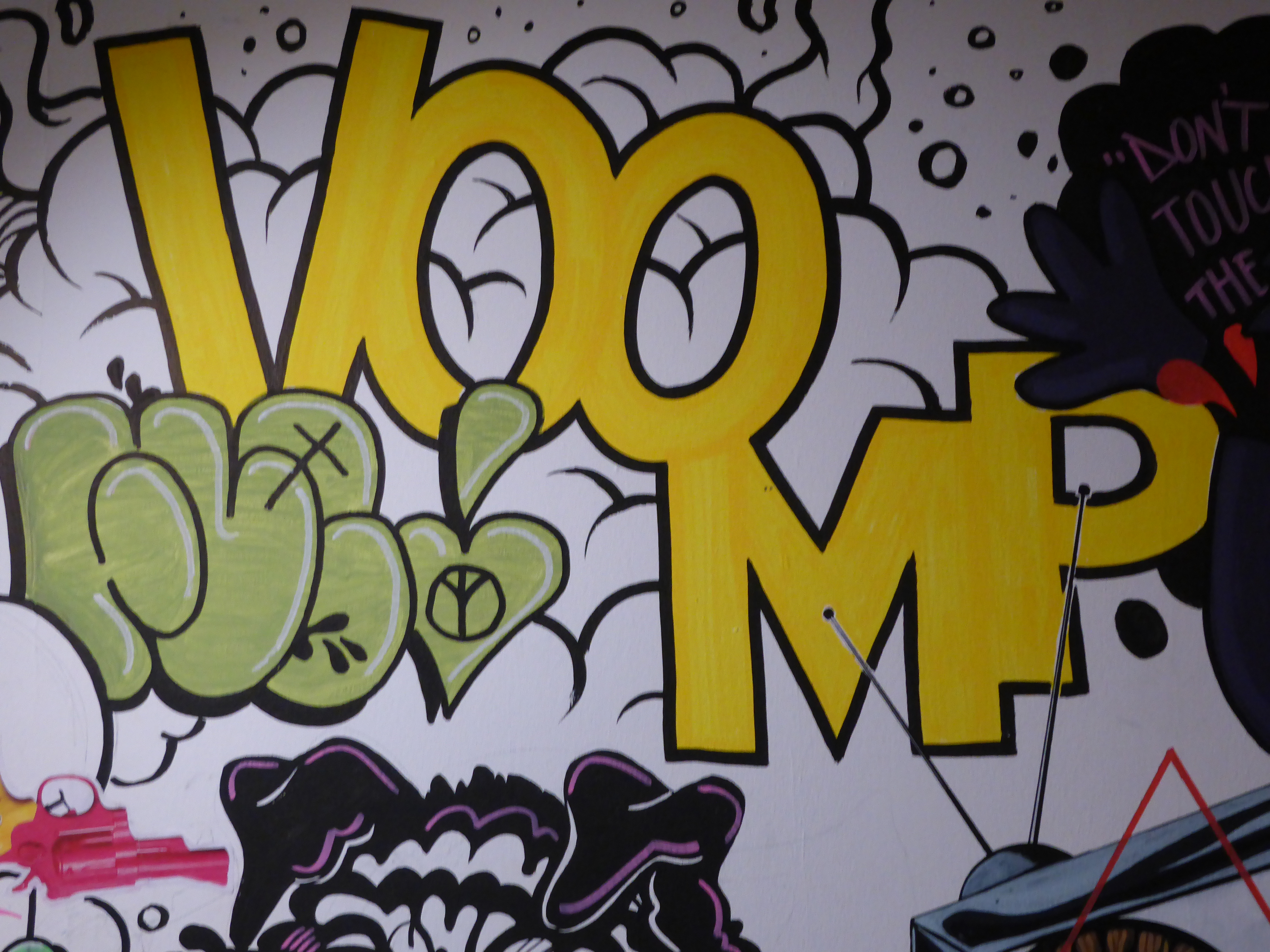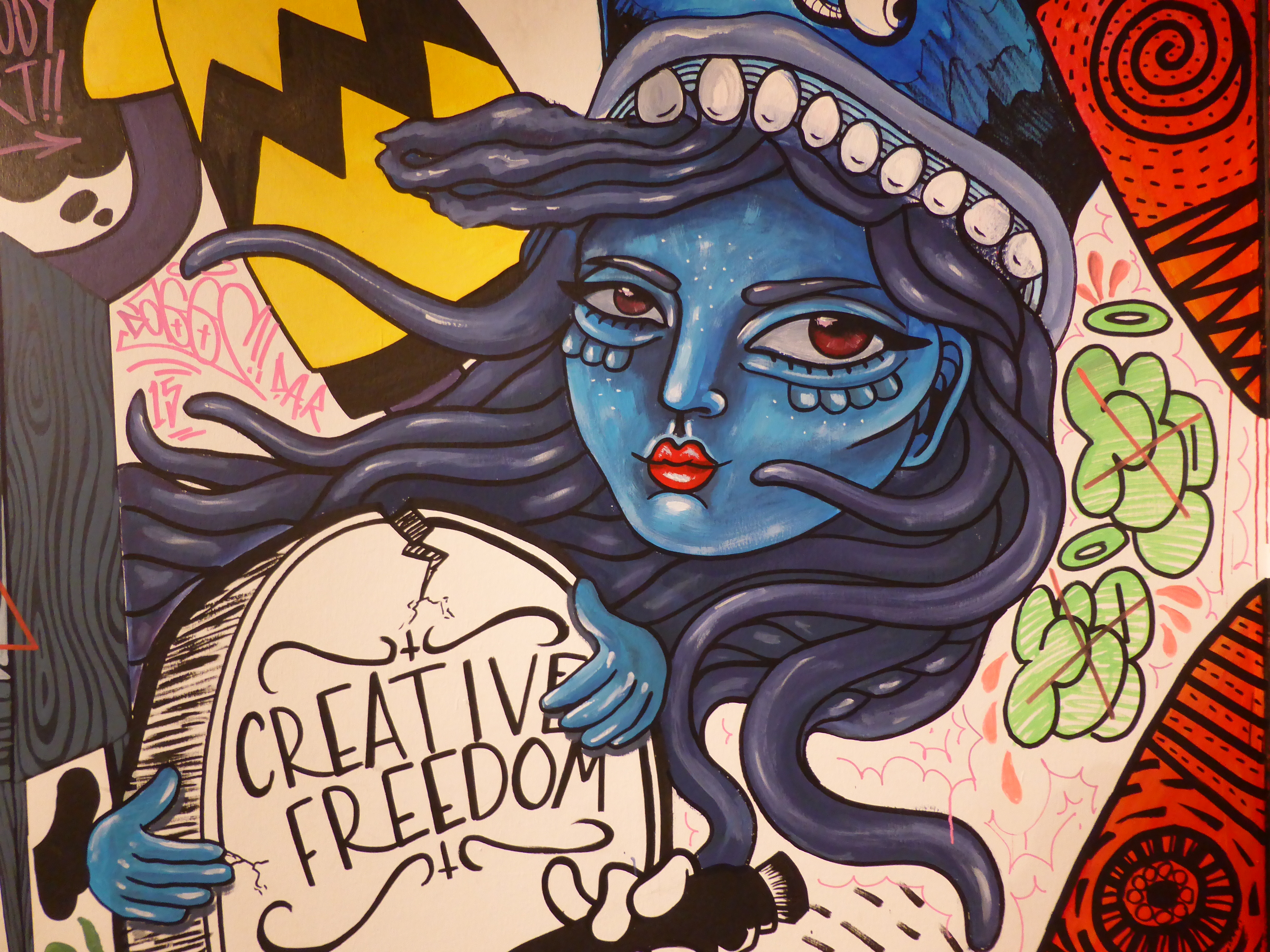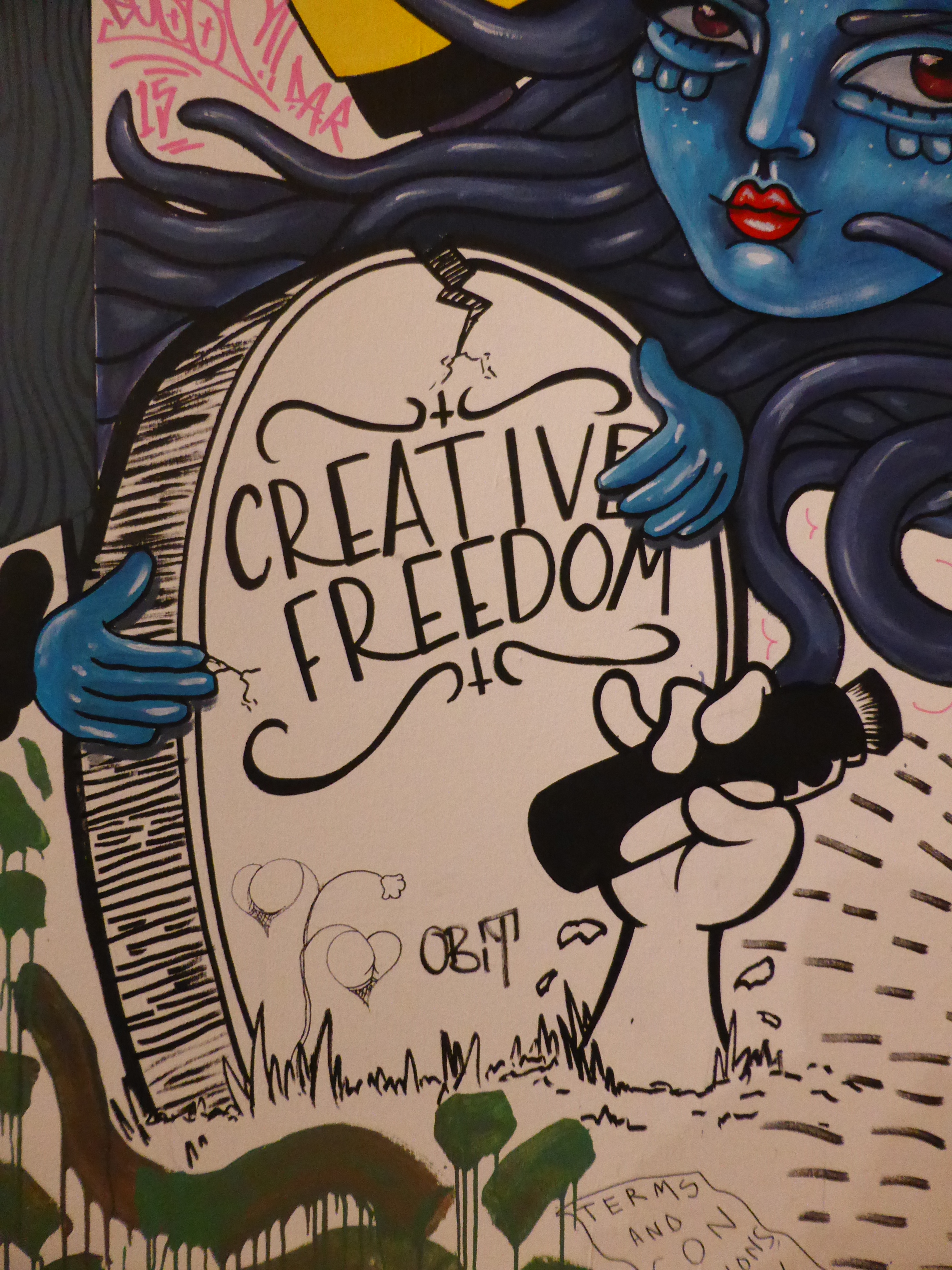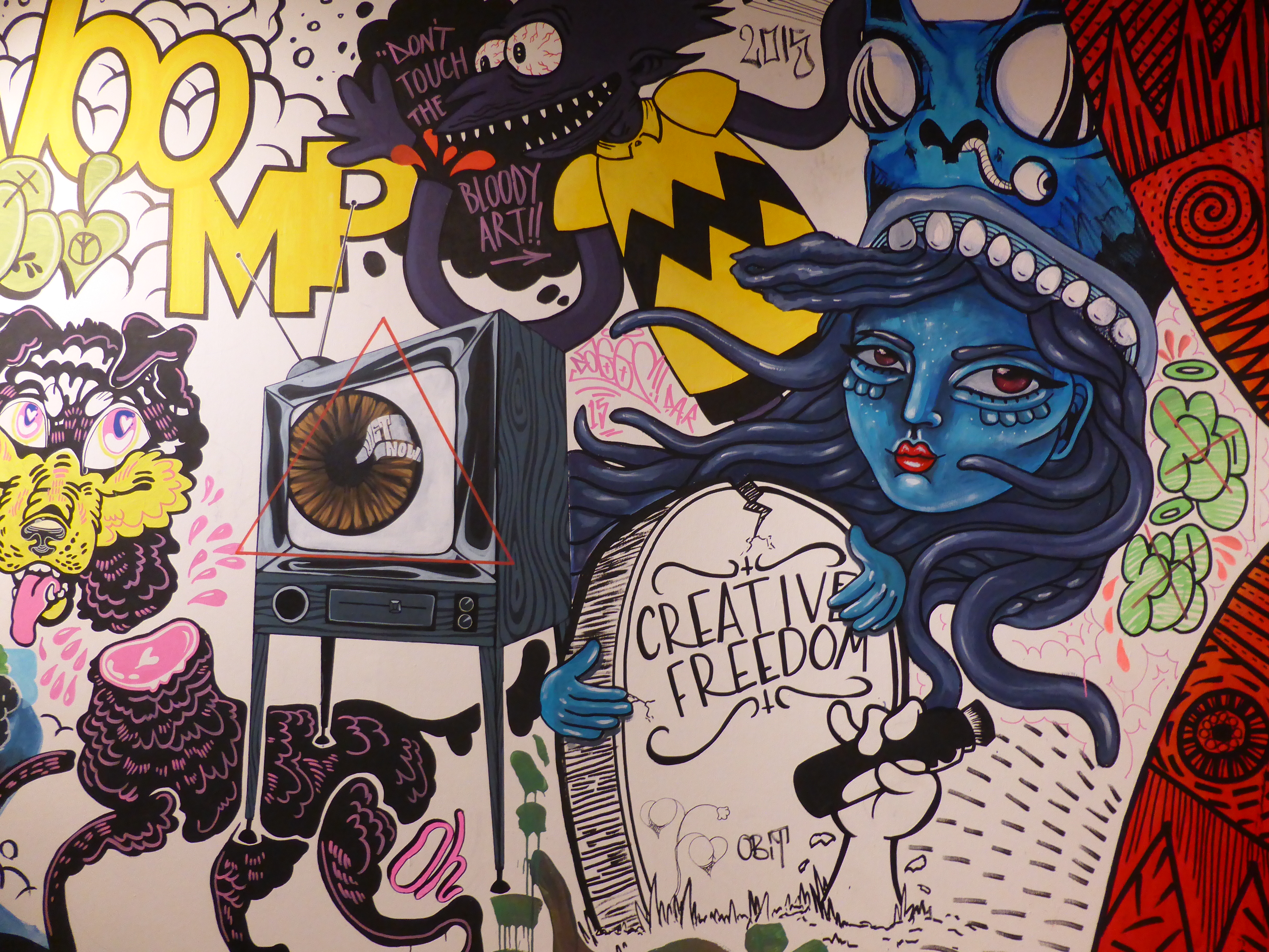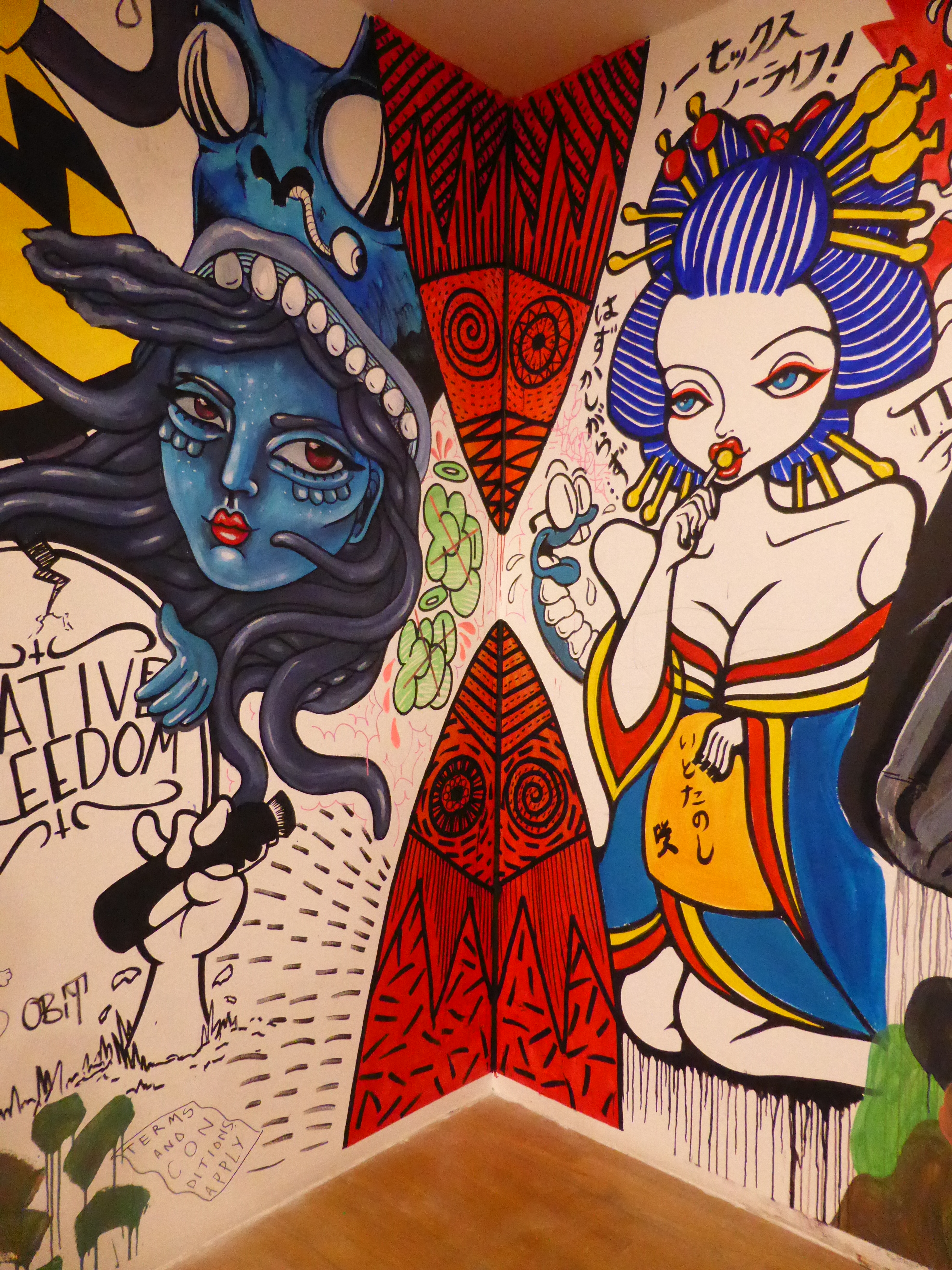 Detail of work by SAKI&Bitches, with our favourite individual character painted on the wall, which really has such a strong Pop Art theme about it.