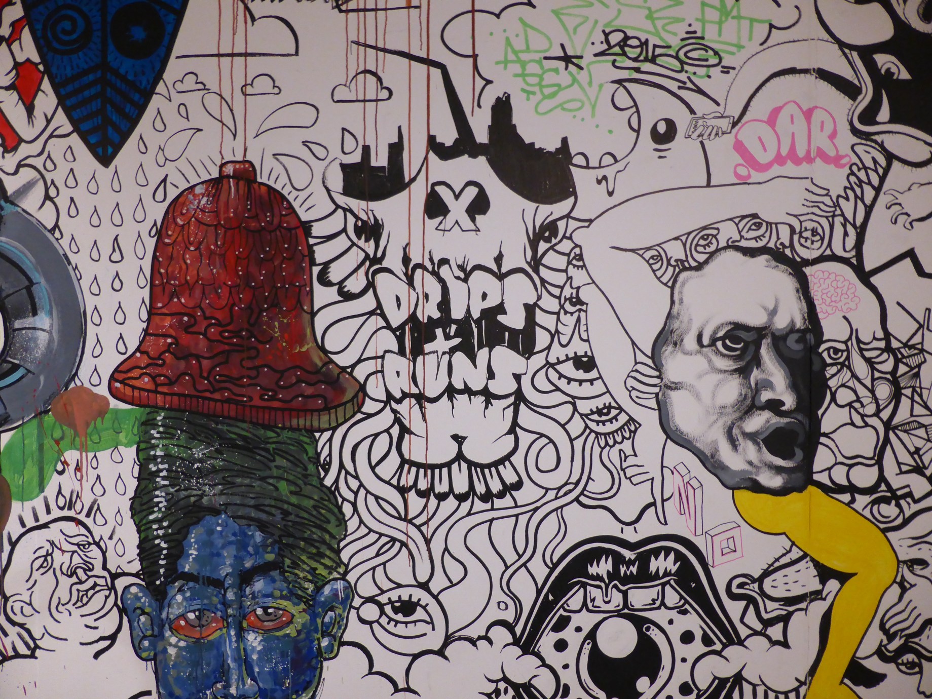 Drips & Runs is the brainchild of duo Seeds One and Bill Daggs and first went live in February 2015. For those of you unfamiliar with the format of Drips & Runs the idea is for a group of artists to get together for a process of working their own individual styles and setting the works to tie in as a cohesive whole, free of egos this isn’t a competition or a battle, but is a platform for the creation of an organic and spontaneous collaborative mural, anyone involved can paint what they want.