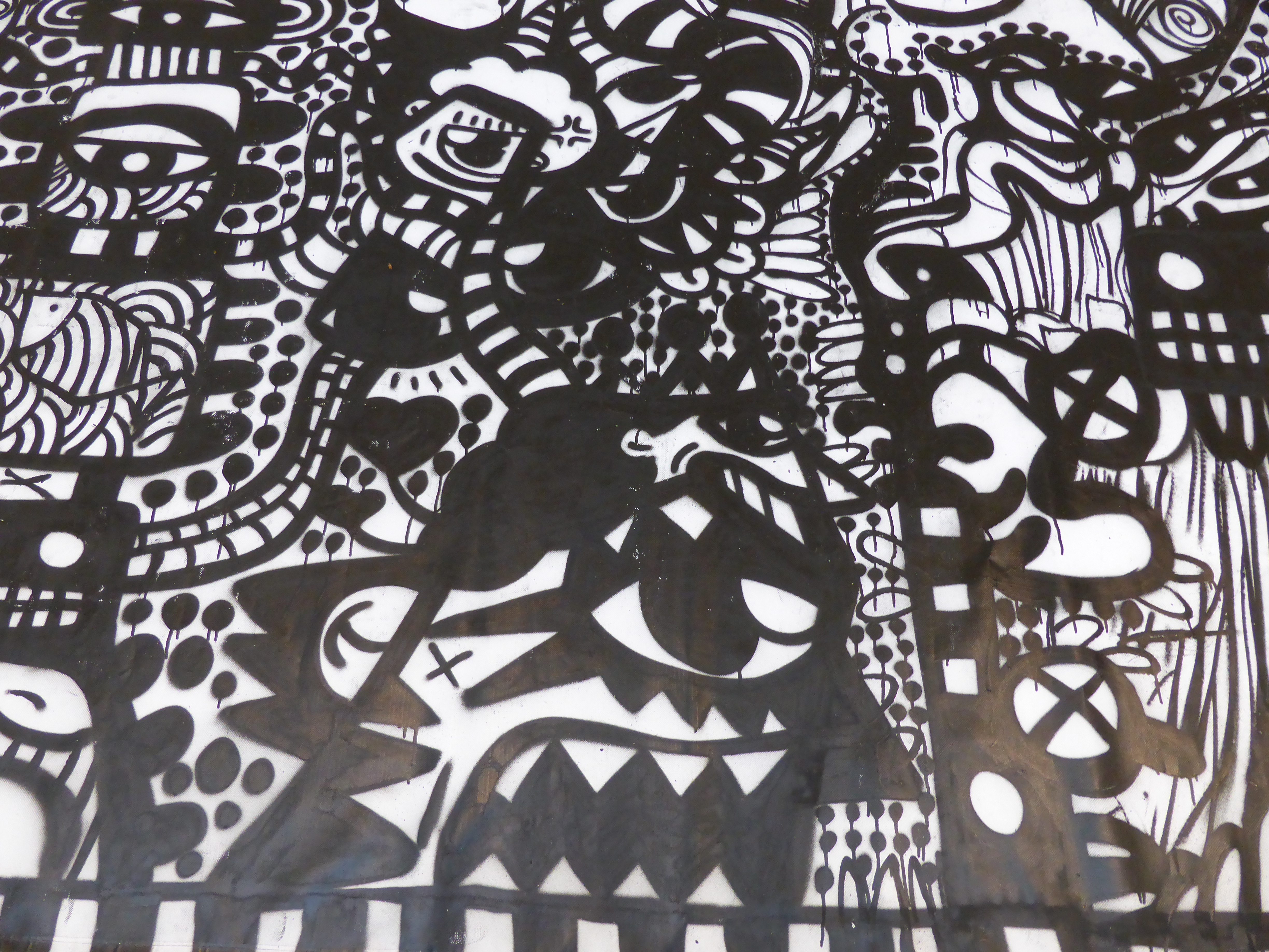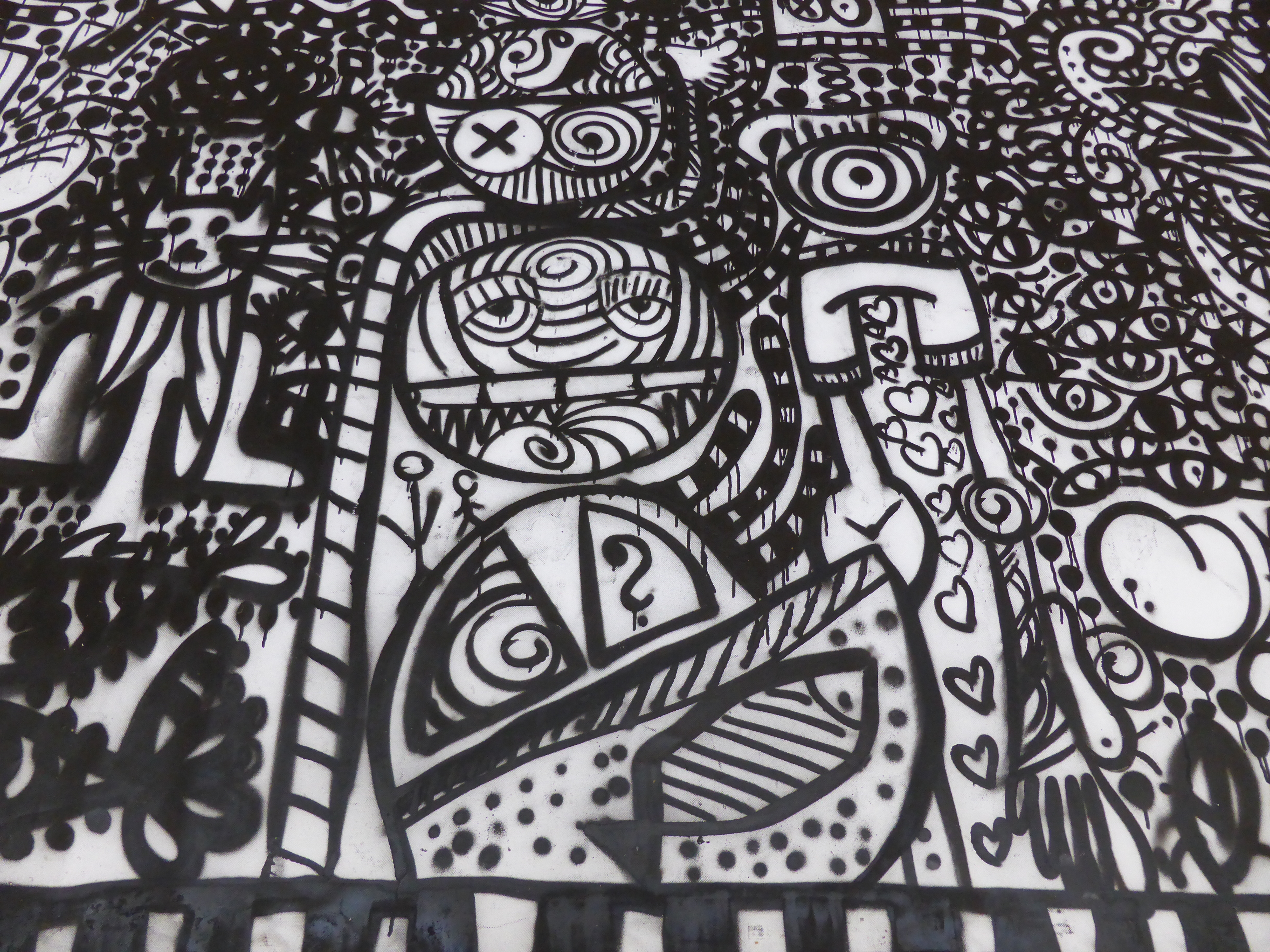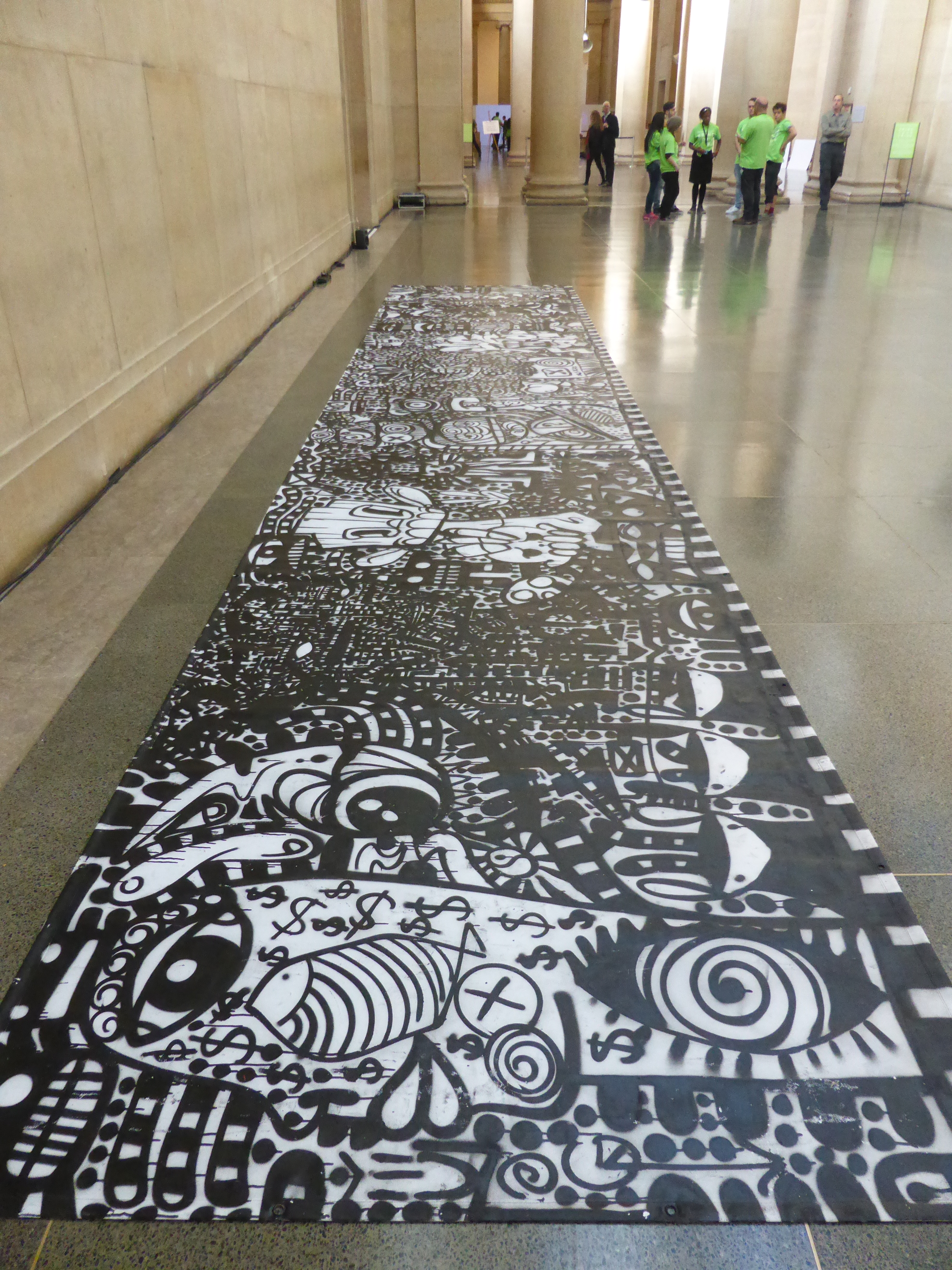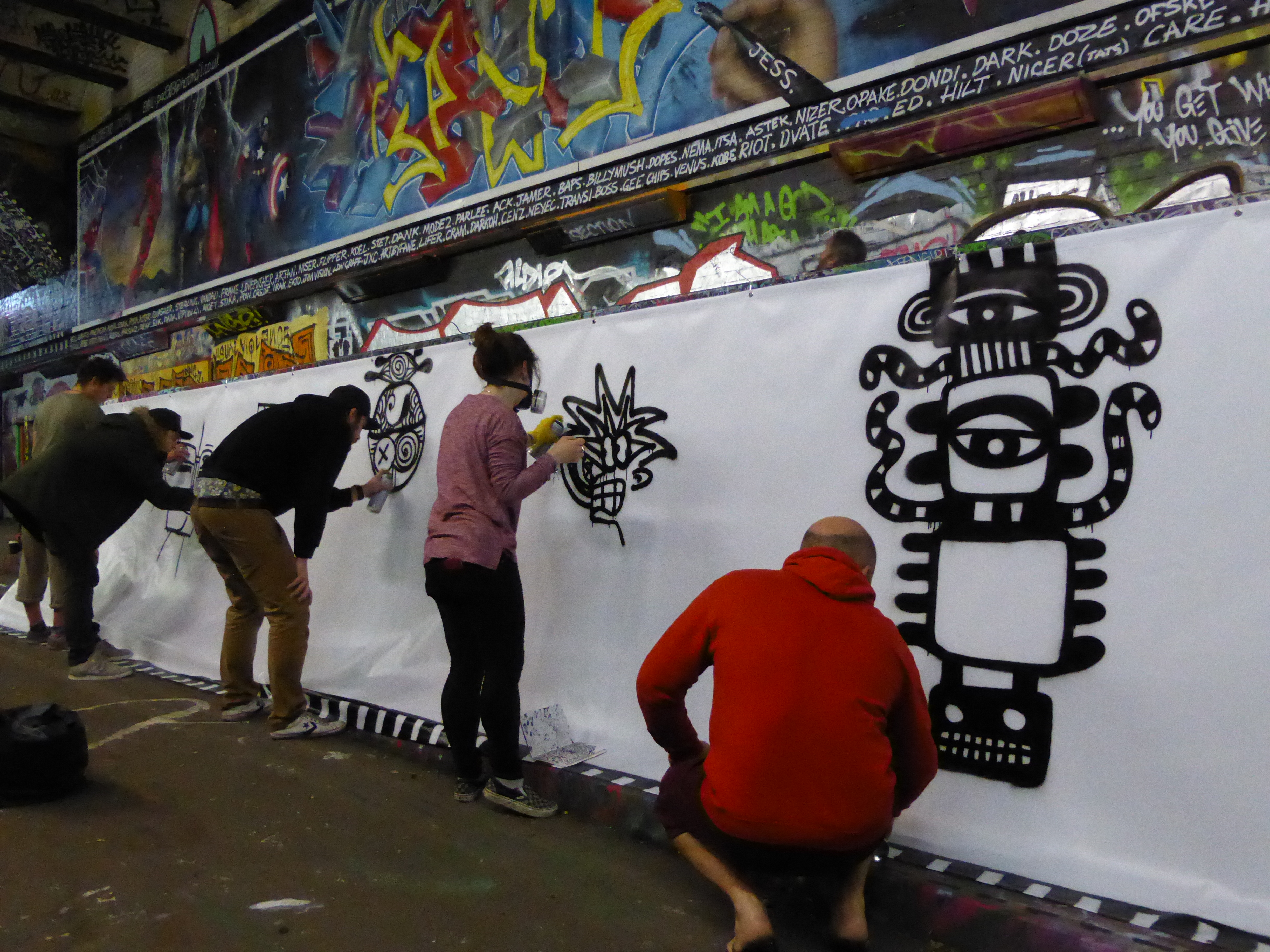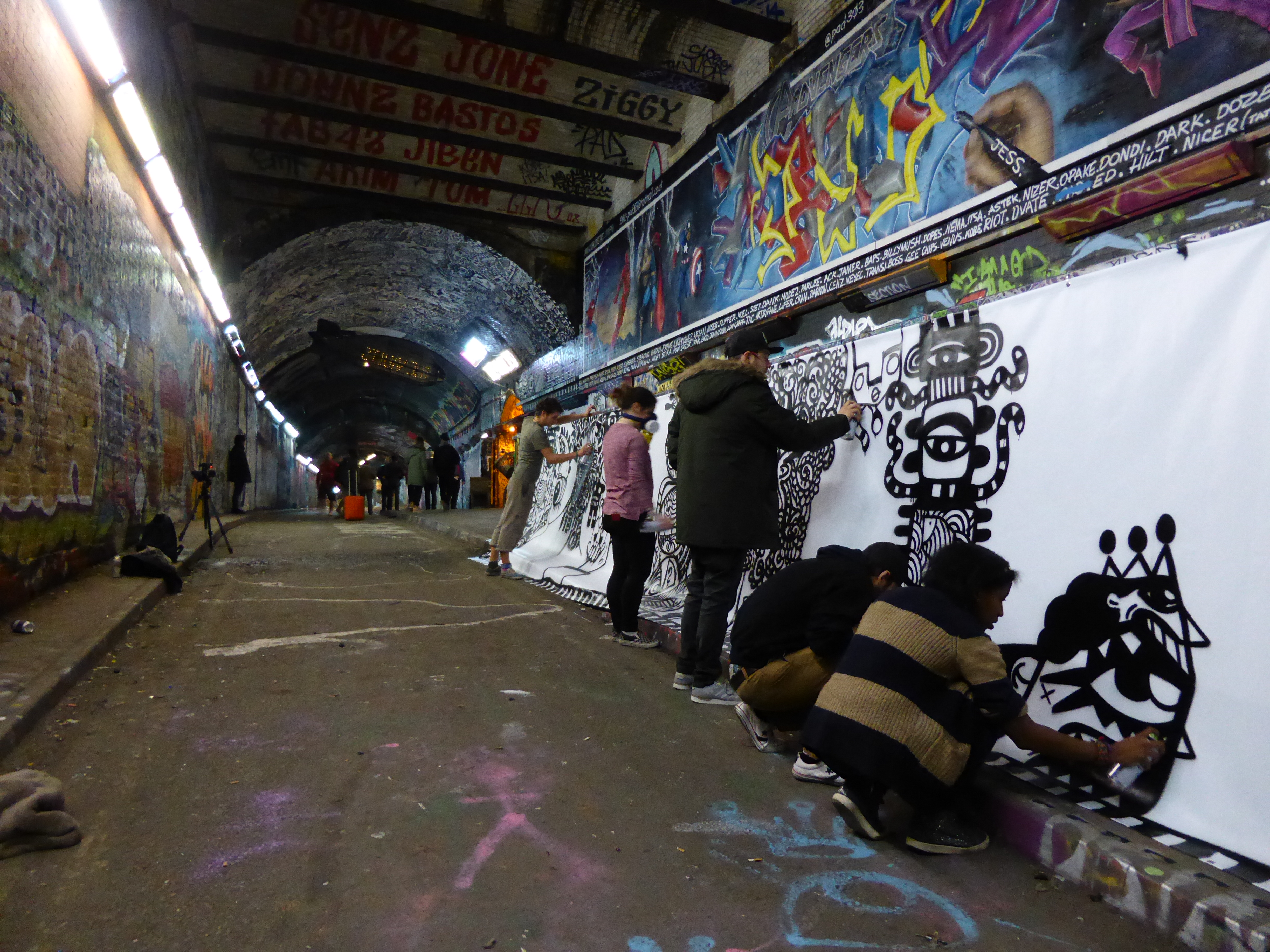 The fundamental collaborative nature of Psychodoodlz works made them a great choice to provide work for the event and participate in aiding visitors with drawing their own ideas relating to their own individual family ties. Representing a Graffiti or Street Art tribe, Psychodoodlz members Marc Craig, Nolij, Kednog, Fane, Angus, New Art Rioter and Jiwon Oh, set to paint their lengthy banner in the most appropriate setting of Leake Street, currently home to their group works and artistic output in London, in the process providing a Street Art work, painted on the Street. As well as the fact that their doodle driven works retain a fundamental tribal dynamic in its appearance, reminiscent of cave paintings, the earliest form of artistic expression.