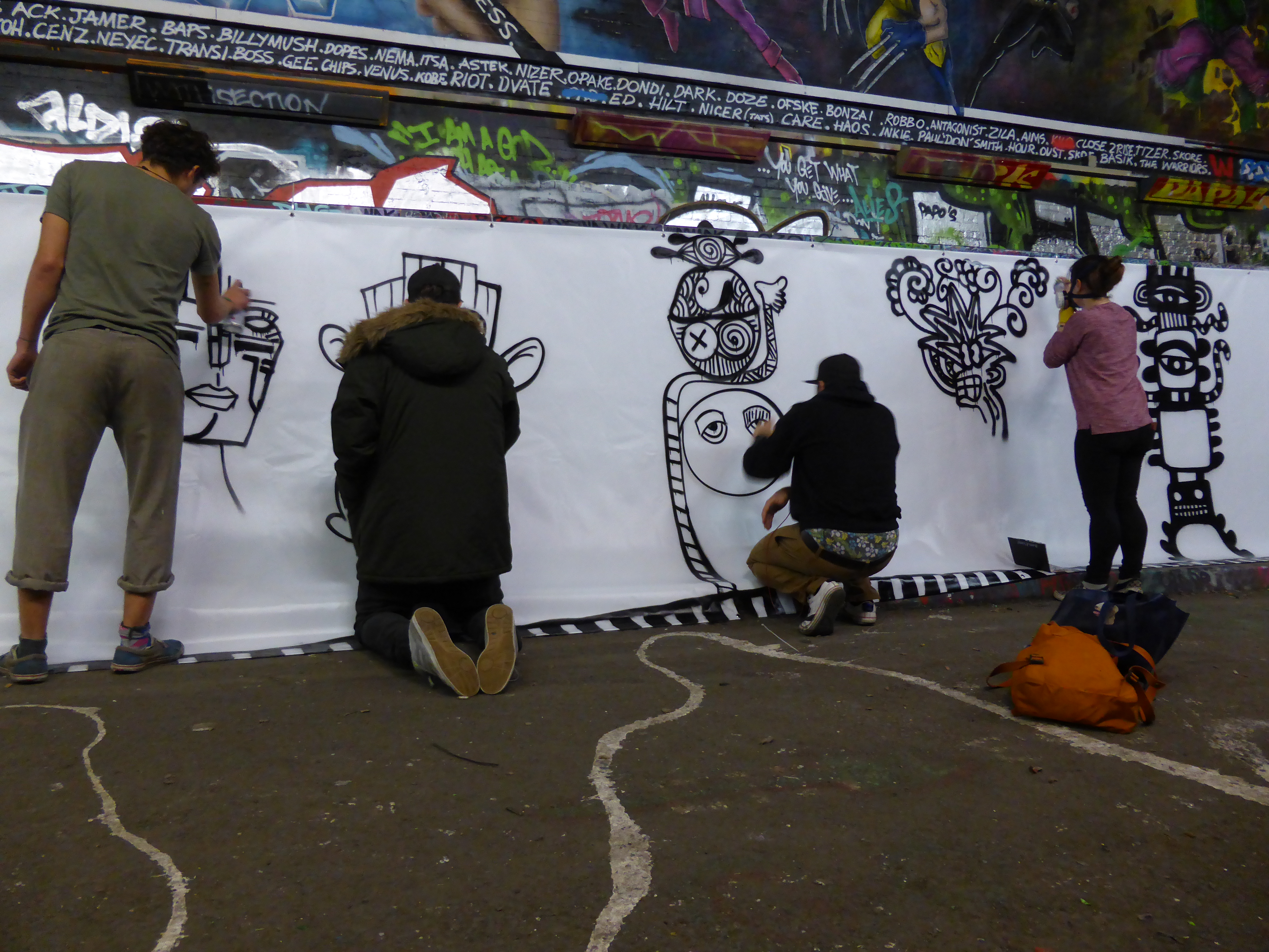 Psychodoodlz crew members Aly Williamson, Nolij, Kednog & New Art Rioterat work on the banner in Leake Street.