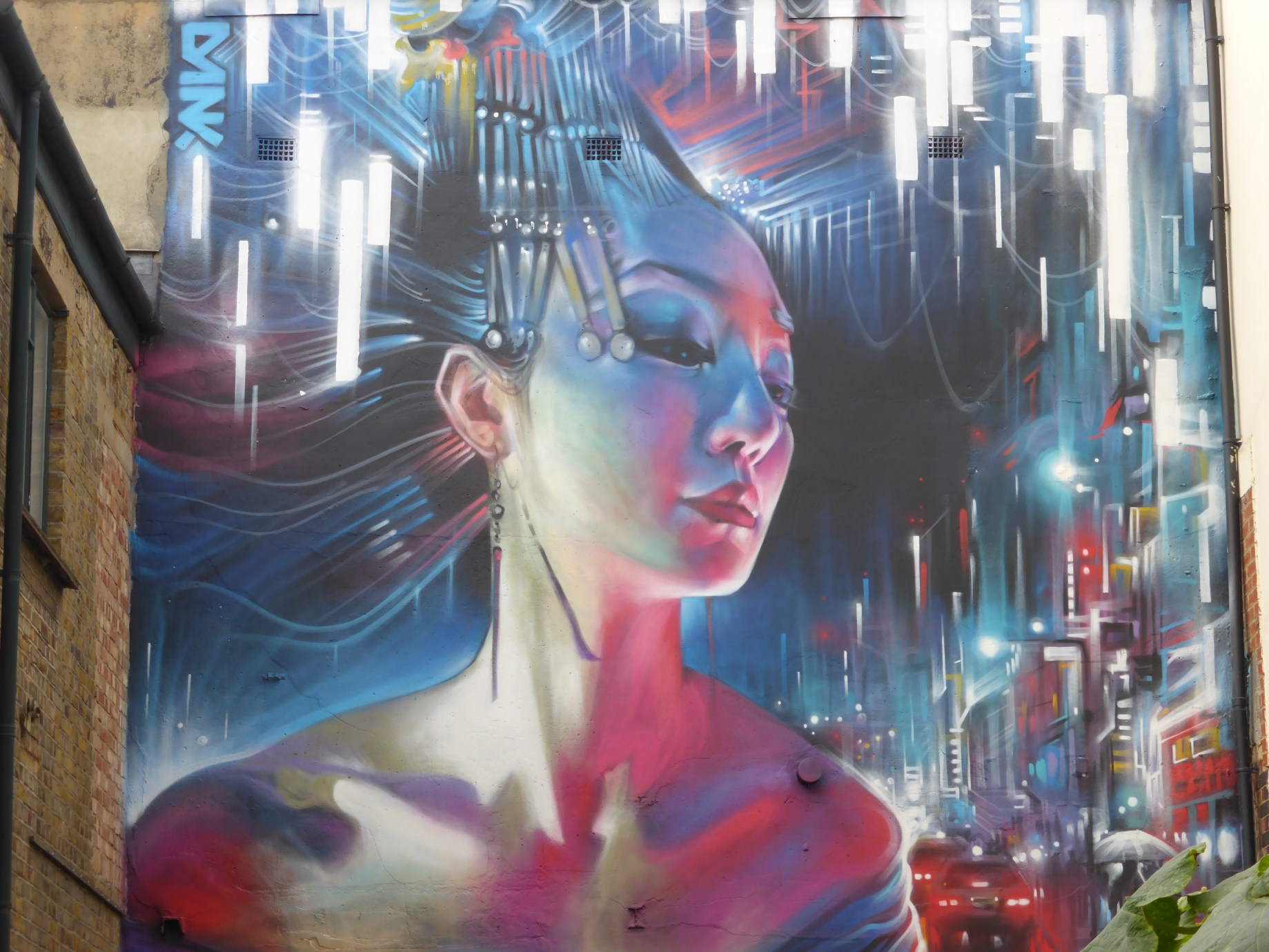 The mural is some 30ft x 20ft and was completed with the aid of a scissor lift, making for Dan Kitchener’s largest Geisha based work currently in London, with two huge ‘Liquid Lights’ cityscape works also to be seen currently in Clerkenwell and Brockley. Creating a piece that Dank had been waiting for just the right wall on which to construct this beautiful work, which is a continuation of his huge wall completed for Upfest in Bristol back in July (covered here). The piece is entitled ‘The Queen Of Neon’ in which the Geisha character, of which the image is based on photographs taken by Dank of model Ayumi LaNoire, represents the spirit of Tokyo, epitomized by the cables and neon signs entwined in her hair, becoming very much part of her construction and being. She stands proud at the centre of the city around her, the very essence of her surroundings.