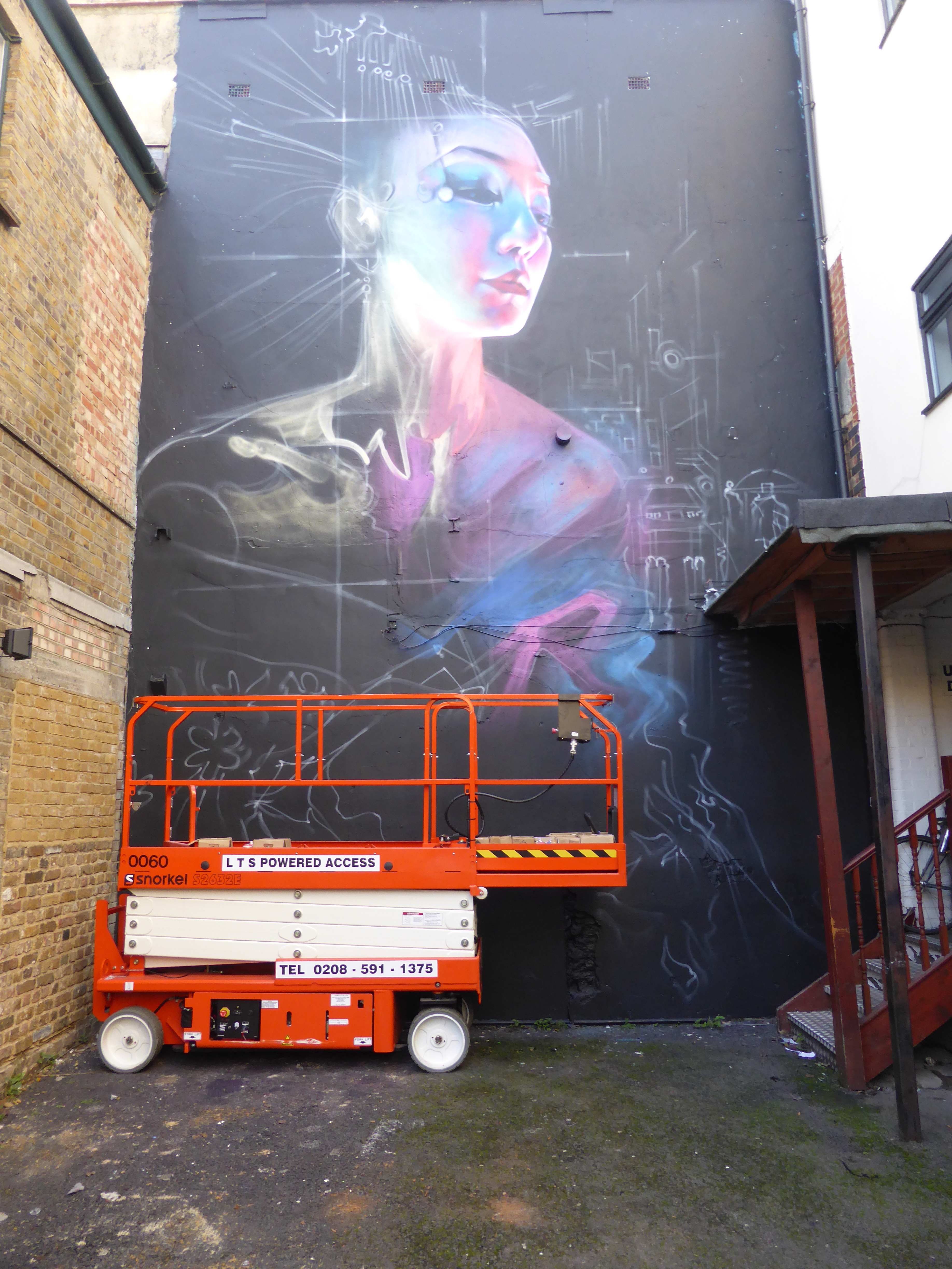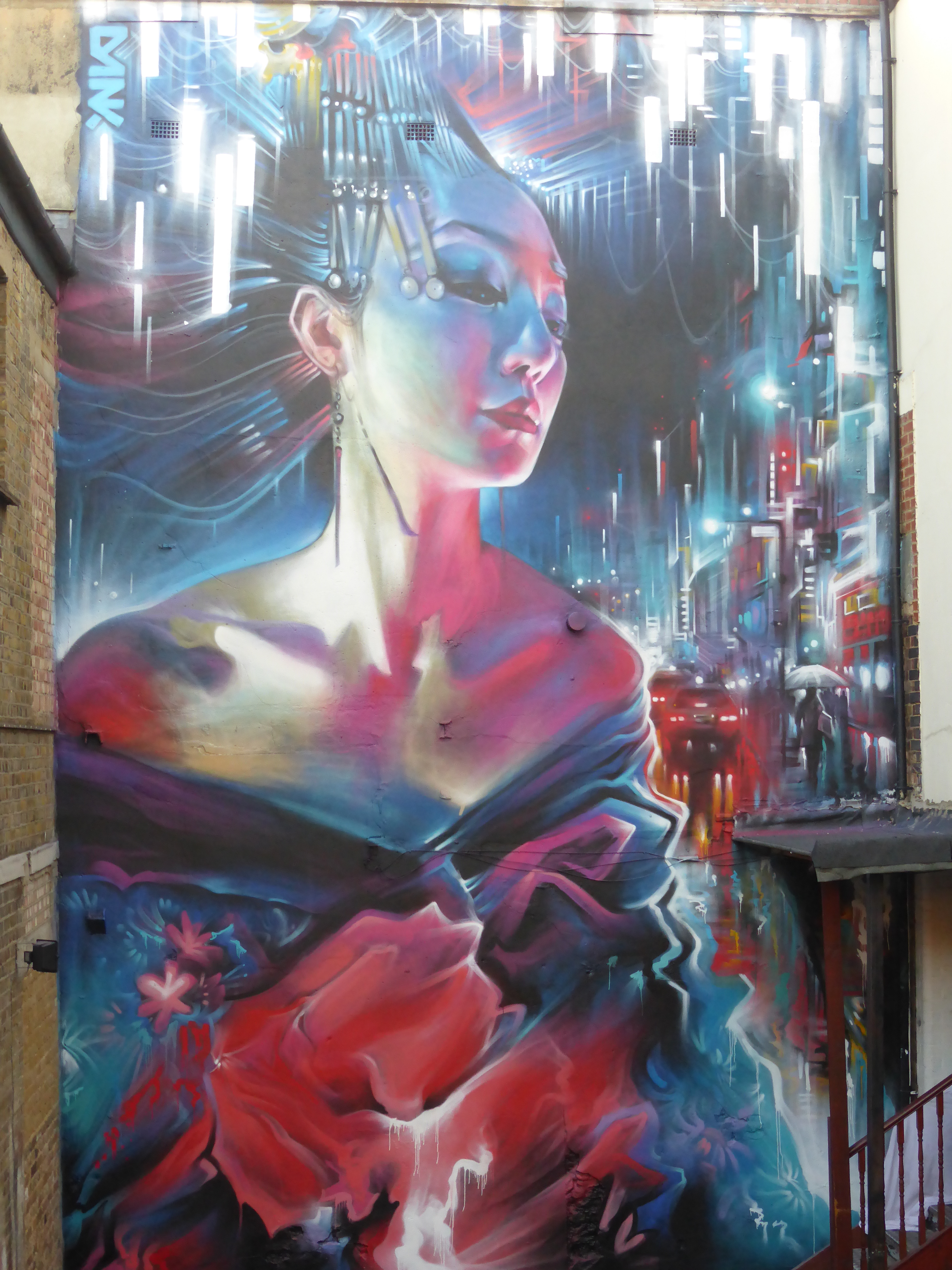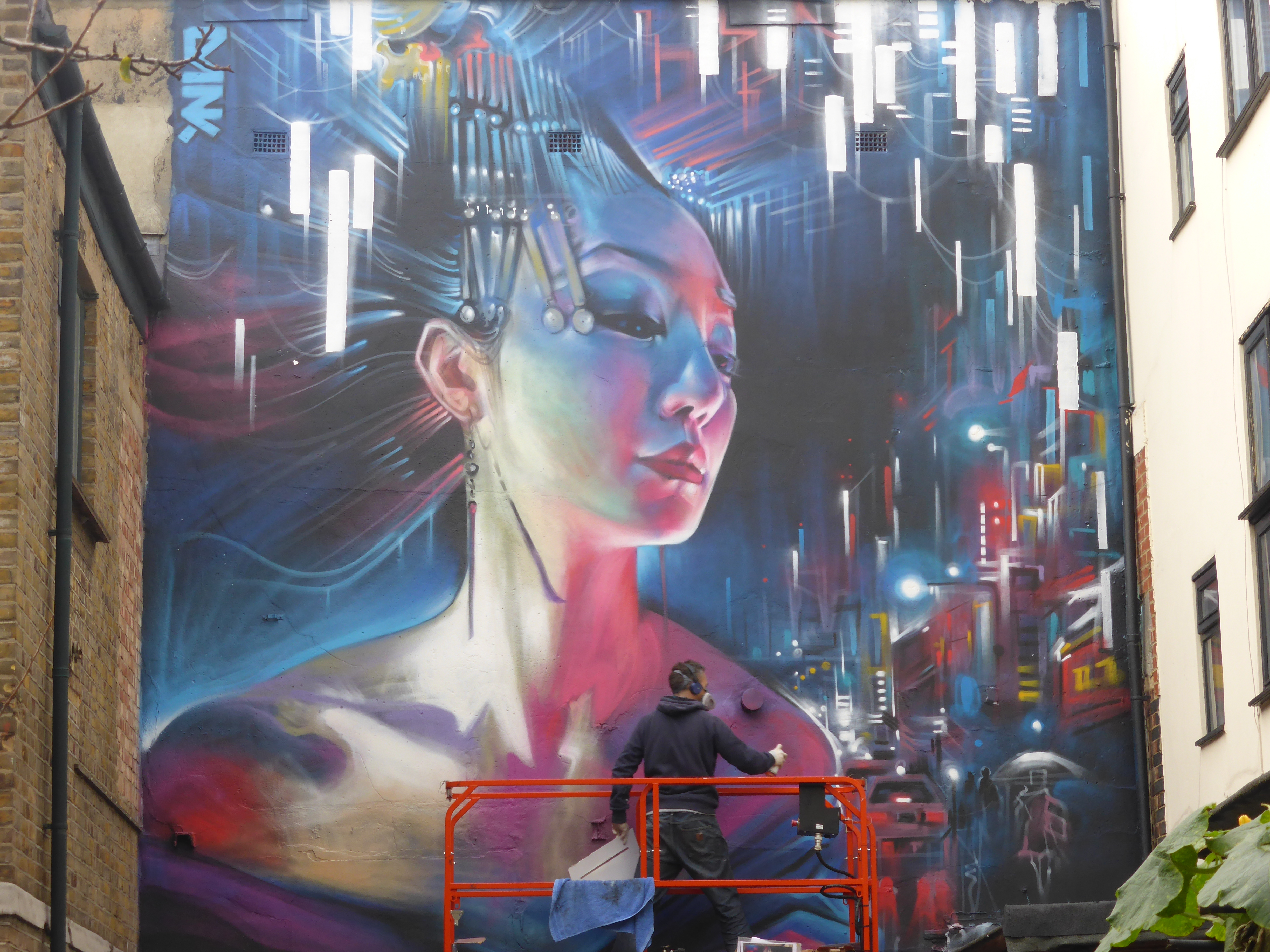 The mural is some 30ft x 20ft and was completed with the aid of a scissor lift, making for Dan Kitchener’s largest Geisha based work currently in London, with two huge ‘Liquid Lights’ cityscape works also to be seen currently in Clerkenwell and Brockley. Creating a piece that Dank had been waiting for just the right wall on which to construct this beautiful work, which is a continuation of his huge wall completed for Upfest in Bristol back in July (covered here). The piece is entitled ‘The Queen Of Neon’ in which the Geisha character, of which the image is based on photographs taken by Dank of model Ayumi LaNoire, represents the spirit of Tokyo, epitomized by the cables and neon signs entwined in her hair, becoming very much part of her construction and being. She stands proud at the centre of the city around her, the very essence of her surroundings.