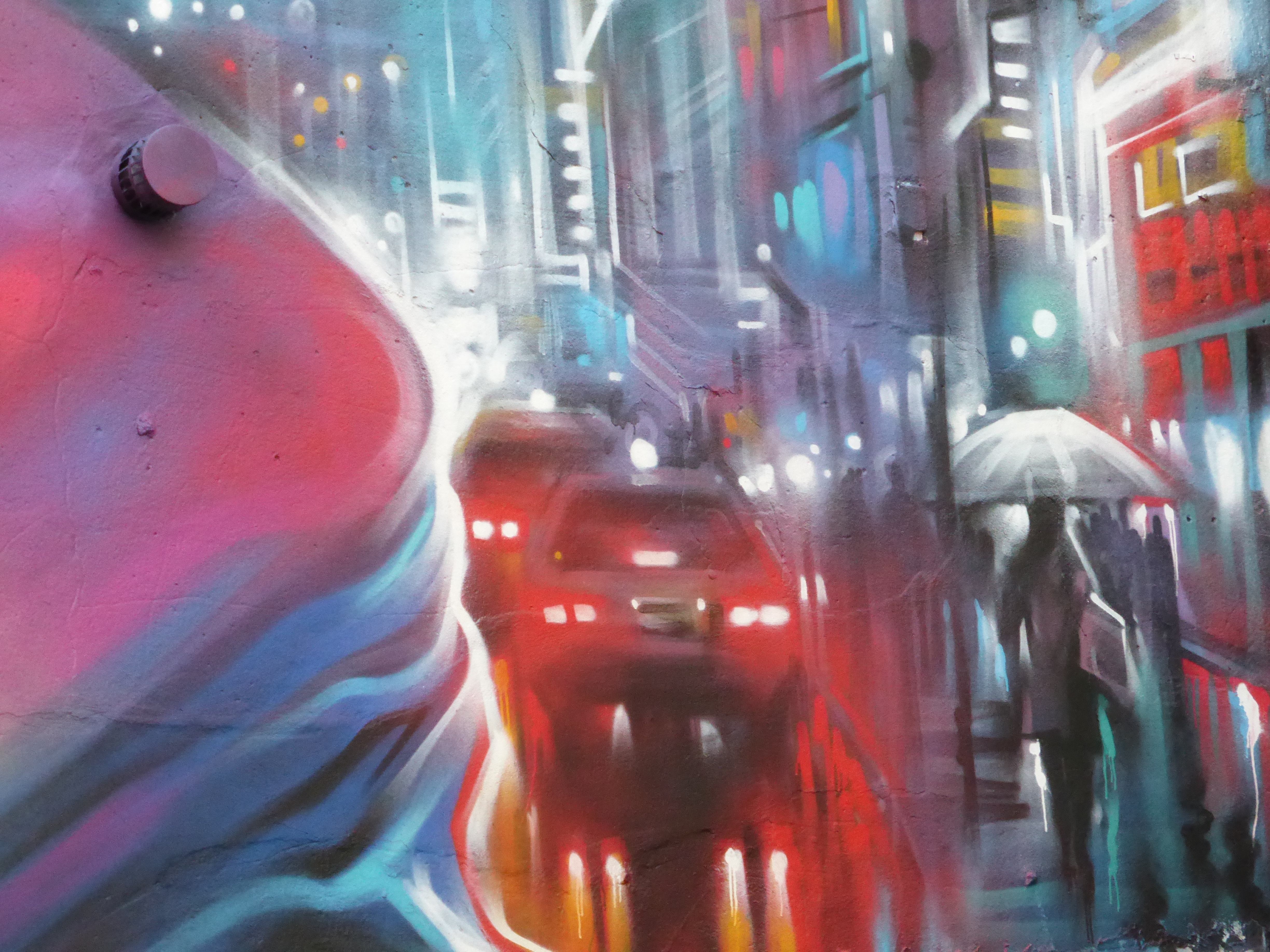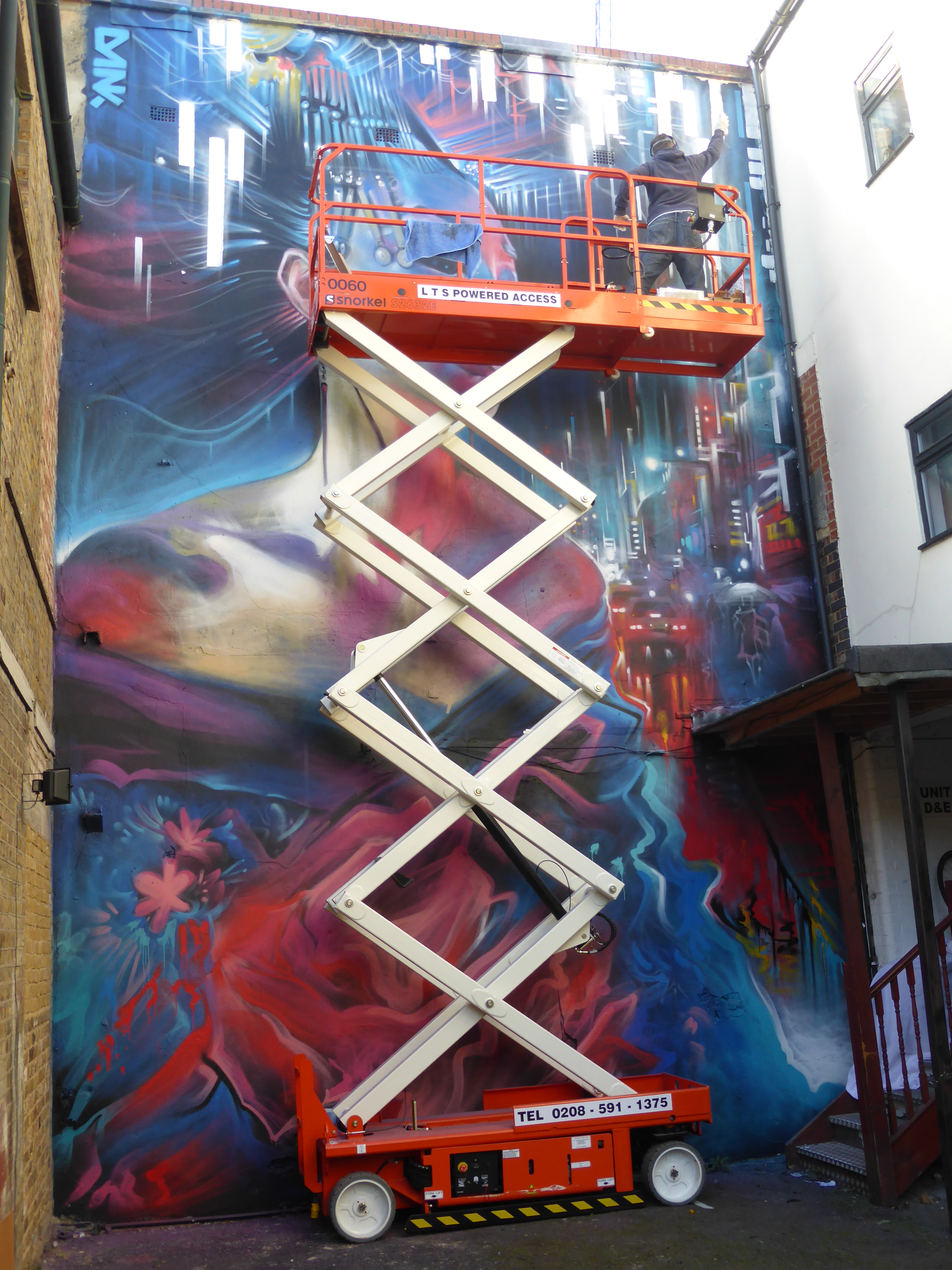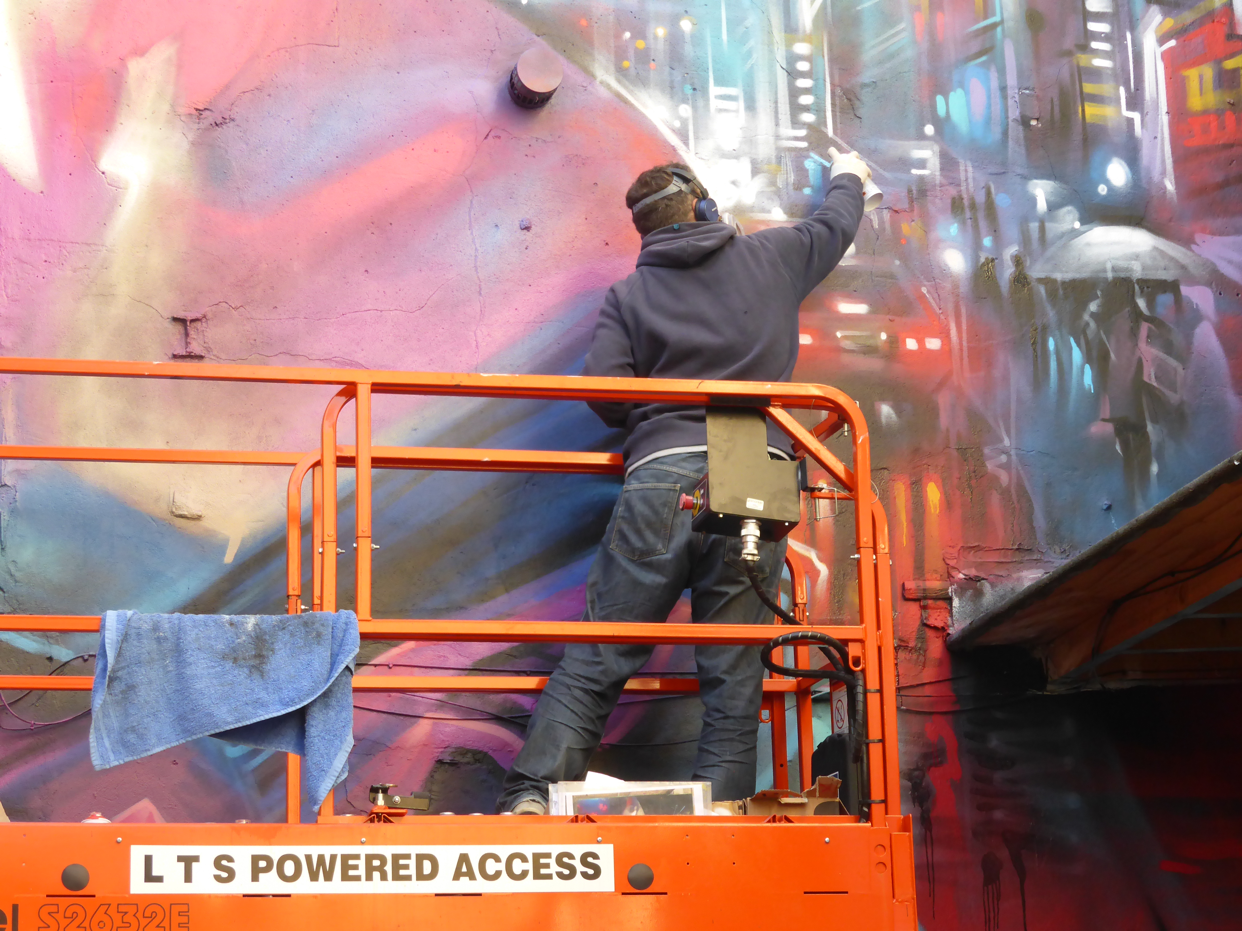 Dank adding the hanging neon lights to the top of the wall by roller, which really create a sense of depth in the piece which compliments the cityscape on the right of the image.