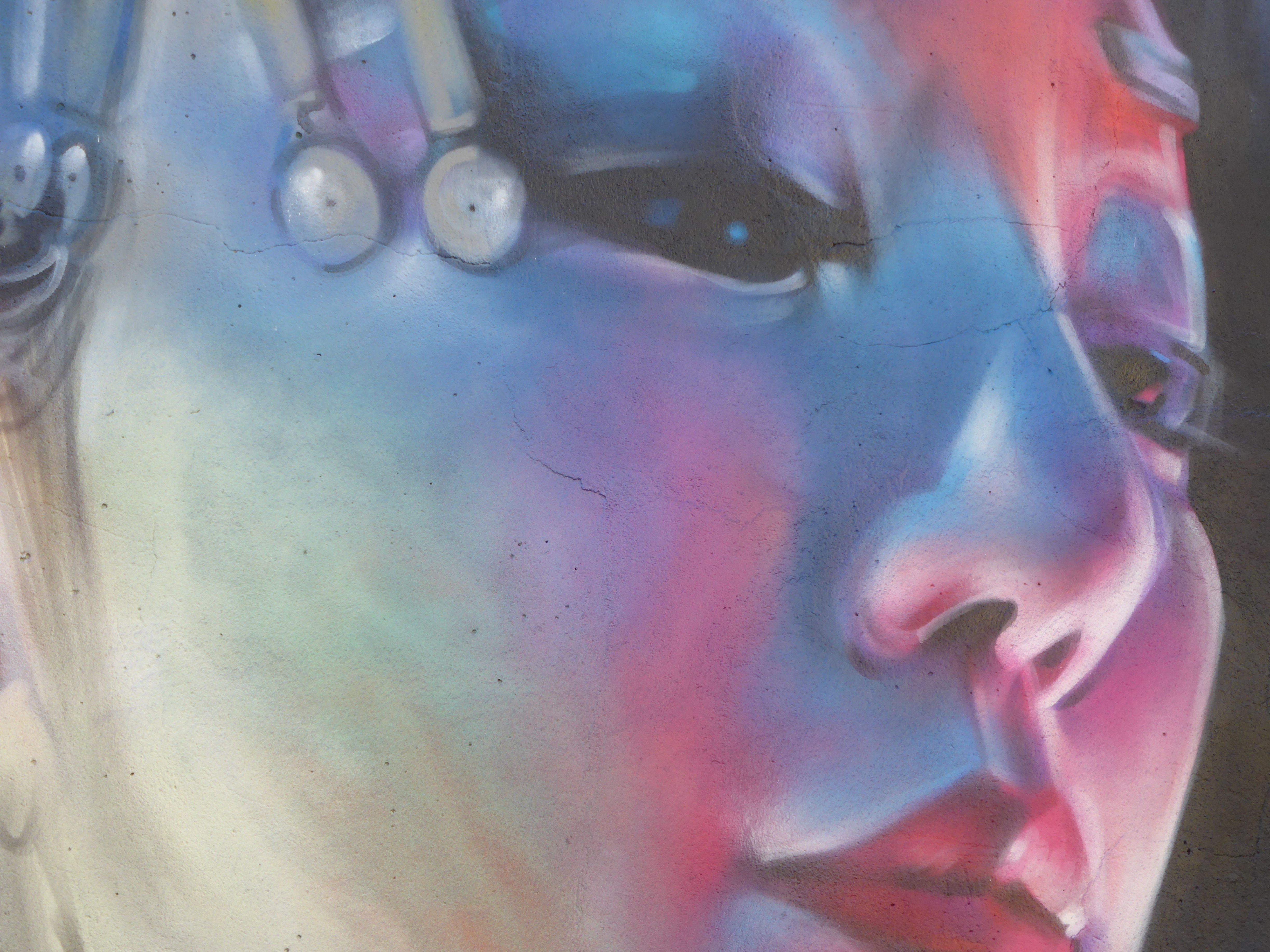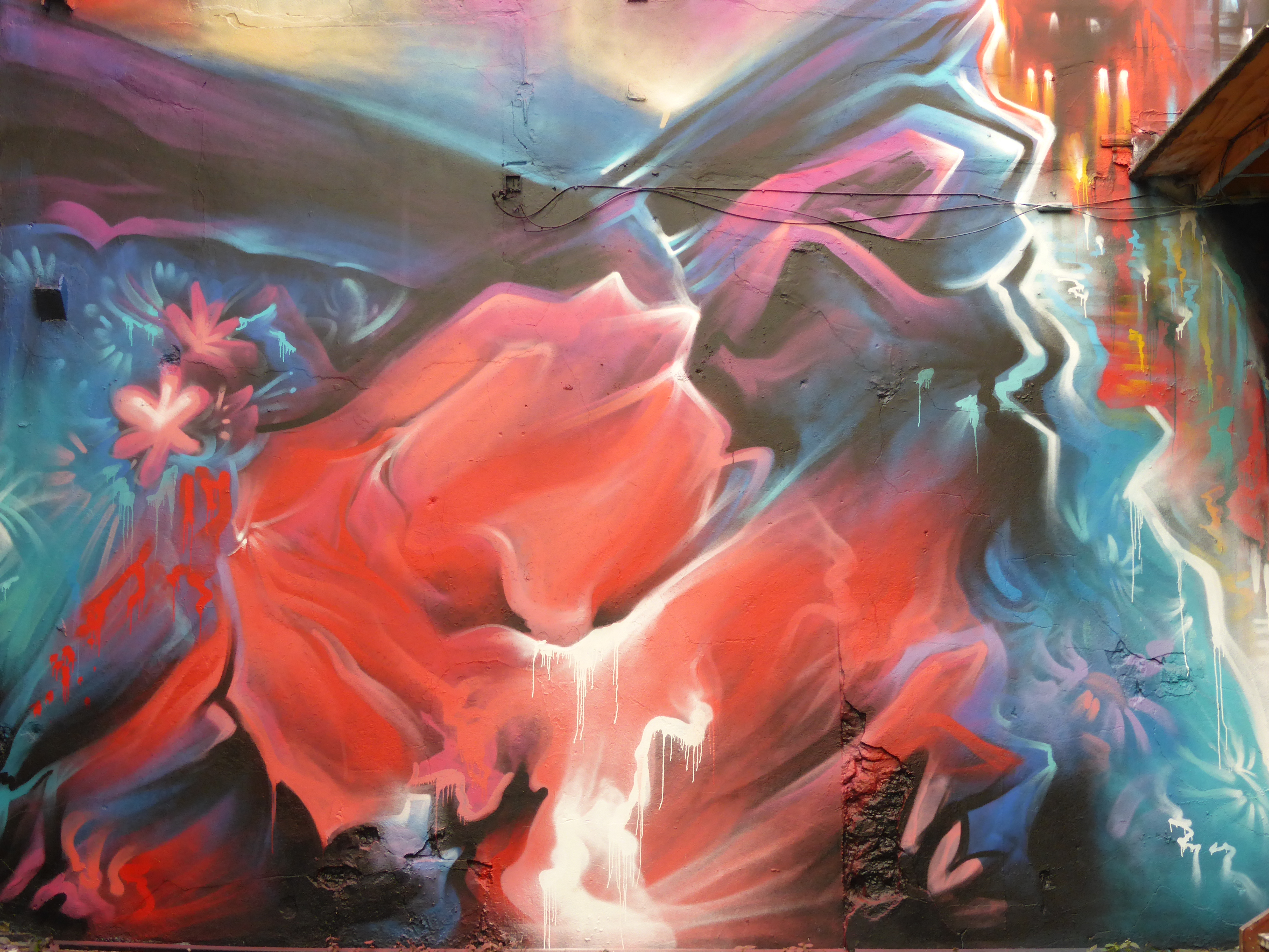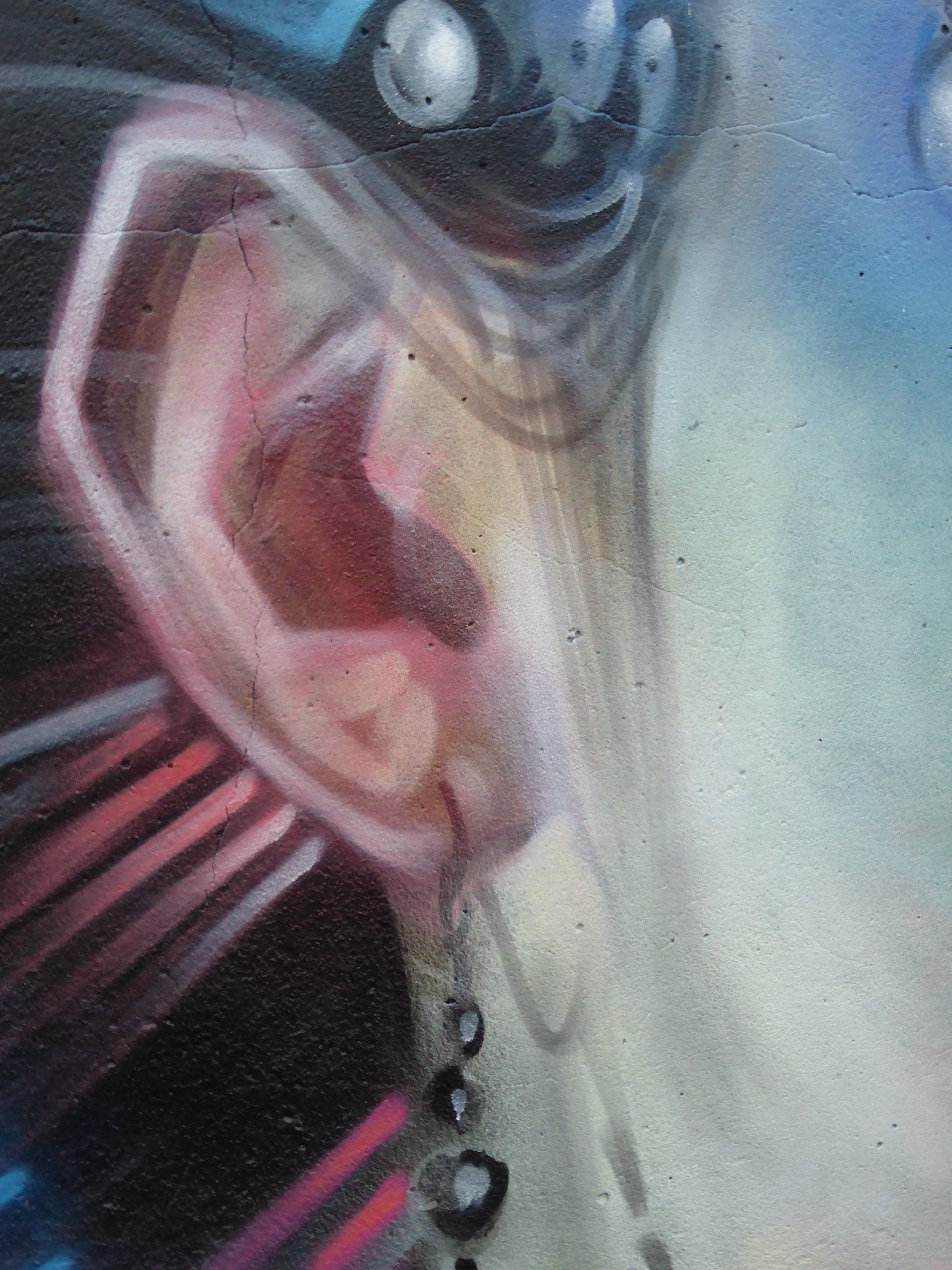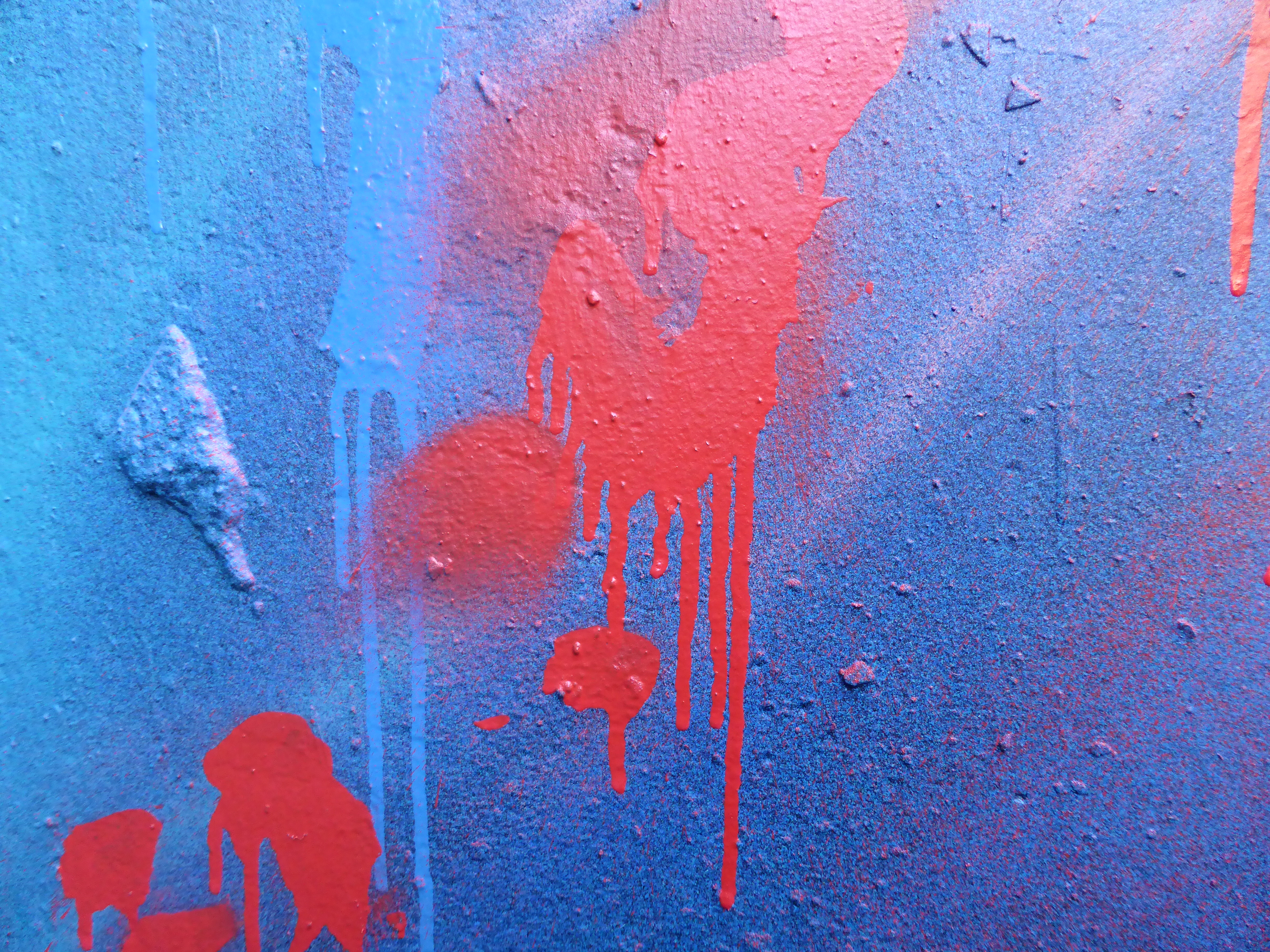 Extreme close-up which offers a glimpse in the some of Dank’s painting style, with the drip effect created by direct solid bursts of the spray can, surrounded by the more loose and fluid red mist effect from the more casual and flowing application of paint.