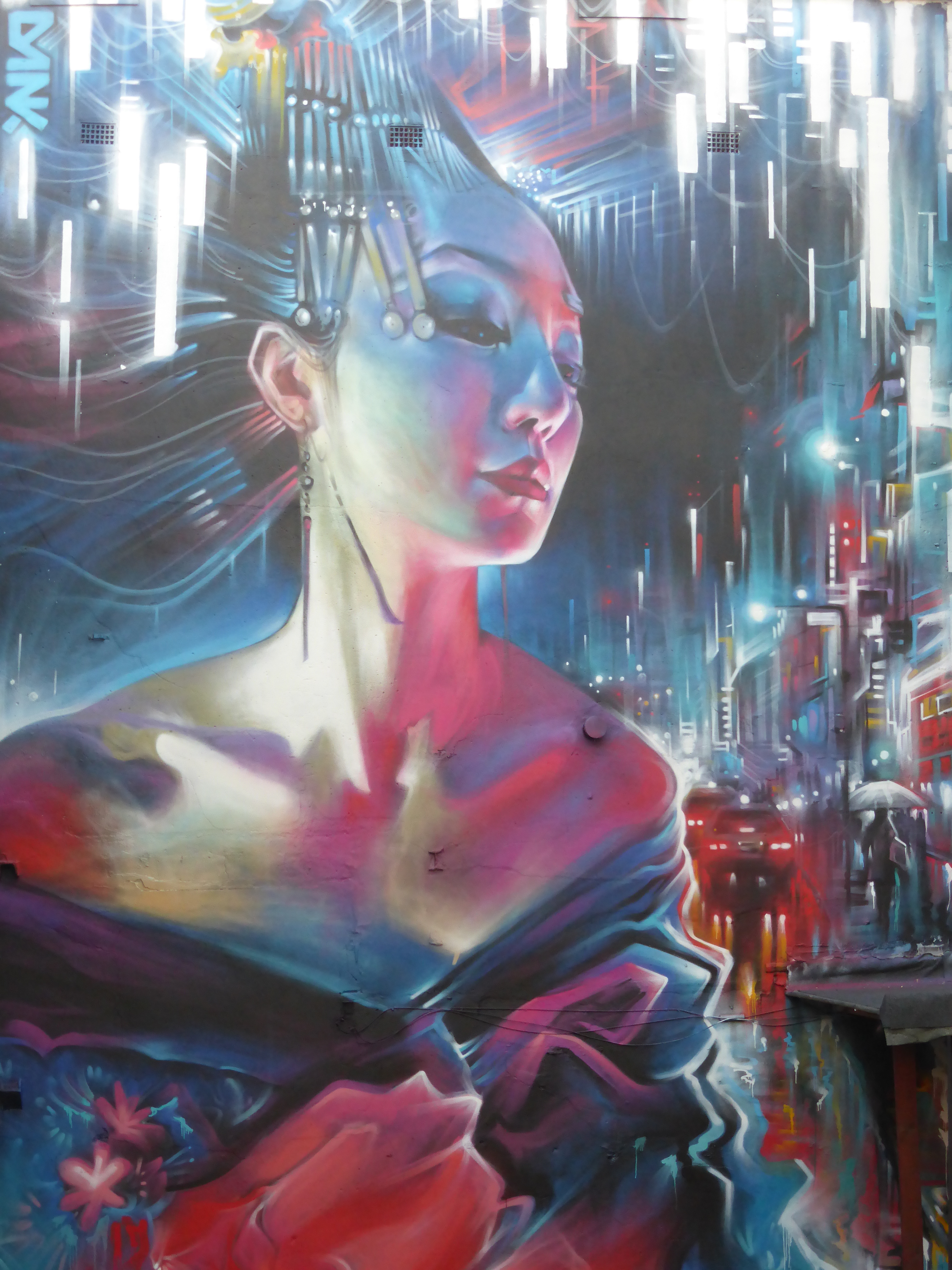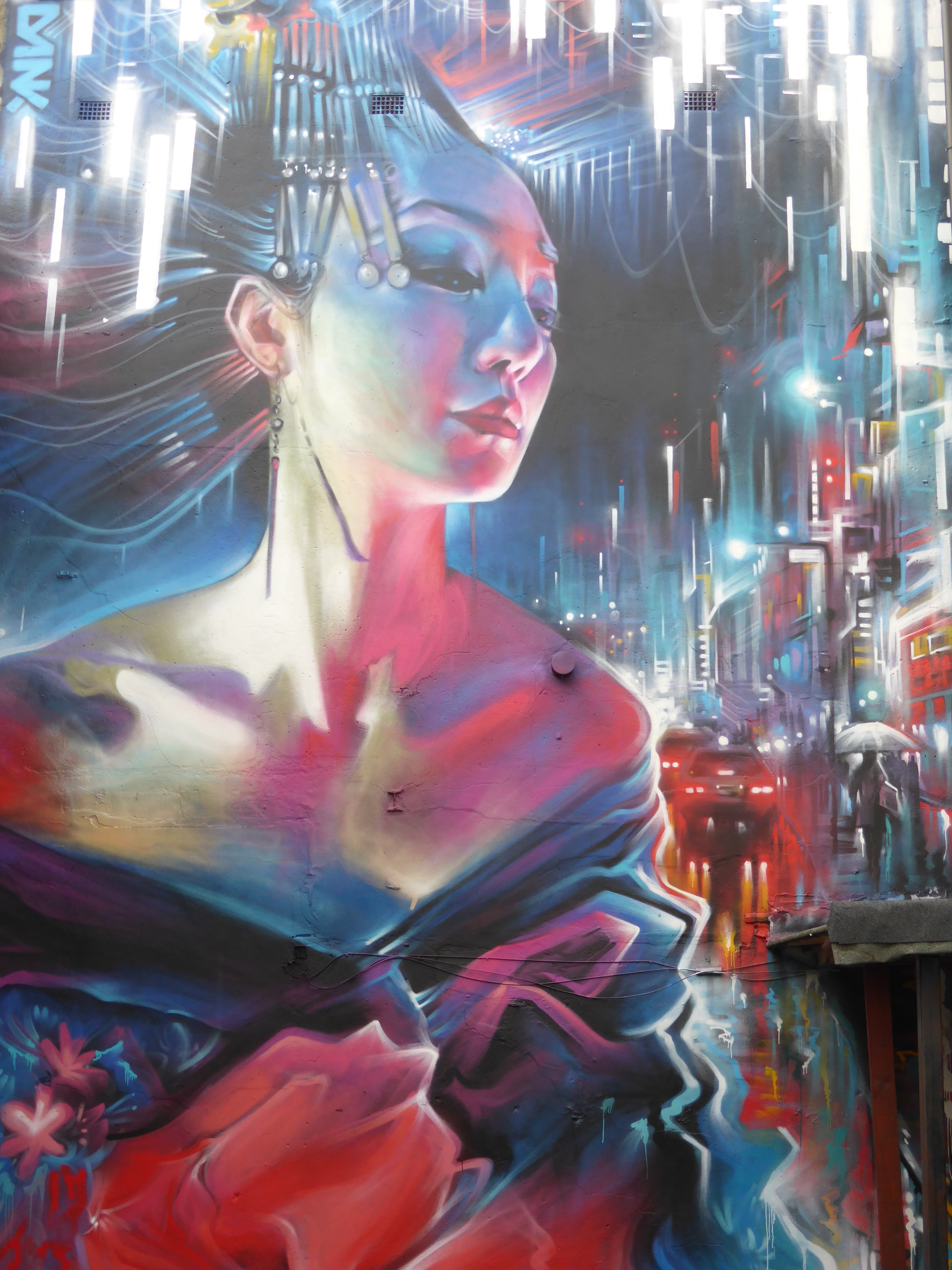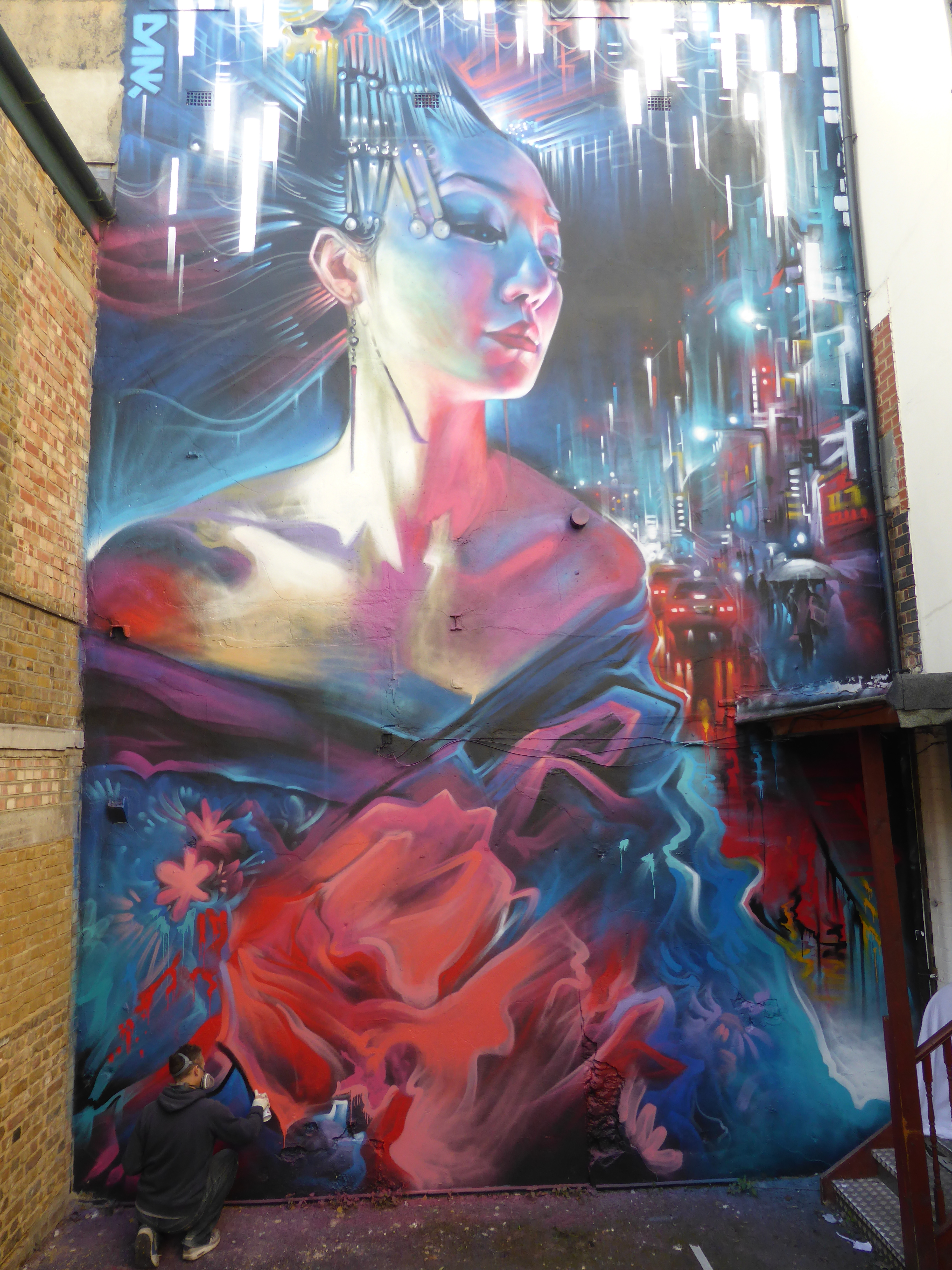 Our favourite progress shot of the work, with Dank’s Geisha giving the him a look of appearing disinterest, she is the essence of a major city and doesn’t have time for such trivial matters as someone painting.