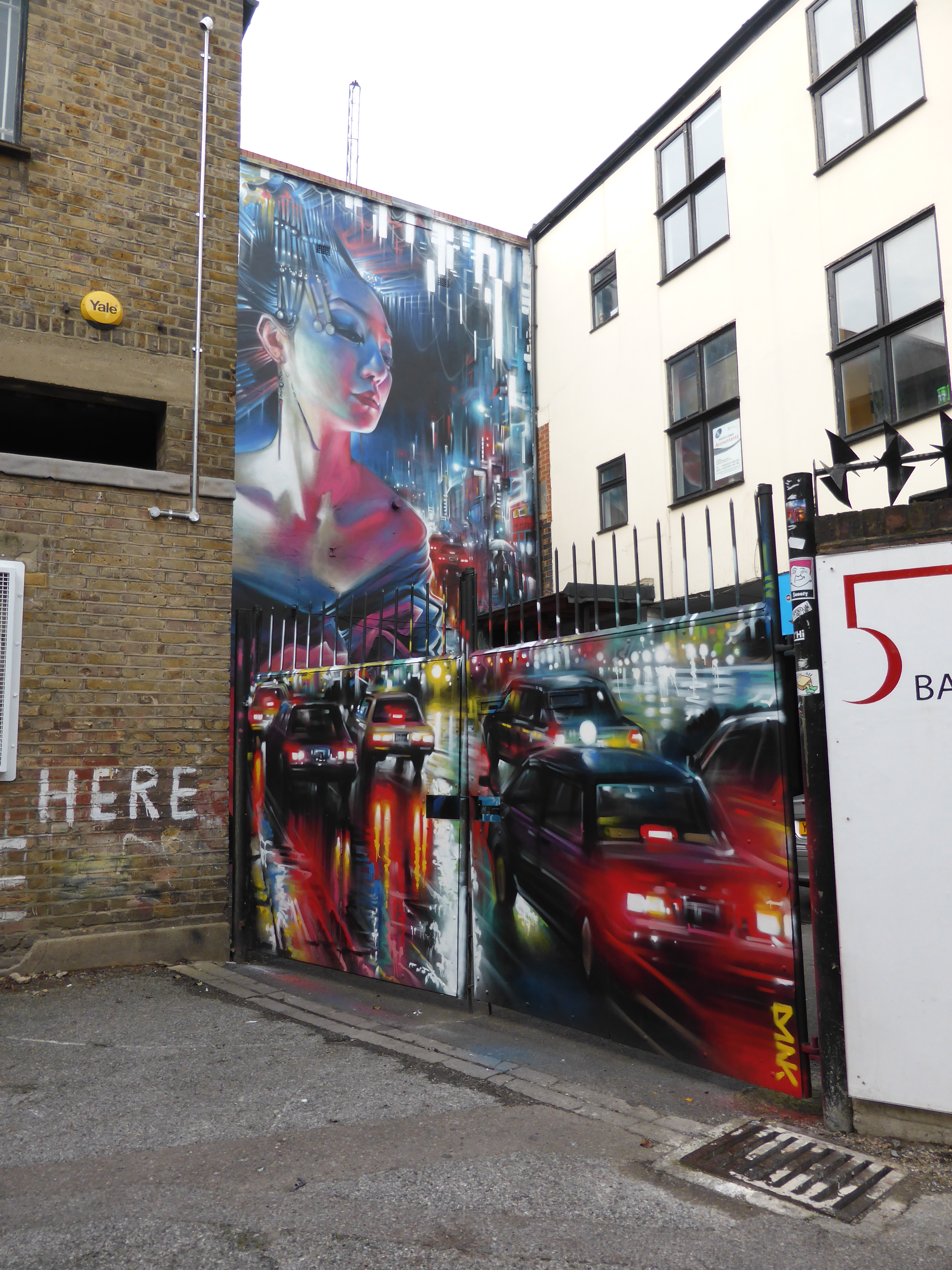 A few weeks earlier Dank had been down to paint the gates to the gallery (covered here) and it’s great how from this viewing point  the cars on the gate take the same course of direction as the traffic on the right of the larger mural behind it.
