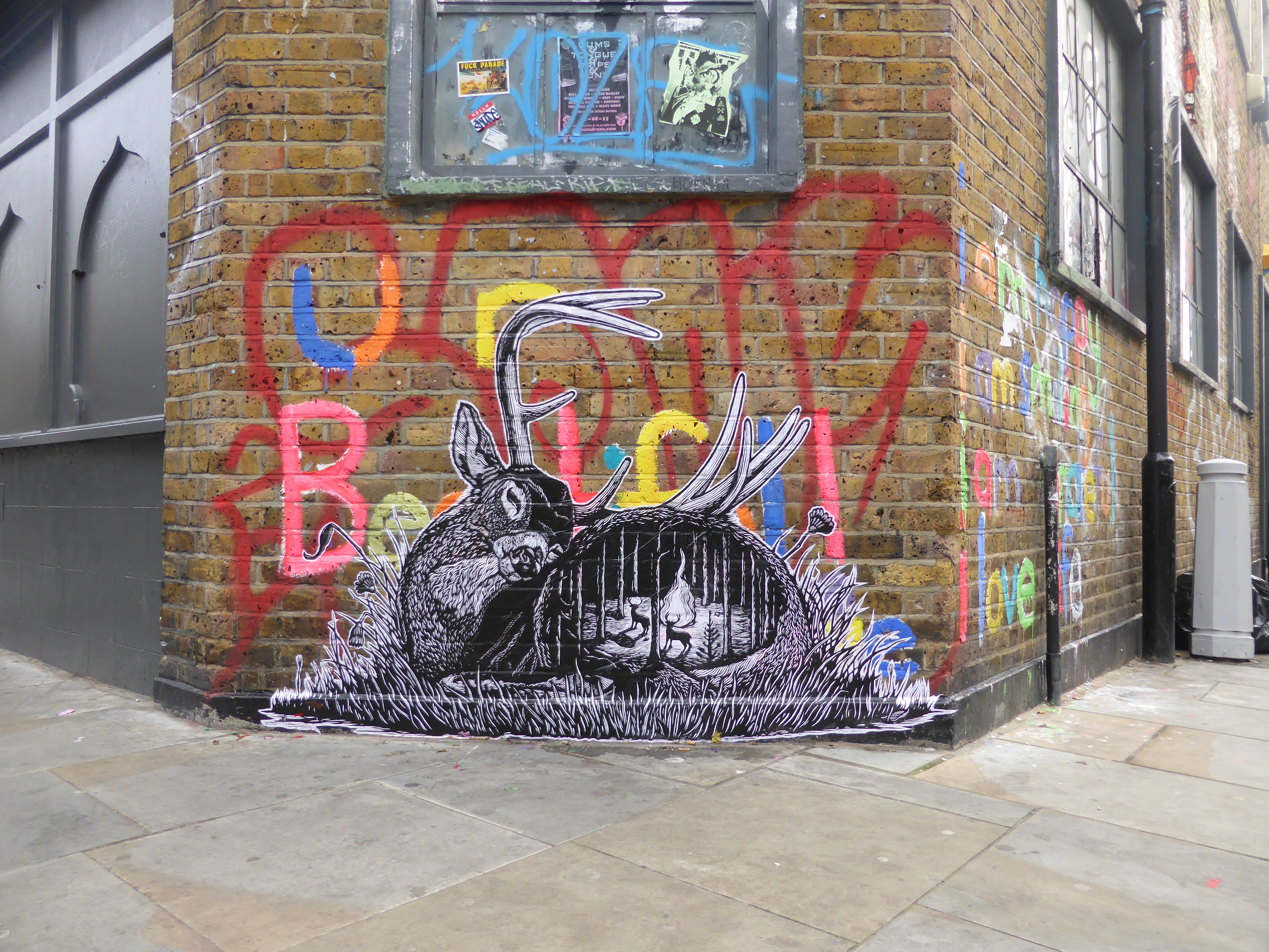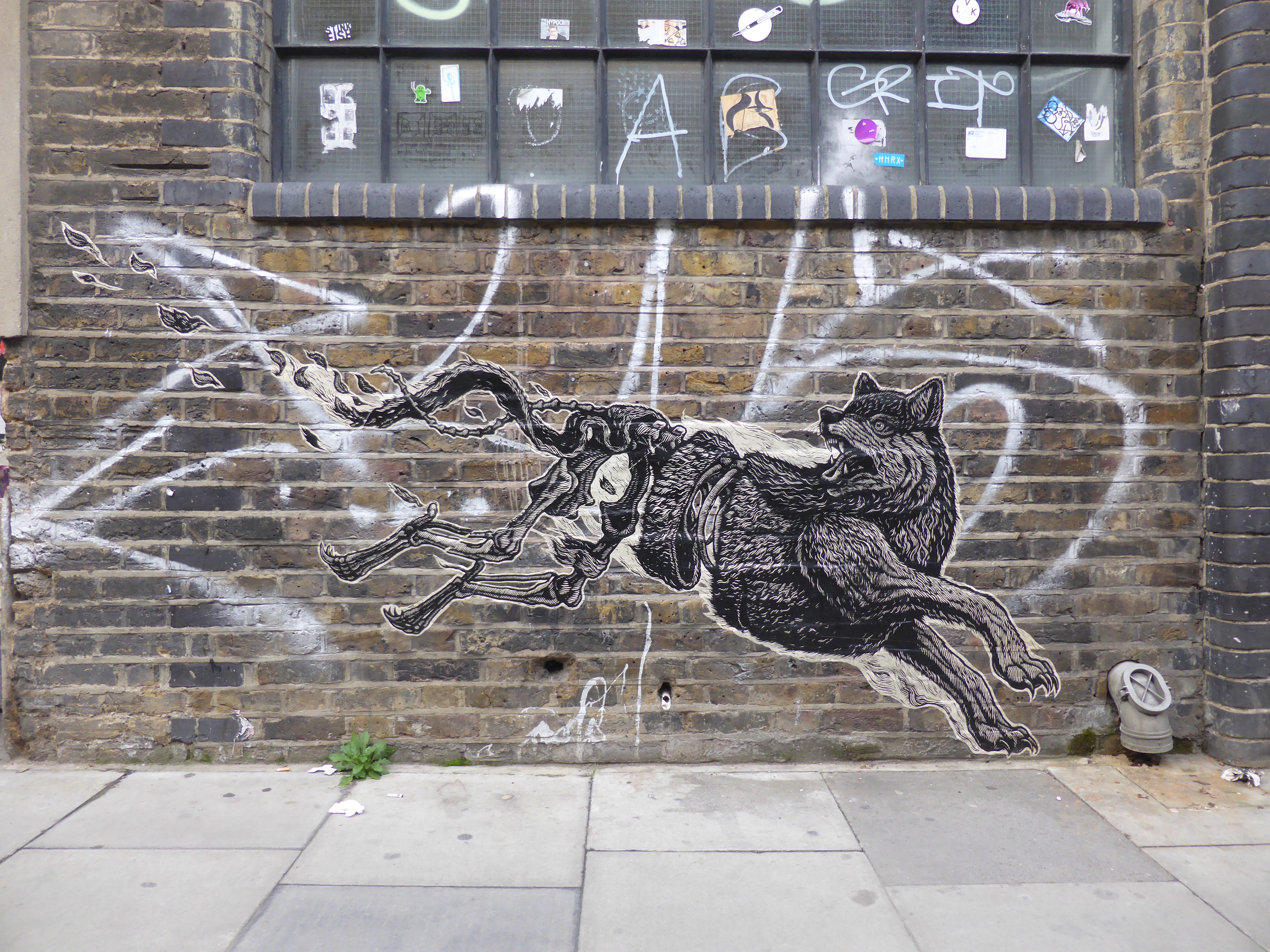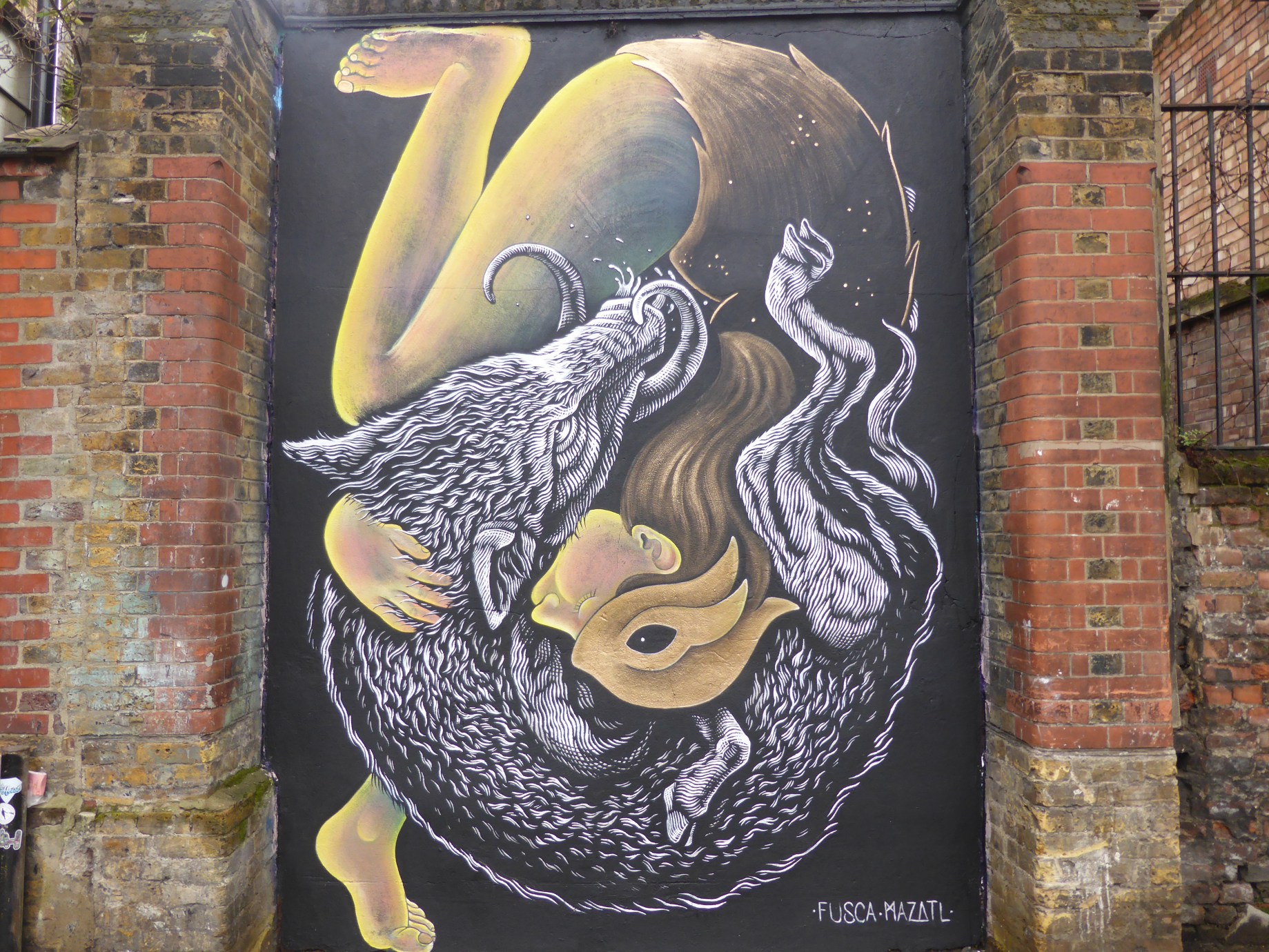 This work in New North Place, Shoreditch is a collaboration between Mazatl and fellow Mexican artist Fusca, with Mazatl creating the grey-scale boar creature and Fusca creating the primitive female character it is entwined with.