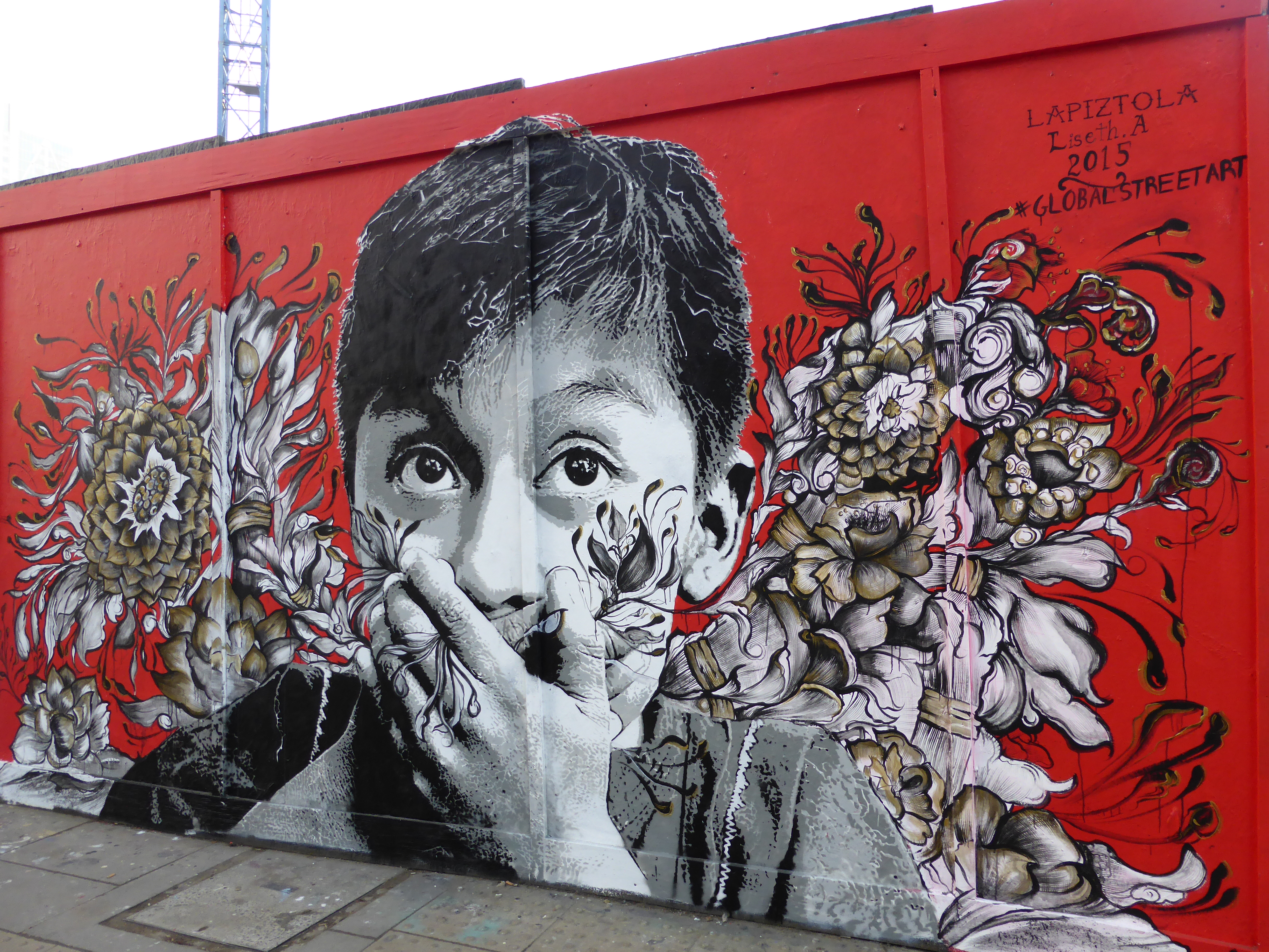 Over Wednesday and Thursday politically motivated Mexican stencil-based Street Artists Lapiztola Stencil made their second visit to London this year and with the help of artist US born, but London based artist Liseth Amaya laid out a stunning and thought-provoking work in Shoreditch. The work is in Great Eastern Street, Shoreditch.