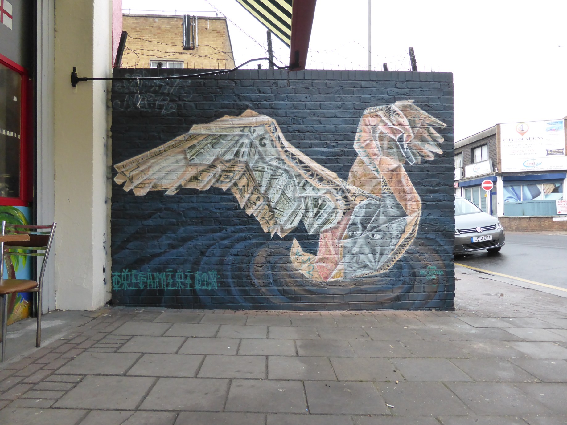 It’s been a month since we last caught a fresh piece from Airborne Mark, at that point in Shoreditch with his Origami Buffalo which was based on a design featuring a created from a folded $1 bill (covered here), and it is from that work that this follow-up piece was put together. The work is a depiction of an Origami Swan based on a design created from a $10 bill. The Swan is shown about to engage in flight from the water in which it rests, superbly reflected in colour in the ripples at the base of the swan as it literally sets to become airborne. The head, neck and chest feature the front of the $10 bill, which is primarily grey in scheme, whilst the wing depicts the reverse of the note, which features the Lincoln Memorial, which is primarily a pale peach tone.