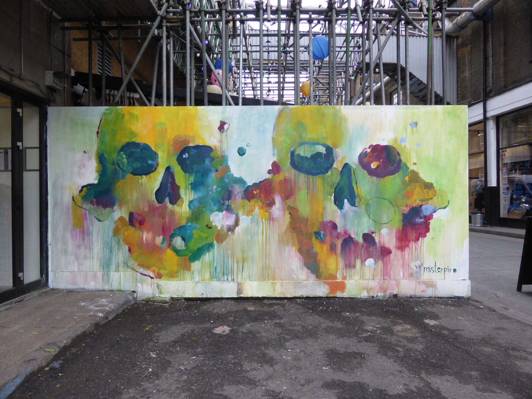 Last week Spanish Street Artist Misterpiro passed through London and hit up one of the boards in the Old Truman Brewery, Brick Lane. Born and based in Madrid, Misterpiro is an artist who works with mediums including illustration, plastic sculptures and Street Art. This painterly work placed up recently presents two skulls depicted in a soft water-colour effect, setting to create an all round sedate and calming tone. This work was put up with support from McSweeney.
