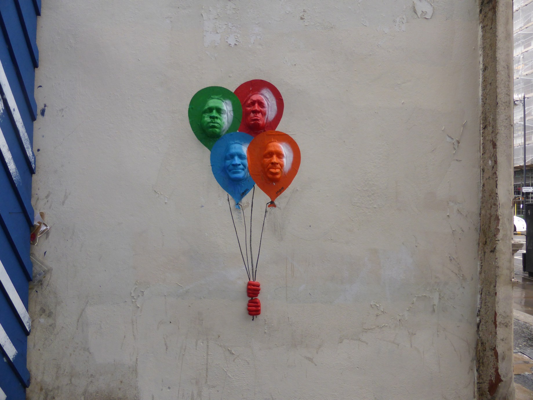 Last week French installation based Street Artist Gregos arrived in London for a whistle-stop visit and hit up several of his newest works, with a twist in approach, around Shoreditch. We have found four of the new pieces and if anyone knows of any we have missed, please let us know. The new works are interesting for their depiction in the form of a balloon. with the trademark faces surrounded with a paste-up to make the face the centre of the balloon. You can view our post on Gregos’ previous visit to London from March 2015 (covered here).