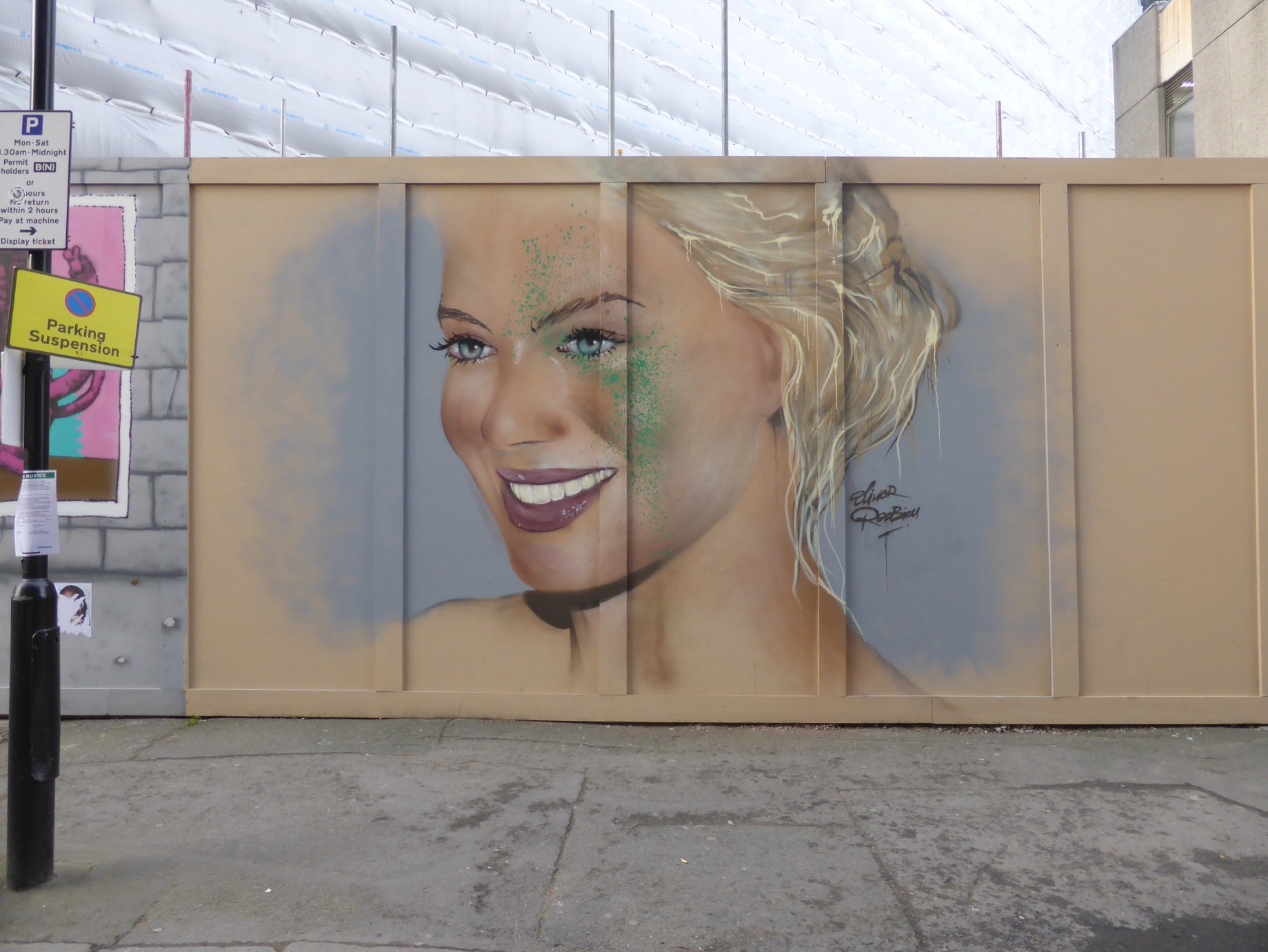 Whilst out last Sunday catching up on a few fresh works, we were fortunate enough to stumble upon Olivier Roubieu, who has been busy the last few weeks, at work on his latest work in Shoreditch. Battling the rain and early nights, Olivier set to paint what is now the second portrait in his newest approach, with the first venture into this style being the portrait of Brad Pitt put up in Leake Street a couple of weeks back now (covered here). On this occasion the subject was actress Margot Robbie who is superbly represented and then given the new treatment by Olivier, which is defined by the quite literal splash of paint, on this occasion a mixture of green and blue to compliment her eyes, through the centre of the portrait. At an initial glance this addition gives the impression of the work having been defaced, adding a sense of chaos to an otherwise clean and delicate work. We have enjoyed witnessing the creation and finished articles from both of Olivier’s new dynamic and look forward to seeing where he takes this in 2016. This work can be found in King John Court, Shoreditch.