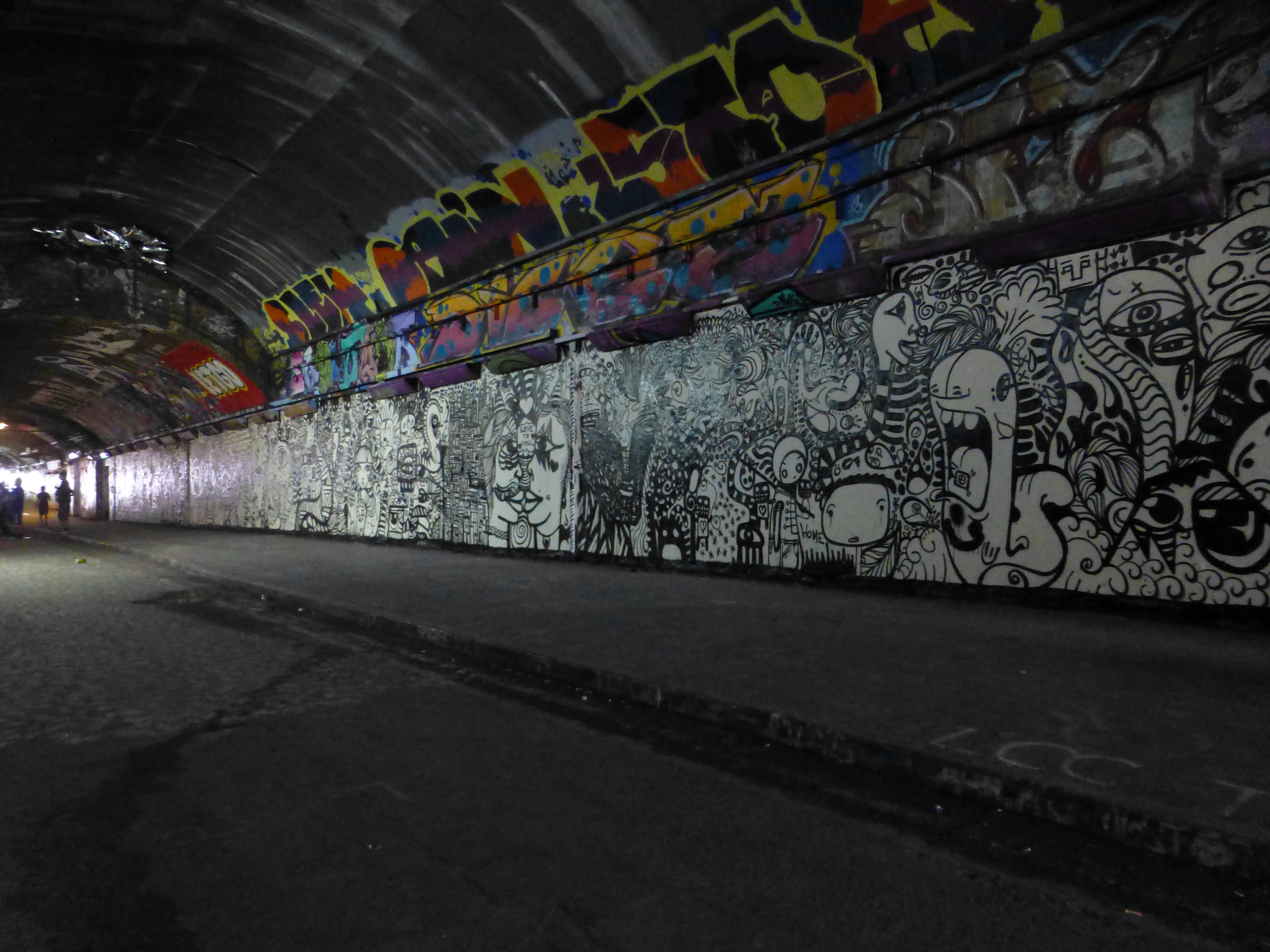 Work by Psychodoodlz in Leake Street, whose members Marc Craig, Kednog, Aly Williamson, Nolij, Fortress and New Art Rioter in the last week of October set to paint the first of what would be many murals or works on the ceiling of the tunnel. You can view more images and some progress shots in our post on this piece (covered here).