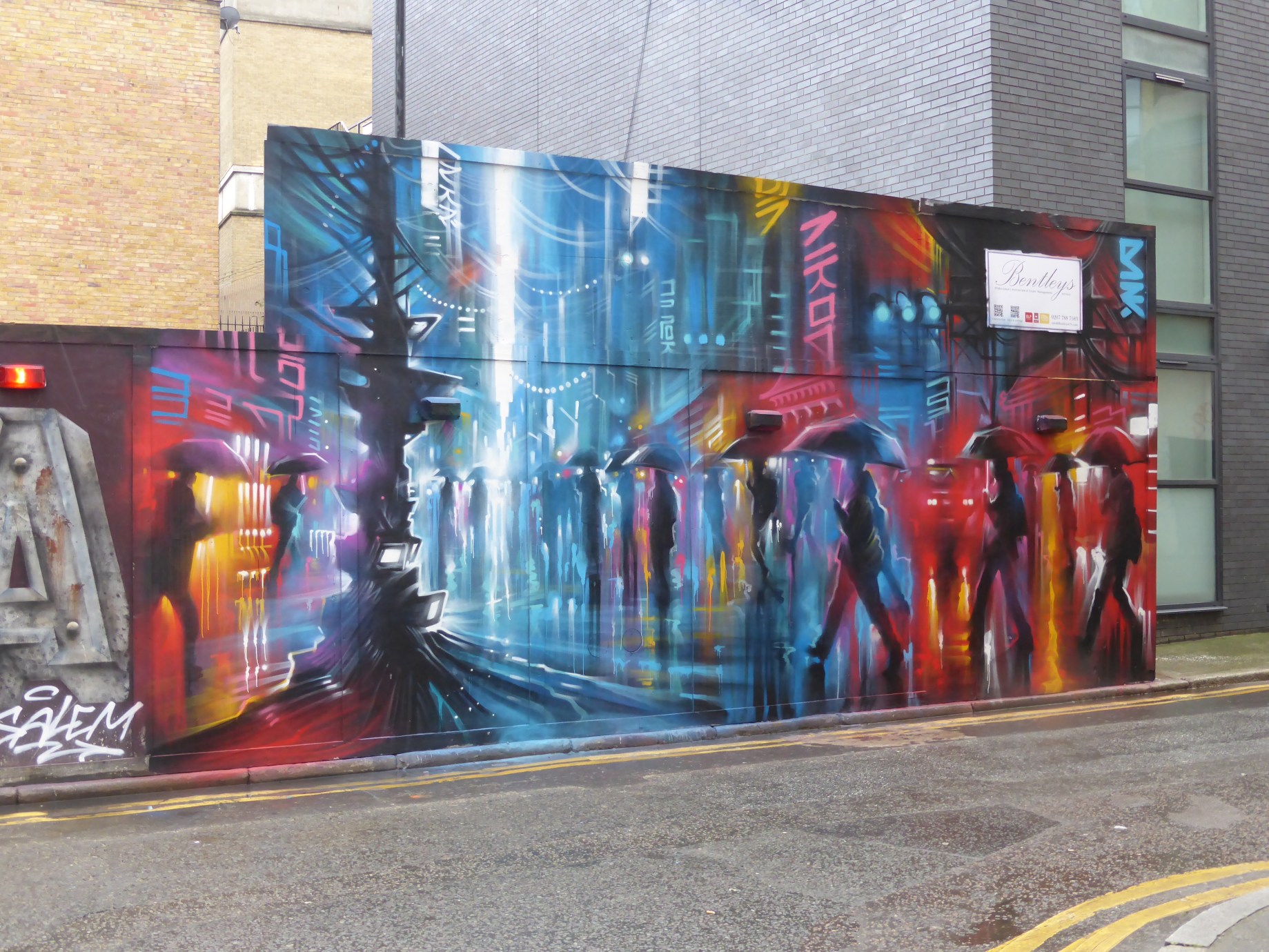 A passer-by out in the rain and seemingly walking in to Dan Kitchener’s ‘Downtown’, showing just how much depth-perspective this work offers.
