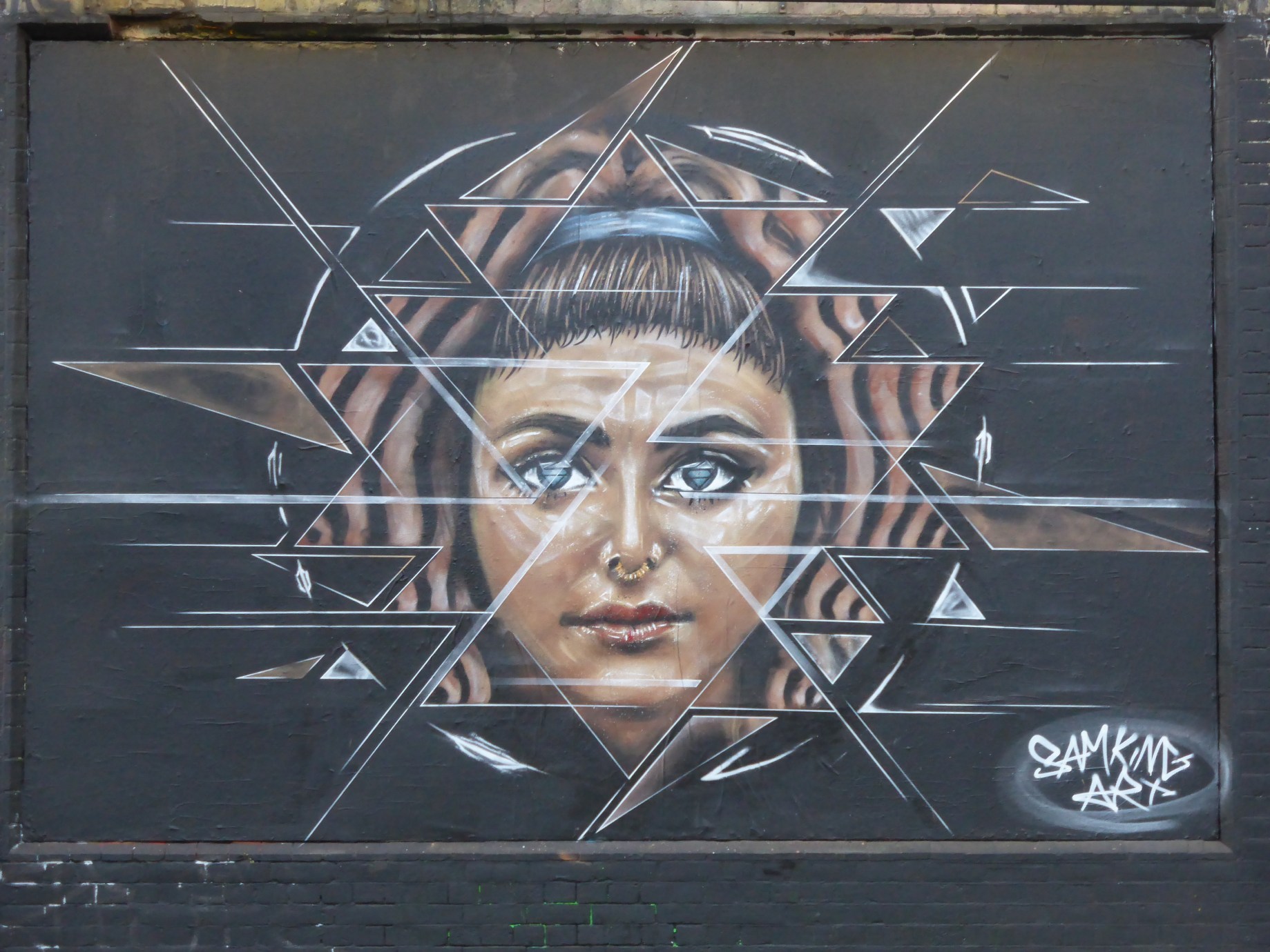 Last week in the East End Street Artists Sam Cox aka The Doodle Man and Sam King painted the four panels comprising the Shoreditch Art Wall along Great Eastern Street, with The Doodle Man painting the first three panels and Sam King painting the fourth and final panel. This combination of artists here certainly made for a diverse pairing with The Doodle Man painting his distinct ‘doodle’ like chaotic images, creating a scene of innocent fun, and Sam King painting a beautiful portrait, creating a spiritual aura which is a stark contrast to the sense of whimsy in The Doodle Man’s work. Sam King’s work ‘Eastern Symbolism’ is certainly a striking piece, blending elements from Hindu Mandala and the Sri Yantra, expressed through the female form and presented in a style of geometric fueled futurism. Unsurprisingly the pair spent a few days at work on their respective sections of the wall and unfortunately as of yesterday the works were set to be replaced by the next works or adverts to appear on this spot.