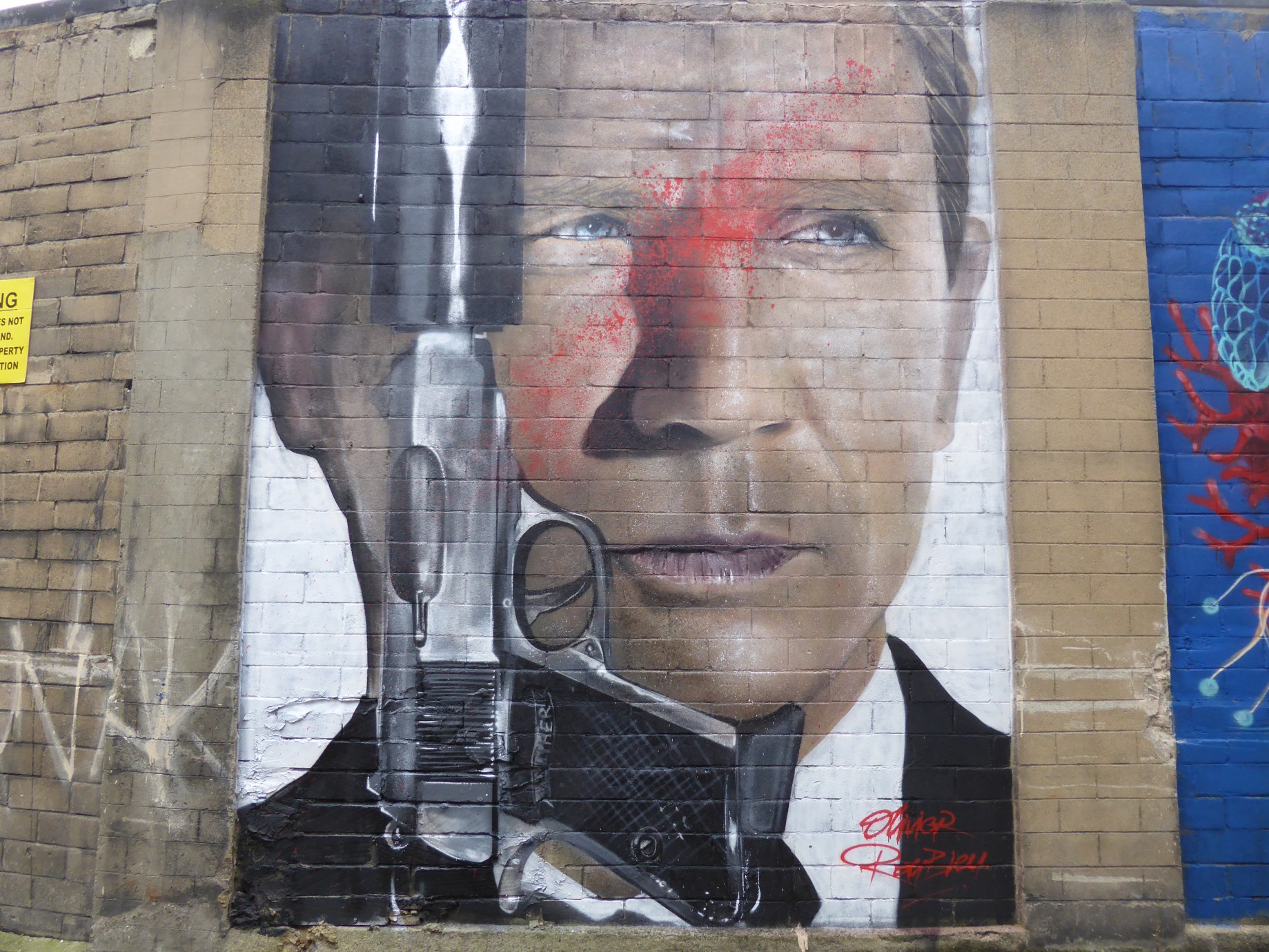 Last week Street Artist Olivier Roubieu over the course of a couple of days in Tooting set to create his latest portrait work and add one of the latest additions to the rapidly growing set of Street Art murals in Tooting. Olivier Roubieu has certainly being proactive over the last five to six weeks, and this piece marks his fifth work in his new style. On this occasion the subject is actor Daniel Craig as James Bond making red certainly the most appropriate choice for Olivier’s splash of colour. At an initial glance this addition gives the impression of the work having been defaced, adding a sense of chaos to an otherwise clean and delicate work. However it is the spontaneous and unique dynamic to this new addition we love most, with no two splatters being the same, even if Olivier repainted the base portrait identically, you wouldn’t be viewing the same piece as is below, once he adds that splash of colour. This work was put up with support from The Real Art of Street Art & Irony.