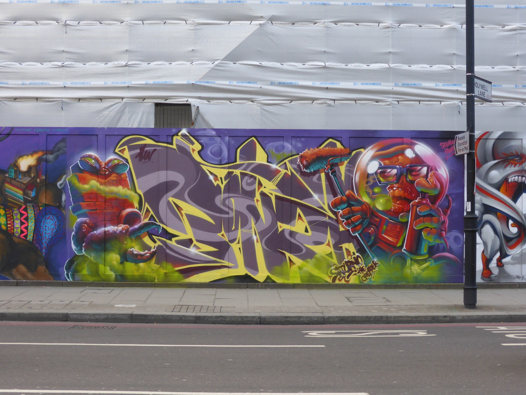 Last Wednesday on the newest set of hoardings along Great Eastern Street, Shoreditch, a fantastic Graffiti collaboration was placed up by English Writer Bonzai and visiting Spanish character artist Saturno (The CREATTER), a work that certainly stops you in your tracks. Dave Bonzai is a London based Graffiti Writer, who is most notable for his sheer range and diversity in his letter styles and fills, whilst Barcelona based Graffiti Artist Saturno paints hyper-realistic depictions of sci-fi and horror based characters.