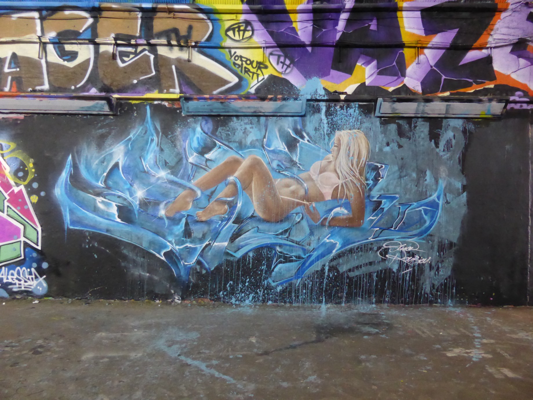 On Sunday just gone prolifically active Street Artist Olivier Roubieu created his latest London work in Leake Street, and a lovely piece it is at that. The work features some really ‘popping’ graffiti coloured to a powerful blue scheme that really seems alive, locking around the female subject set in the centre of the piece, all punctuated, with those now all so familiar, but still exciting splashes of paint which tie his pieces together