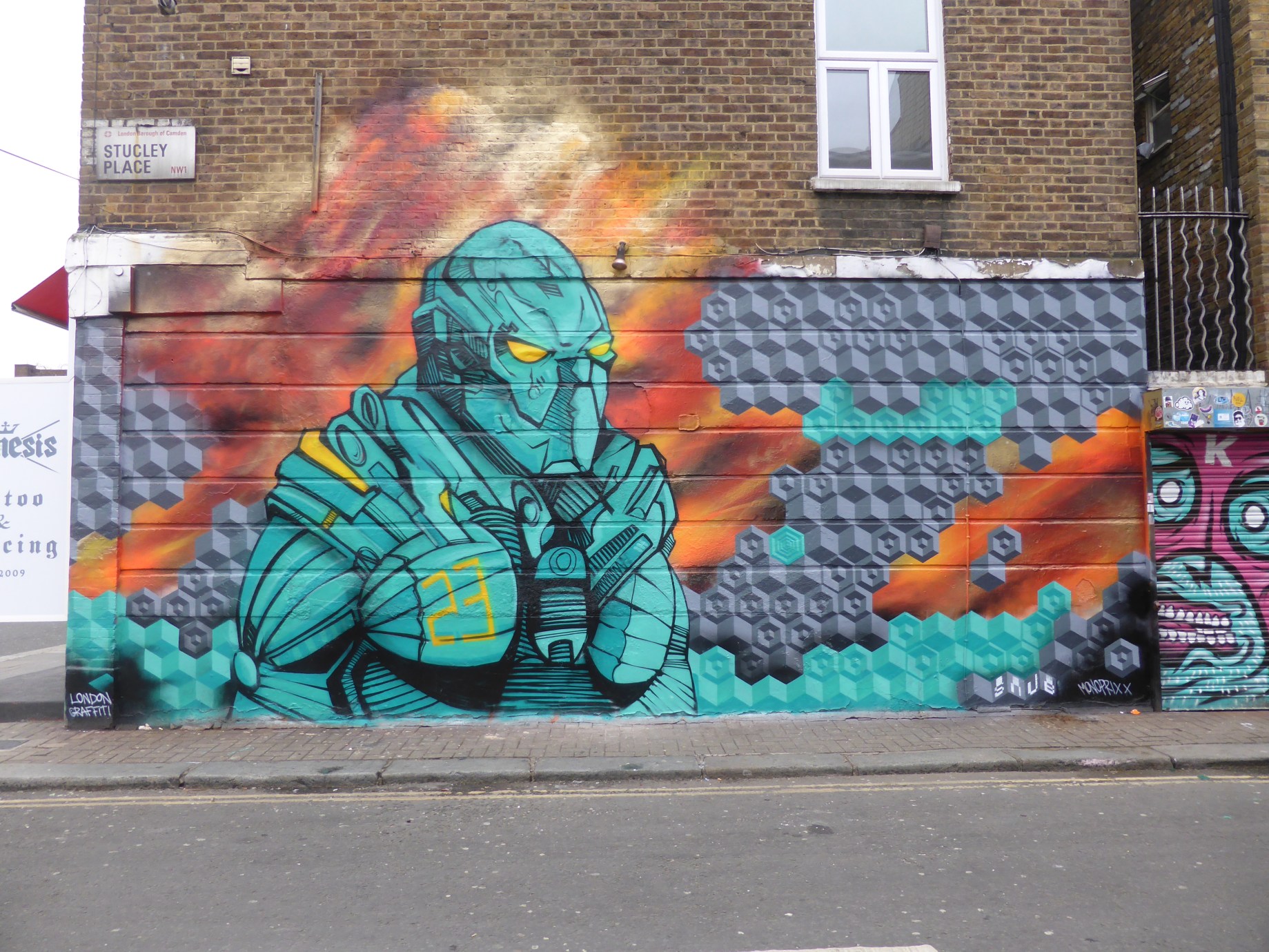 For this work in Camden Town Snub23 worked with a combination of stencil techniques for the industrial block background and freehand techniques for his main character and fiery additions. Snub’s feature character ‘Mongrel’, from the ABC Warriors – from the comic strip 2000ad takes centre stage seemingly bursting through the wall in a scene of hellfire tearing apart the almost mechanic links that form rest of his work, setting to really add a sense of depth and chaos to this wall. This work was put up with support from The Hidden Streets Of London and Monoprixx and adorns the wall of Nemesis Tattoos in Stucley Place, Camden.