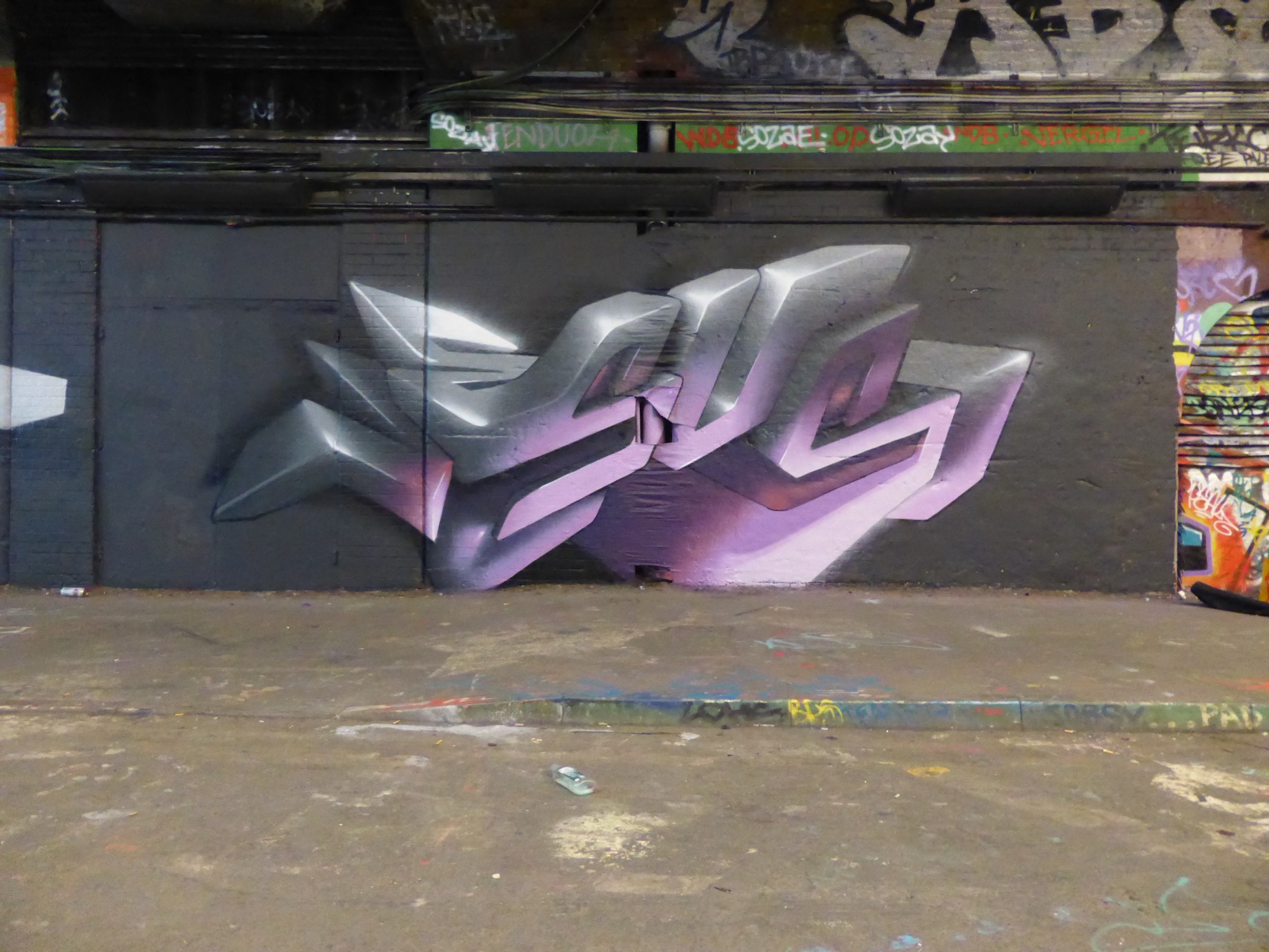 Earlier today we were delighted to pass through Leake Street and find two of our favourite Graffiti Wtiters, namely Lovepusher & Soda, at work side by side on a pair of tags set to their own distinct 3D style of choice. This two certainly make for a great pairing, with Soda working in his own brand of abstract geometric Graffiti and Lovepusher with his incredible futuristic ‘Jesus’ tags infused with that ‘glow’ which is very much pure Lovepusher. Well it’s only fair to say that this duo have really left their mark in the tunnel, however fleeting it may be.