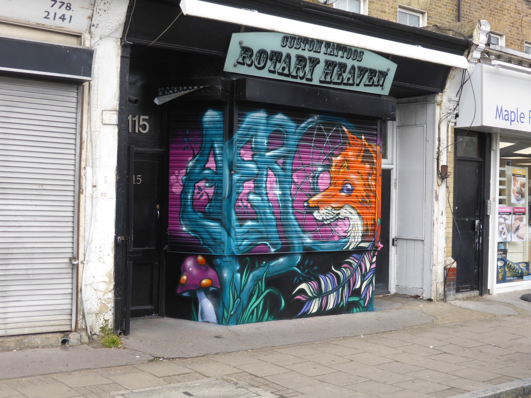 On Sunday we here at London Calling Blog were delighted to see the creation of the third work in our local area of Maple Road, Penge, with a beautiful work placed up by Graffiti Writer Aero, put up with a little support from us. This delightful new addition really is adding to the colourful life this road is slowly taking on. Shutters can be a tricky business, not suiting some artists style, this shutter all the more so for its awkward shape, however Aero didn’t let the surface show up his work, setting to construct one of his distinct ‘Animal Graff’ creations.