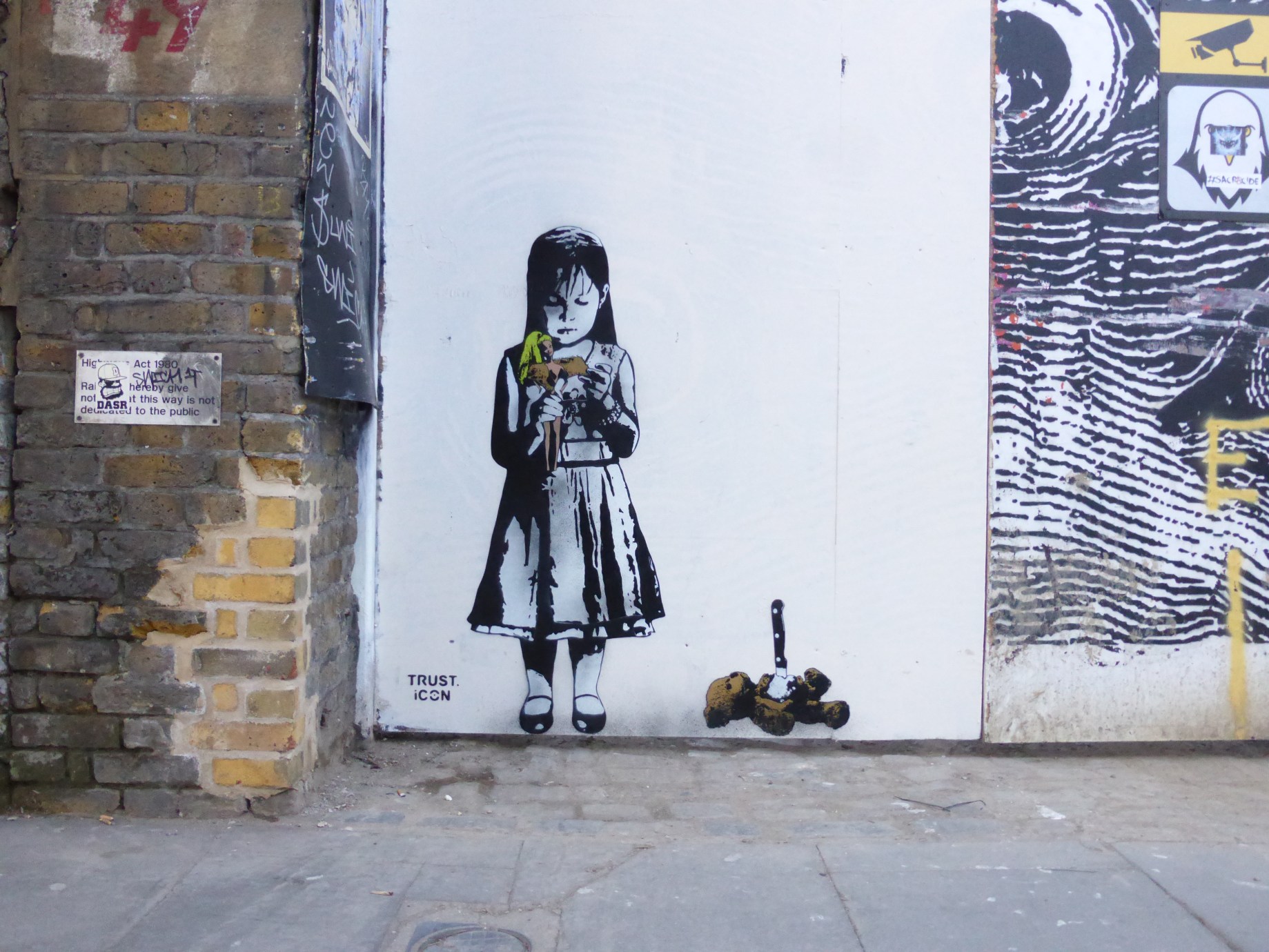 Following from placing up his first work of 2016 a couple of weeks ago (covered here), on Friday Street Artist Trust Icon hit Camden Town for his latest delightful work ‘Barbies New Coat’. In his work Trust Icon sets to capture a moment or a snapshot from his, and many peoples childhood, combined with his own style of poignant insight or humour injected into each design, making his style his very own and his works what they are. this is exactly what he has done with his latest piece. The ever tongue-in-cheek Trust Icon has created a rather brutally humourous scene in which the callous little girl has butchered her teddy bear to provide a fashionable fur coat for her Barbie doll, dressing her as the teddy bear lies impaled on the floor next to her. Yet again another clever and charming work from Trust Icon as well as being an absolute pleasure to see. This work was put up with support from The Real Art of Street Art.