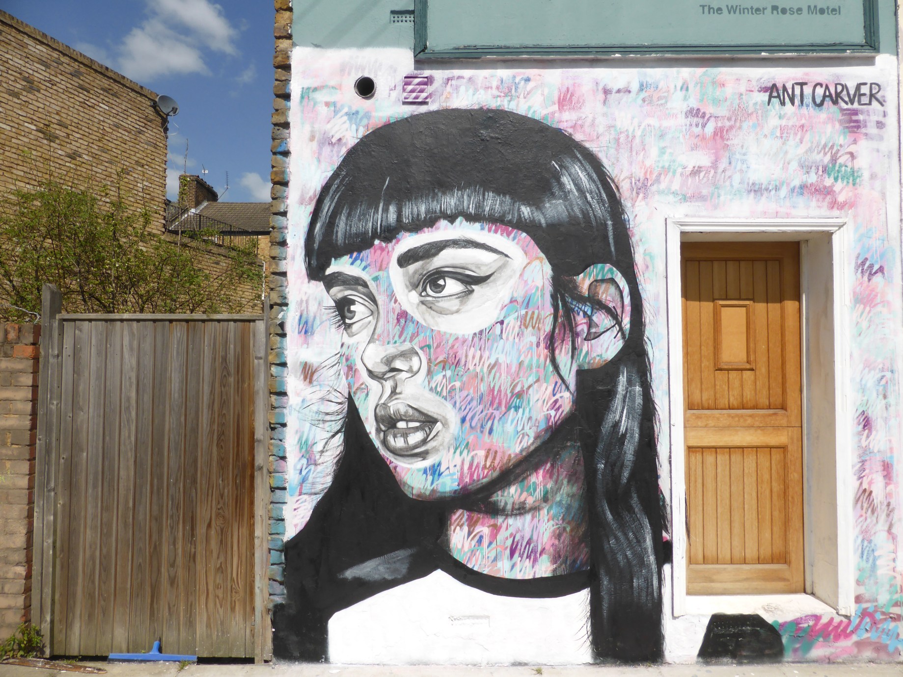 At the weekend Street Artist Ant Carver was out in Dalston creating his latest mural, with one of his beautiful and colourful portraits placed up on the outside wall of the Tina We Salute You Cafe in King Henry’s Walk, N1. Ant Carver’s style is very distinct, comprising the colourful background taking an abstract form, constructed from an elaborate process of being built up with spray paint and then deconstructed with smudges and even partly phased out with primer. It is on this platform that Ant sets to paint the detailed portraiture by brush with acrylic paints on the street. His grey-scale realistic portraits sit so well on the fluid and colourful base he composes, creating that striking effect of the beauty to be seen among the chaos. What we love most is how with many of the pieces, the eyes on the subject appear to be looking directly at you as you stand before the work, creating that sense of connection between viewer and subject.