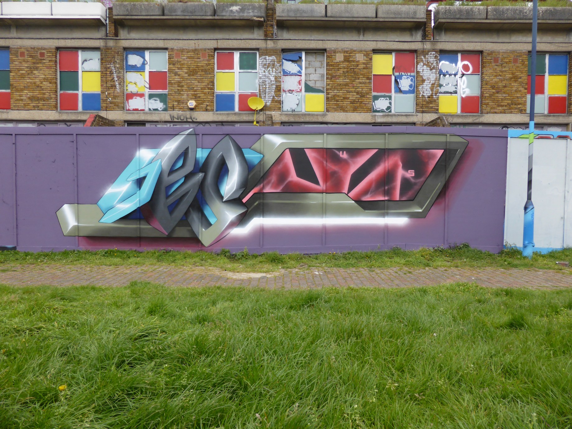 Yesterday saw 3D Graffiti Writer Lovepusher, who has been quite prolific around London of late, out in Brixton to paint his latest work entitled ‘Infinite Intelligence Illuminates’ on the hoardings outside the former Brixton Bloc and adjacent the Stockwell Skate Park. We don’t generally focus on Graffiti as much, however for us here Lovepusher is certainly one of the most impressive Graffiti Writers at work the world over. Having began painting in 1995 and since then transitioning from painting a more traditional urban form of typography to his current futuristic 3D creations. In the process developing his own glowing style of painting using light, shade and perspective in order to make his works pop off the walls on which they adorn. This piece as ever is simply stunning, and the trademark ‘Lovepusher Glow’ is certainly in full force, bringing life to this work. What is most striking about this particular piece is the how the left hand side of the work presents the letters as if bursting off of the surface and the right hand side of the work flowing back in to the hoardings upon which it adorns.