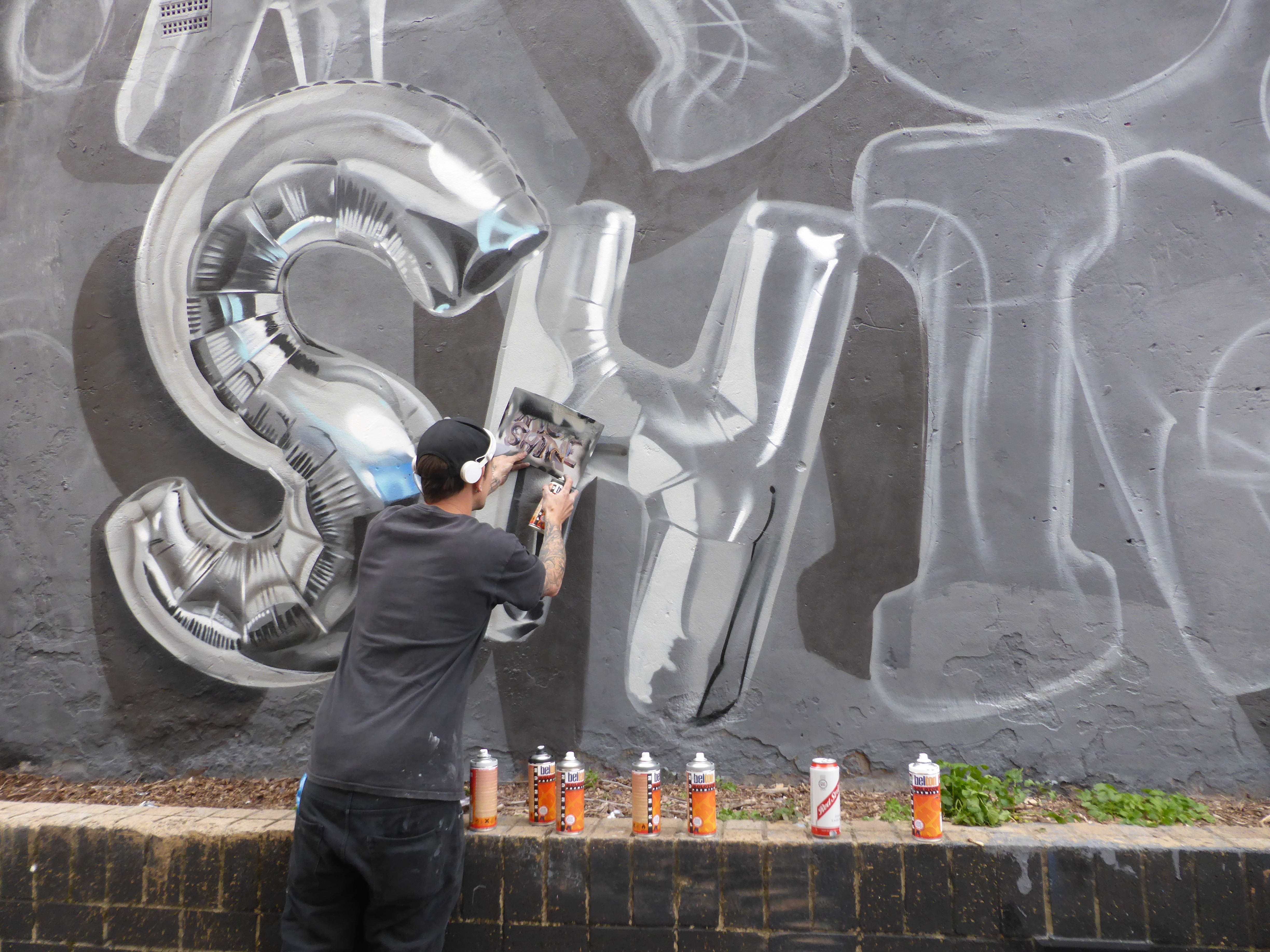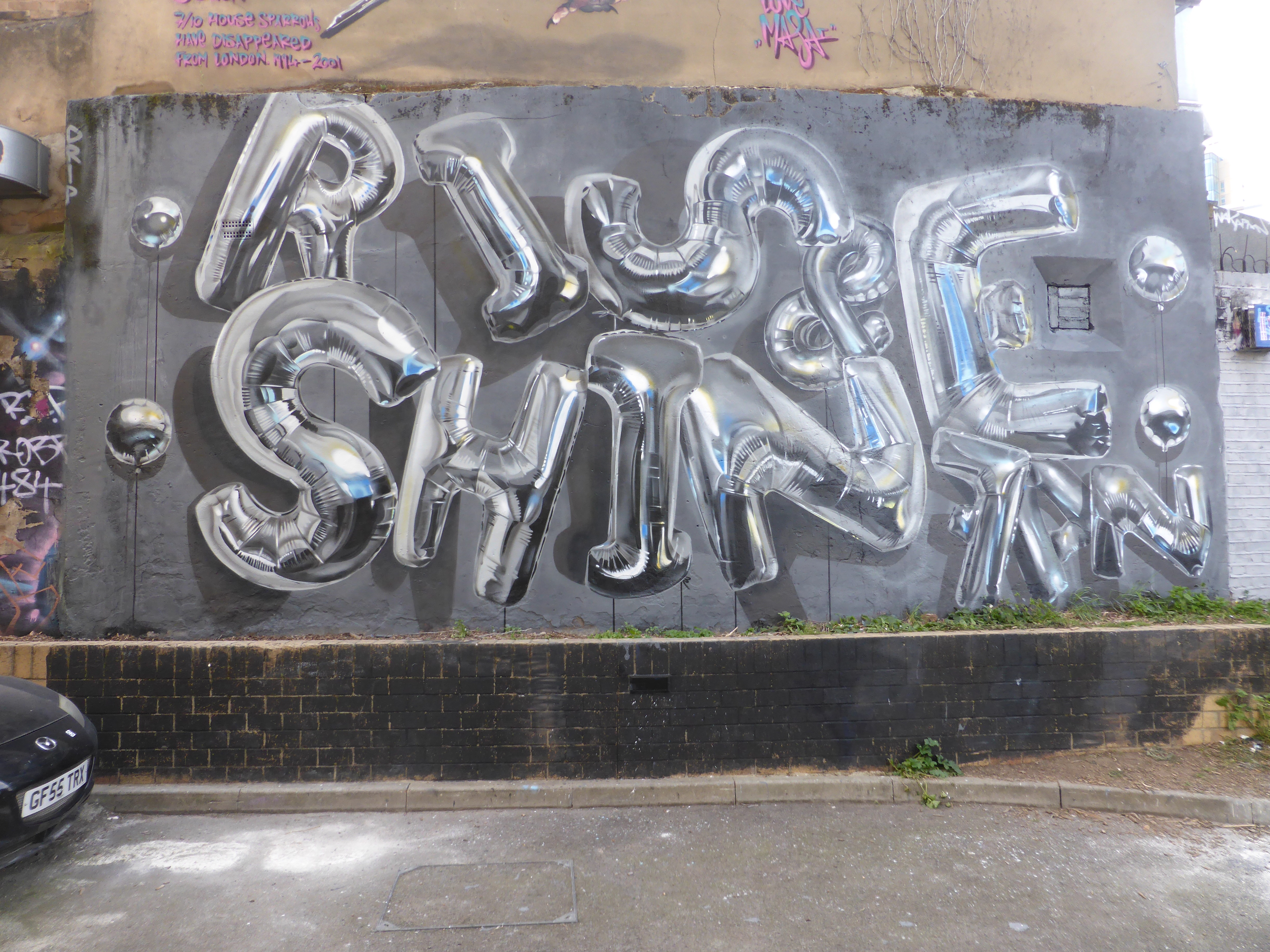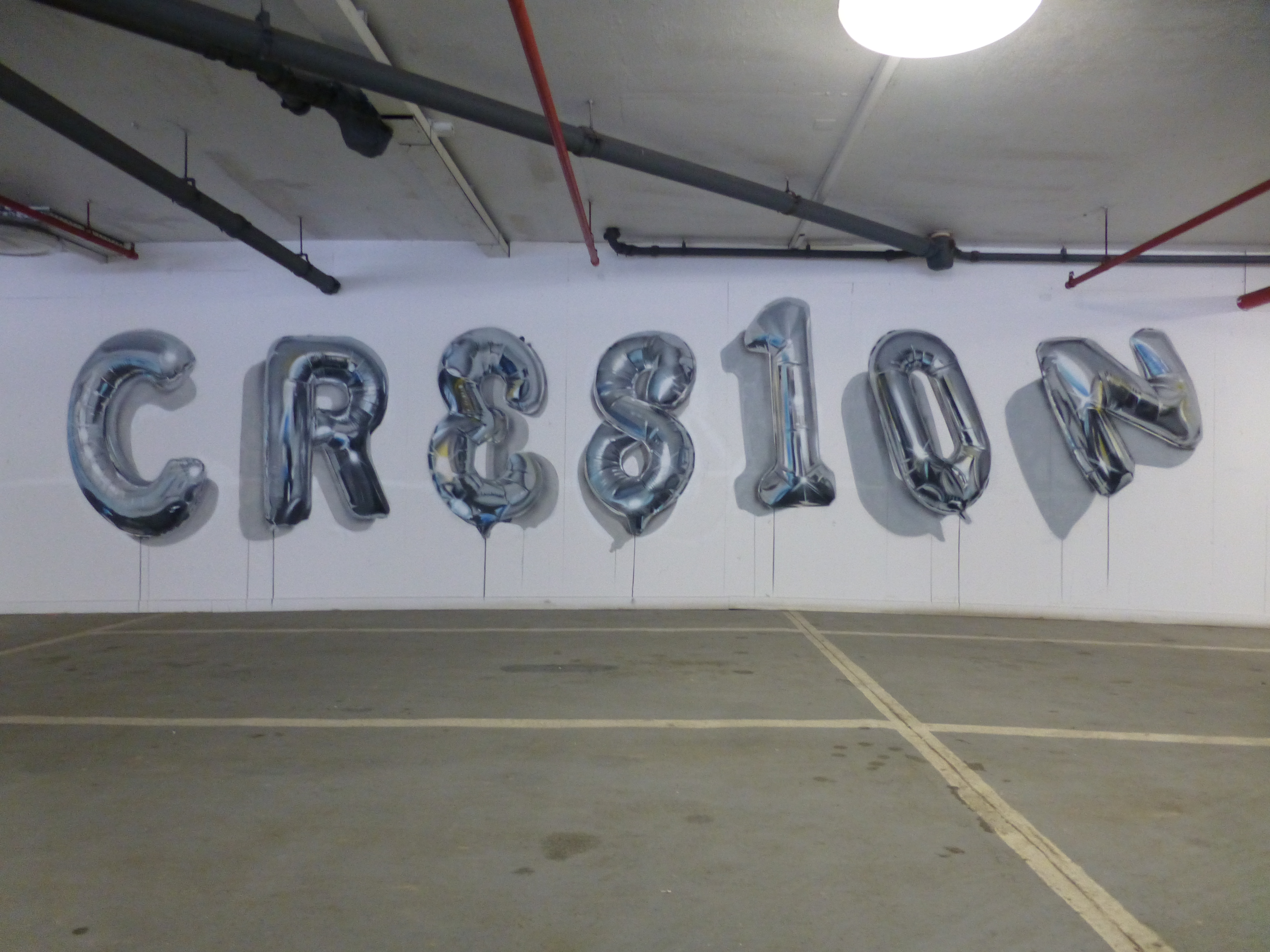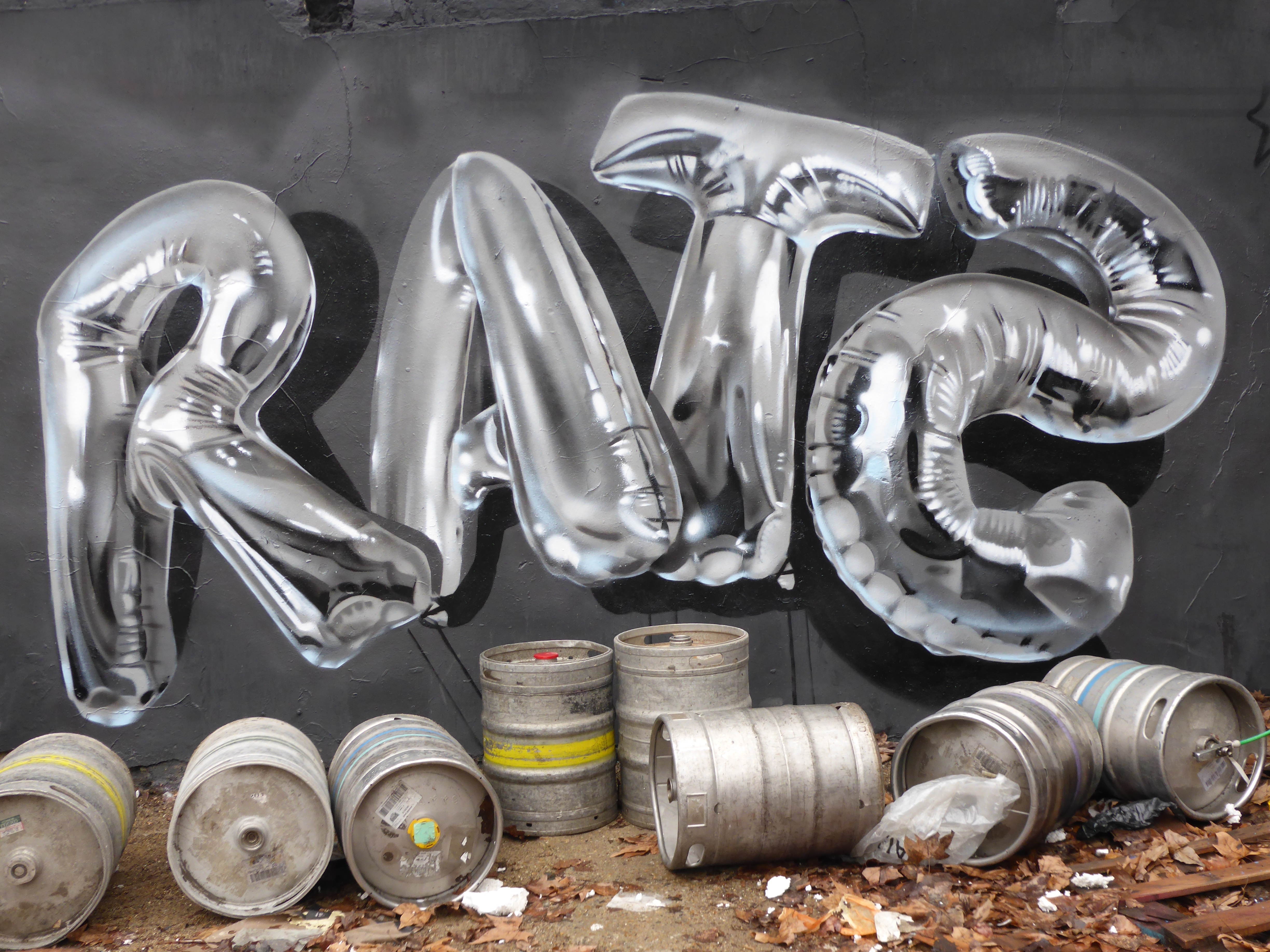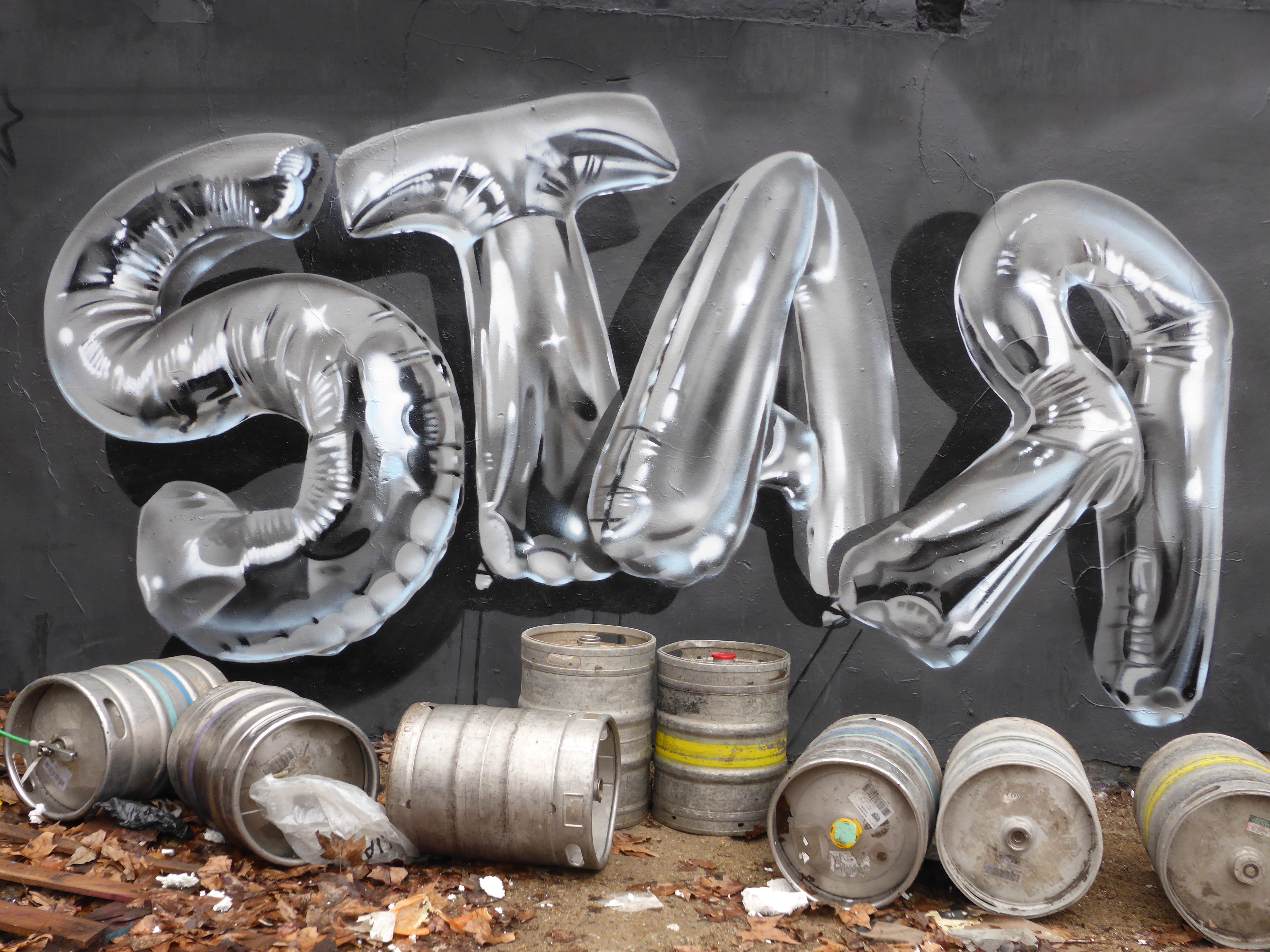 Late 2014 marked the latest development in his artistic output when he was asked to add something alongside a preexisting work from Vinie Graffiti in Spitalfields, and deciding to go with some balloon musical notes that Fanakapan found via Google a design for a chrome based balloon design which sparked a change from the translucent to the opaque, reveling in the reflections and shadows such subjects offered, allowing him to focus in the folds and drop shadows. It was a few months later in Berlin that Fanakapan painted his first full on chrome based design, something which he has been pursuing in a variety of approaches since, continuously striving and succeeding to improve and enhance his style and effect, demonstrating his superb use of shadow and reflective light highlights to make his works just pop of the surfaces they adorn in a full 3D effect.