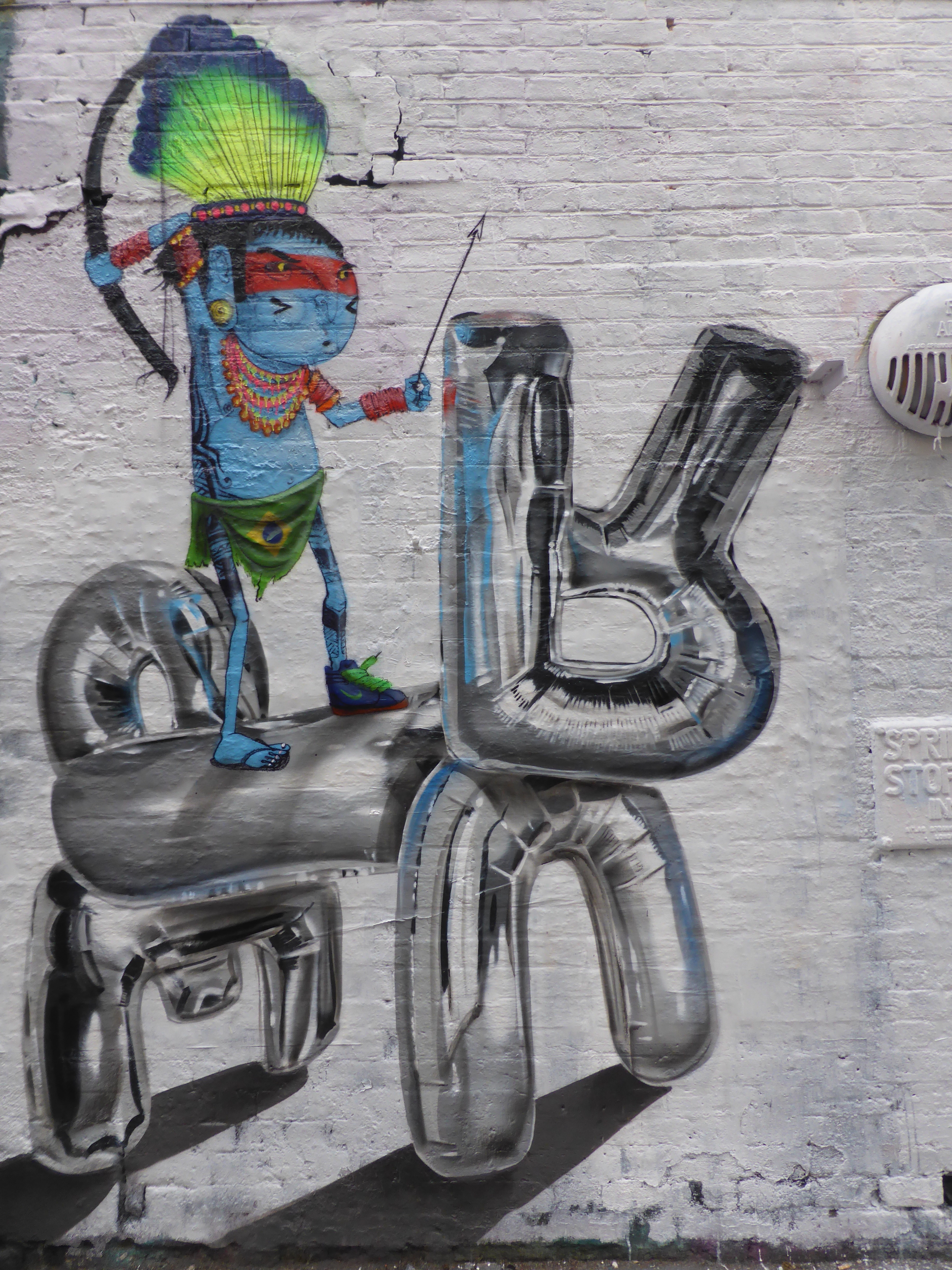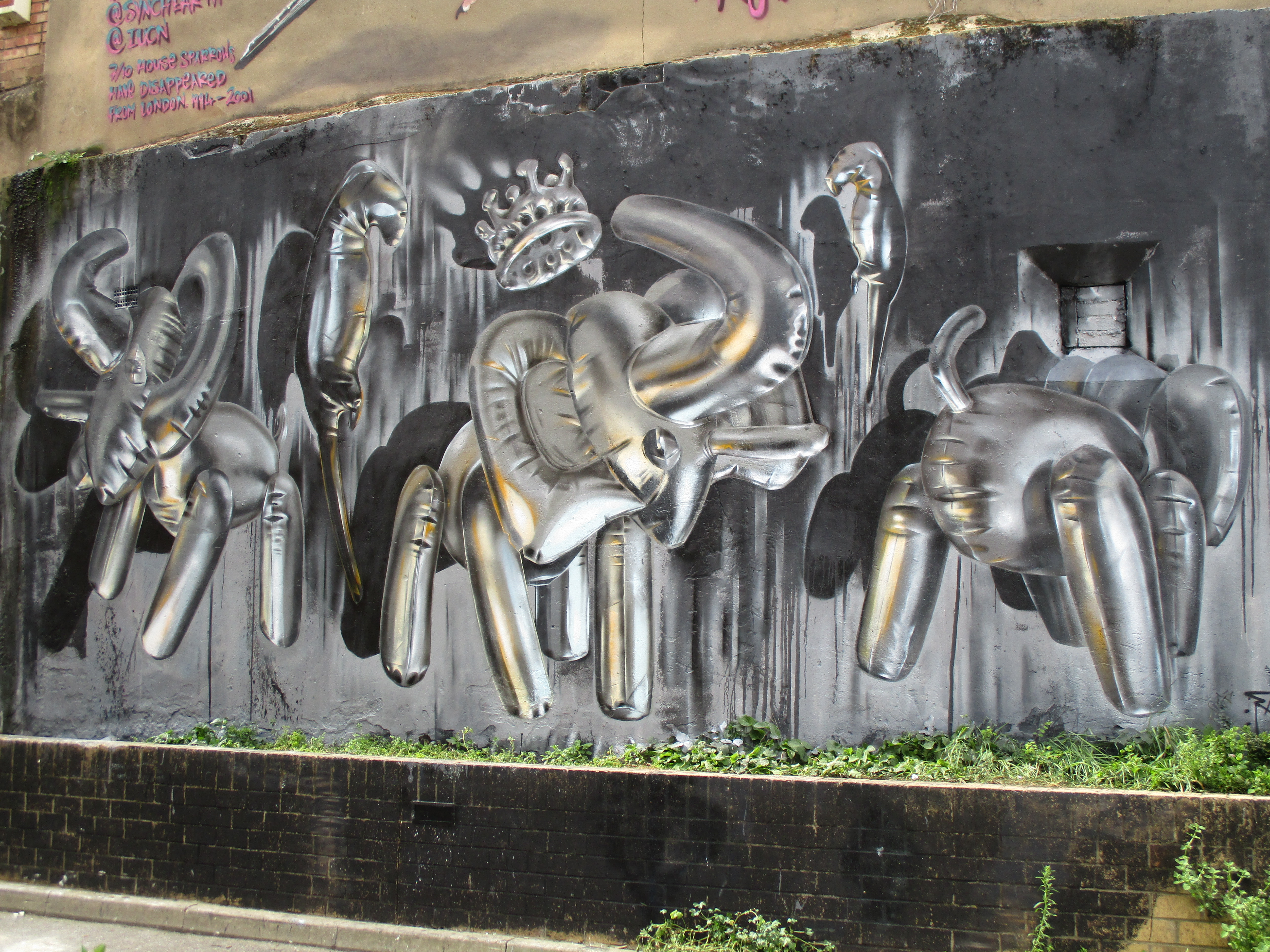 Work in Star Yard, Brick Lane. This work marked the first in London featuring Fanakapan’s full on shift to the monochrome opaque balloons as subjects.