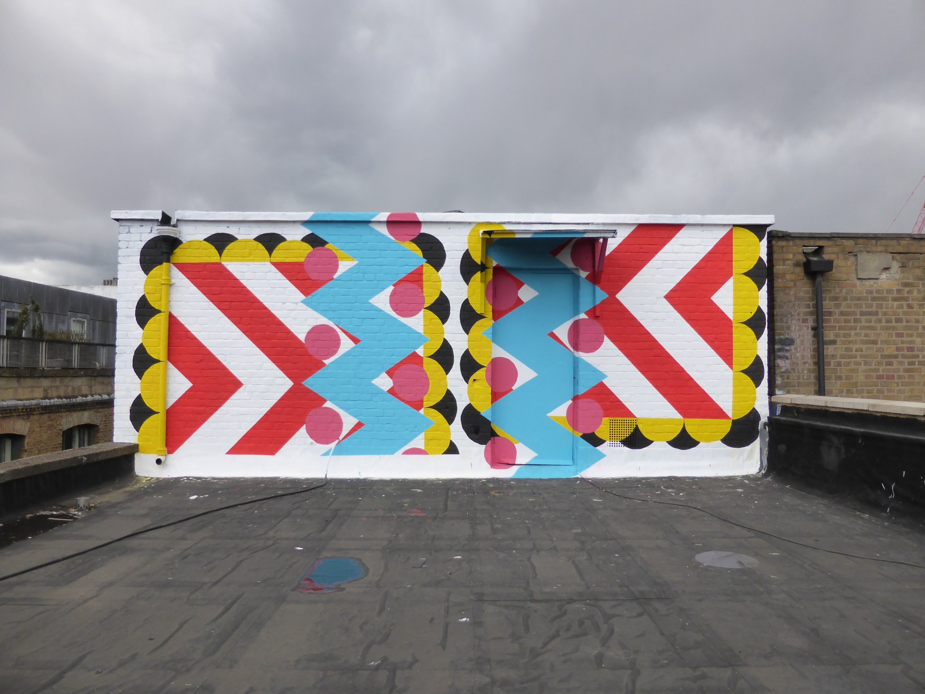 It’s a new month and yet again the Jealous Gallery has a new piece on their roof’s feature wall as a part of the ongoing Jealous Rooftop Mural Project, which just goes from strength to strength as the months pass. On this occasion the work is from visiting Japanese artist Masagon, who flew over just to paint this wall, but then couldn’t resist the chance of hitting up a second work in Sclater Street. As an artist Masagon works in a number of mediums including paintings, sculpture and installation pieces which are often a fusion of Pop and Kitsch culture, setting to create a psychedelic effect with his boldly coloured geometric driven creations. Yet again we here at London Calling Blog were fortunate enough to be let up on the roof again by the kind staff of the Jealous Gallery and capture this piece to share with you all, so thank you again Jealous Gallery.