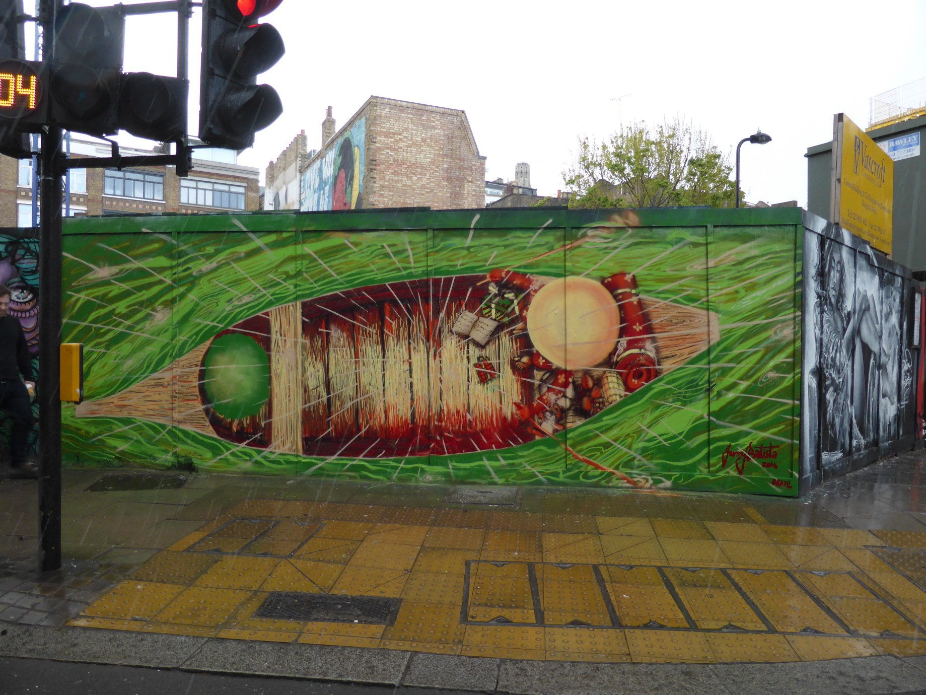 Ten days back saw London receive a visit from visiting Brazilian Street Artist Jerry Batista who left a intriguing and beautiful work in his wake. Hitting Shoreditch with this serene piece entitled ‘Green Waters & Spring Rain’ offers just that, an almost surreal subject choice depicting a birds-eye view of a small two person boat – with a hole in its bottom, in turn placed aboard the boat – set amid the flowing green waters as rain falls amid the scene. This lovely work can be found in Great Eastern Street, Shoreditch.