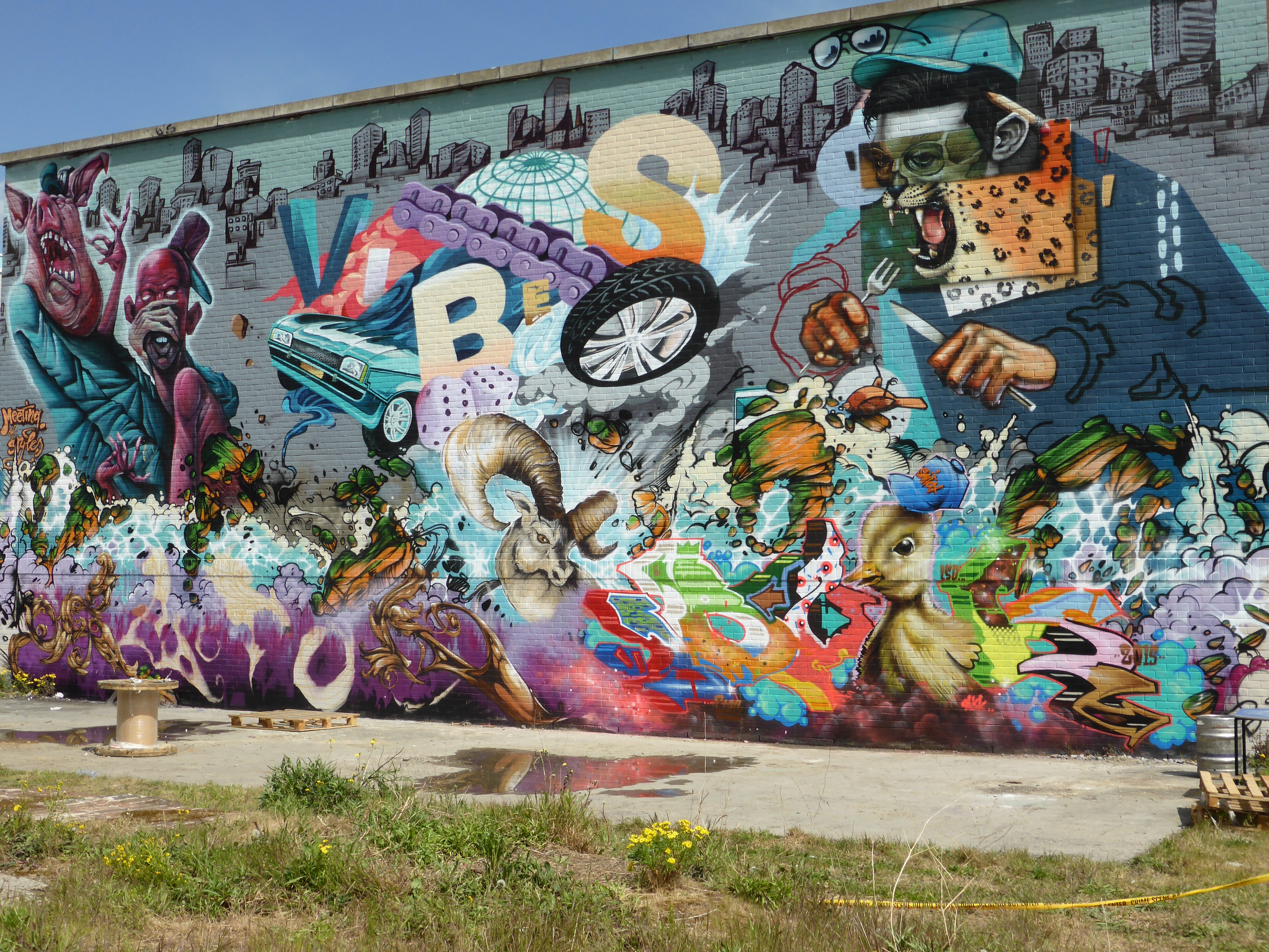 Huge wall with works from Oddysey, Vibes & Gent 48, with new additions along the bottom, covering some defacing, from Jim Vision & Zadok for the Green House Effect Paint Jam.