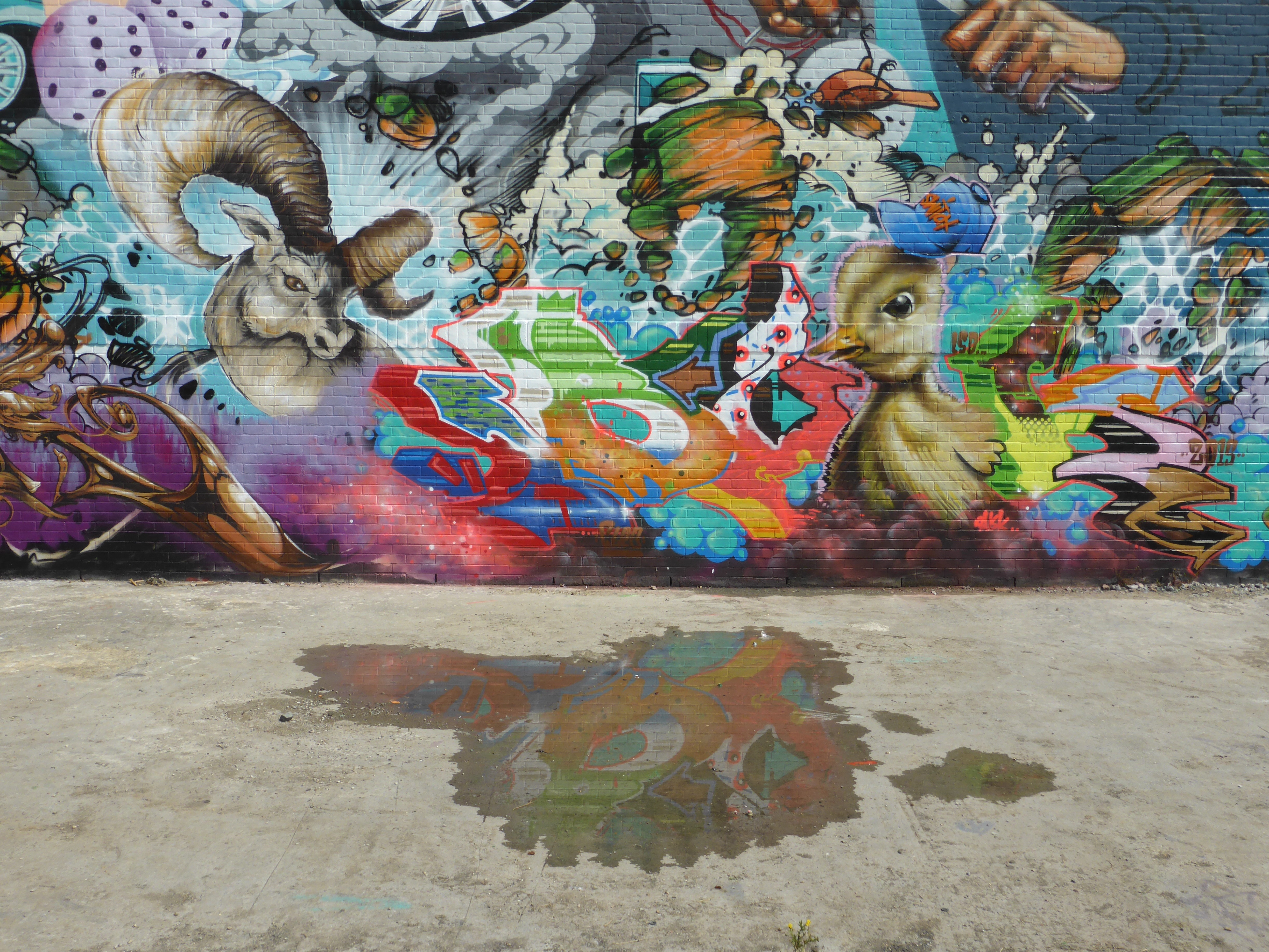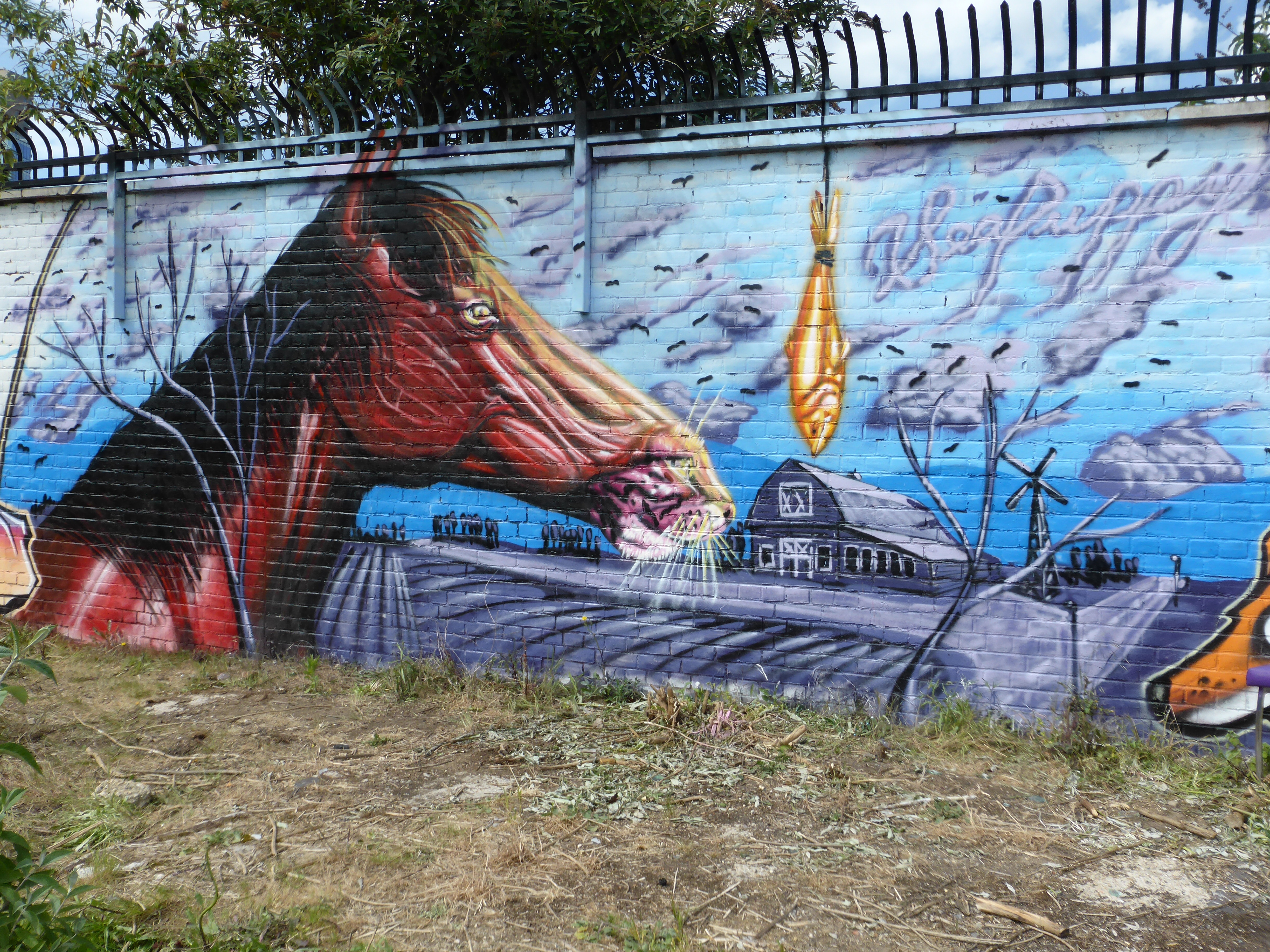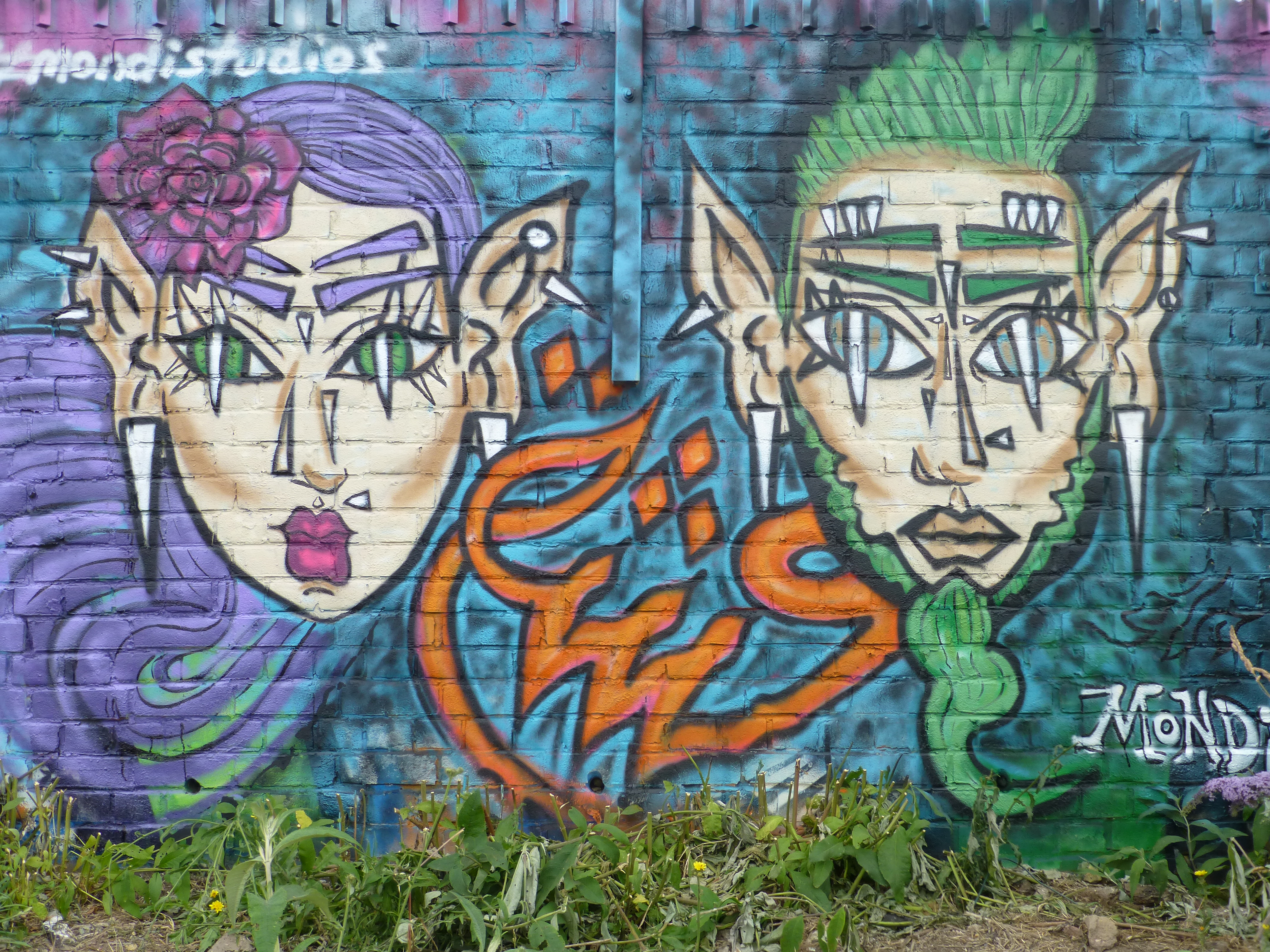 If anyone can let us the name of the art students who did this piece are, please let us know, so we can credit accordingly. They showed up on Saturday and had so much fun, asked if they could paint on Sunday, and were granted the wall to do this.