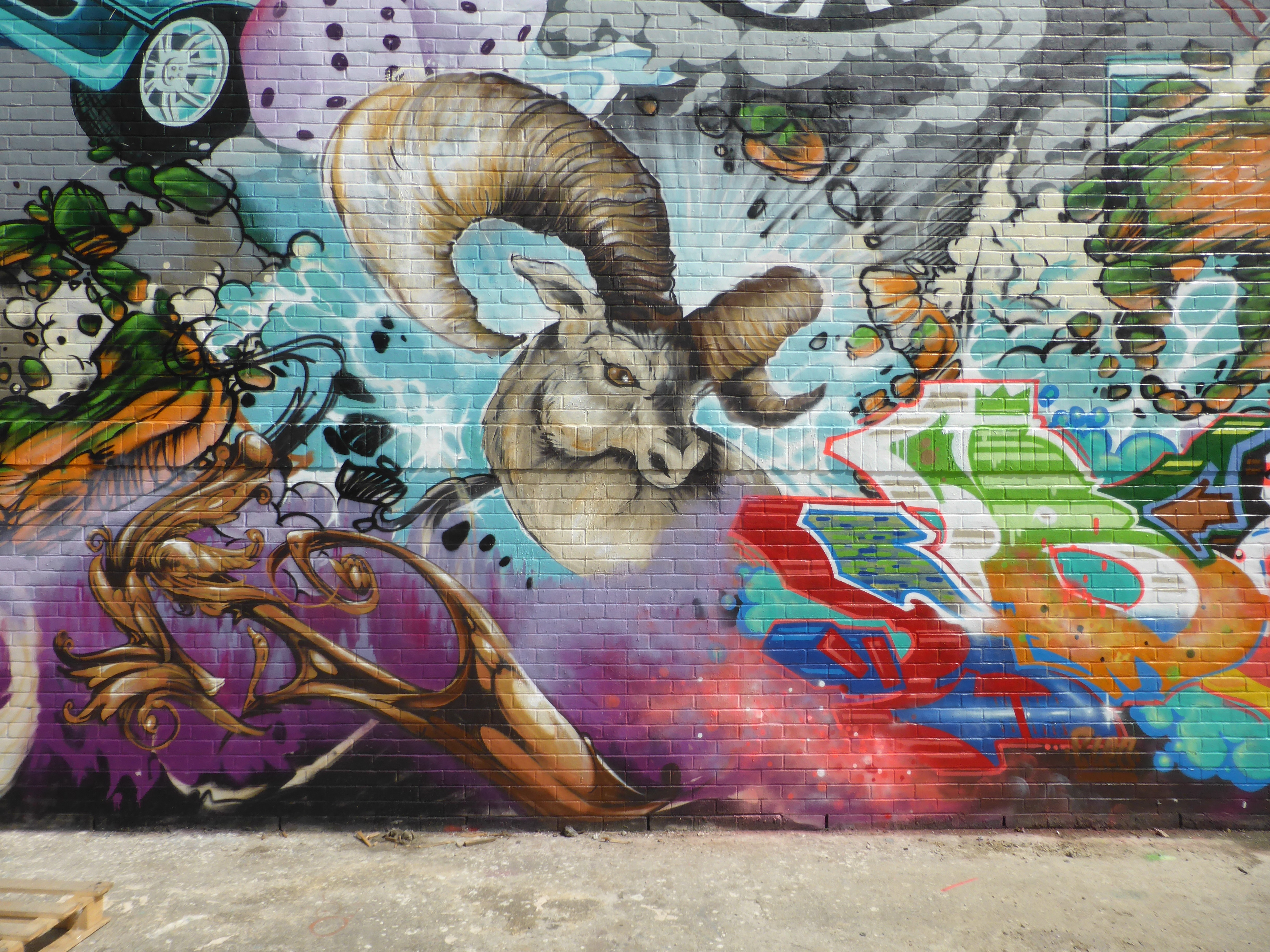 The garden feature wall, with a few additions to be added by Zadok, but including works from Tyme (top left), Adno (top centre), Awore (top right), Djalouz (middle left & middle right), Kak (bottom left), Ekto (bottom centre), Wisher (bottom right) with the centre piece and background work from Jim Vision & Zadok, for Meeting Of Styles.