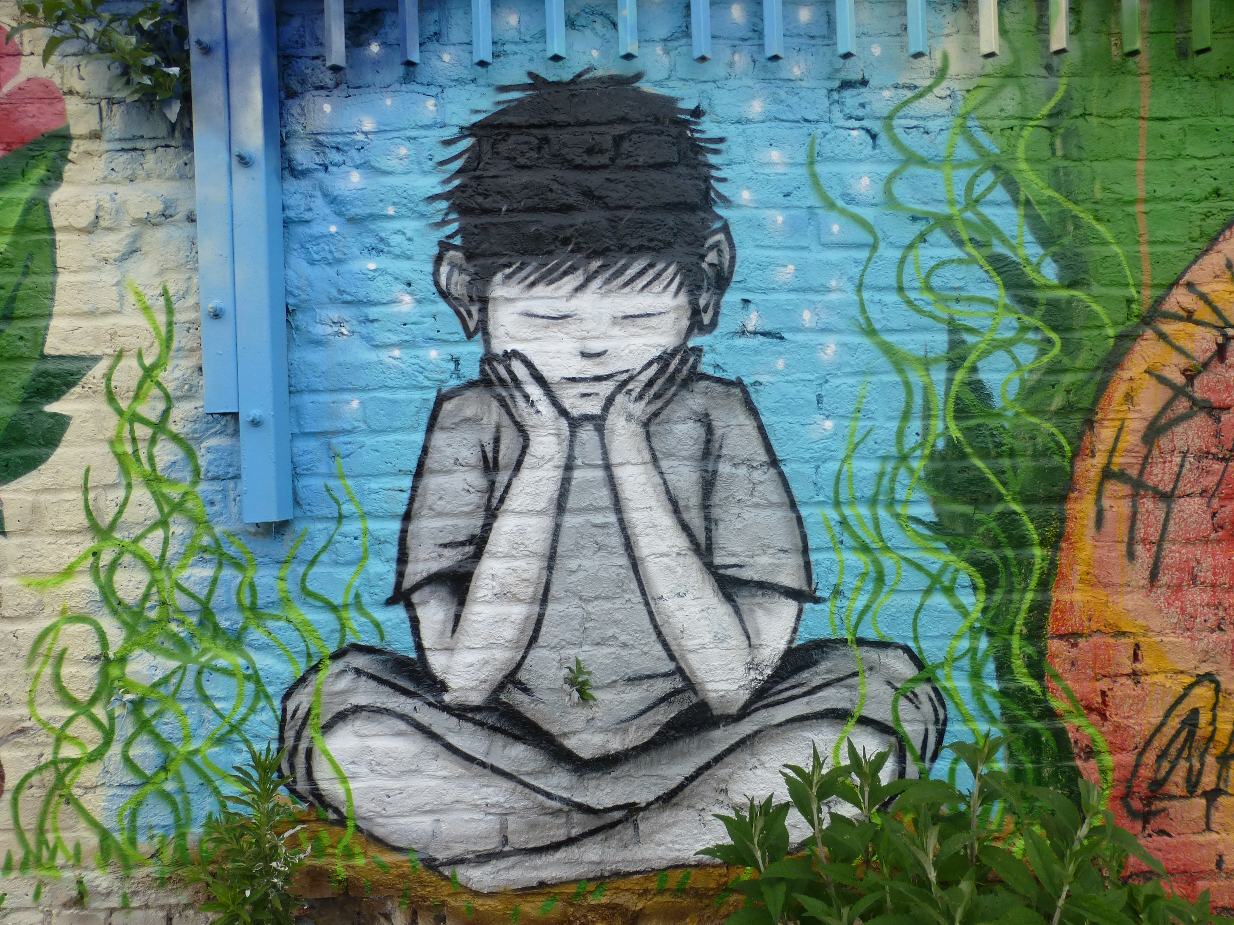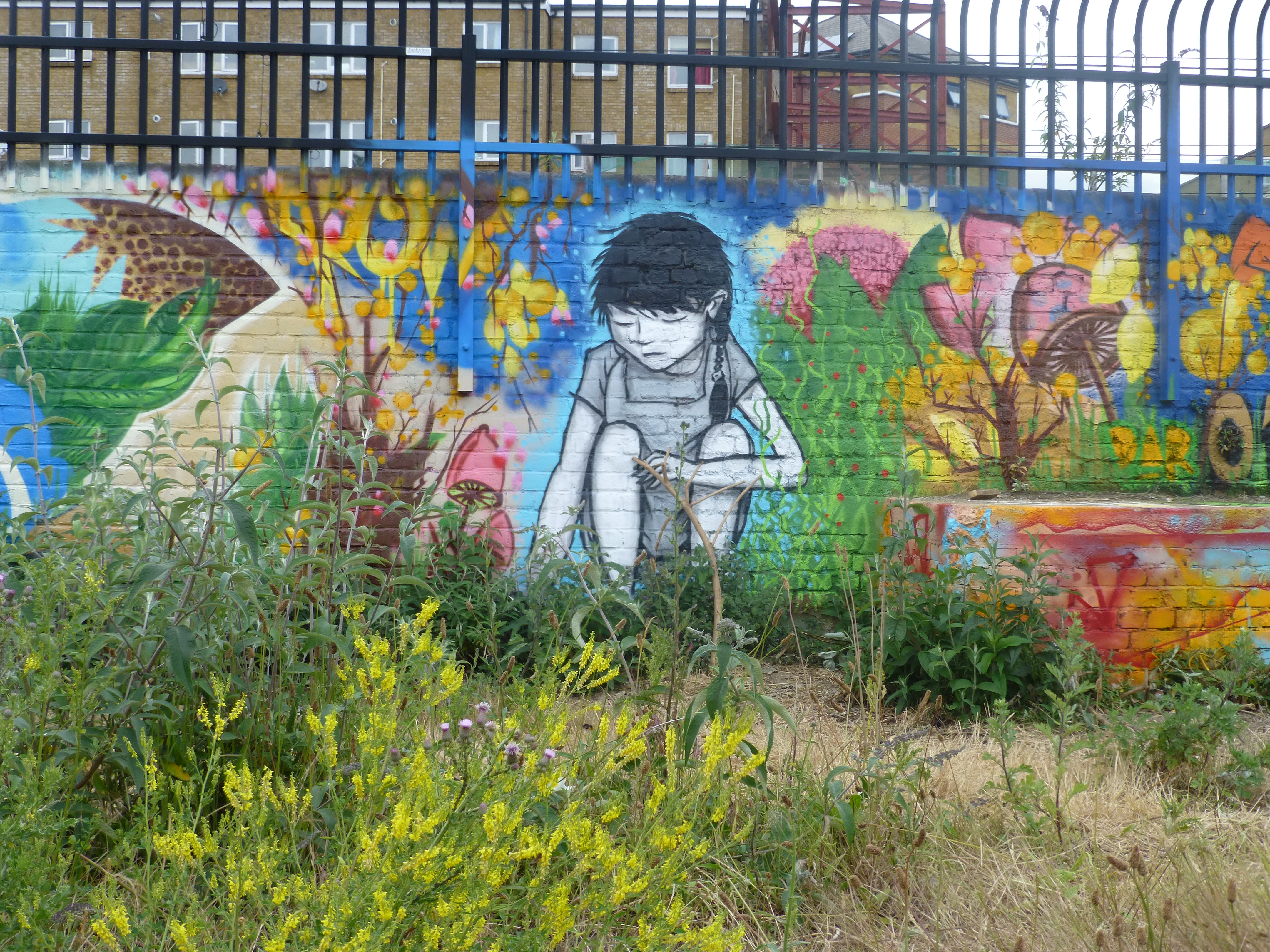 For this touching focal-point work the artists in question have created a piece focusing on the very nature of the project and gardens them self. The work is punctuated by Bill Daggs serene characters of young children tranquilly enjoying the scenery, accompanied by Seeds One bright and colourful letters and trademark worms character, ‘grow’. Additionally accompanied by Himbad’s dog and Tony Boy’s butterfly catcher.