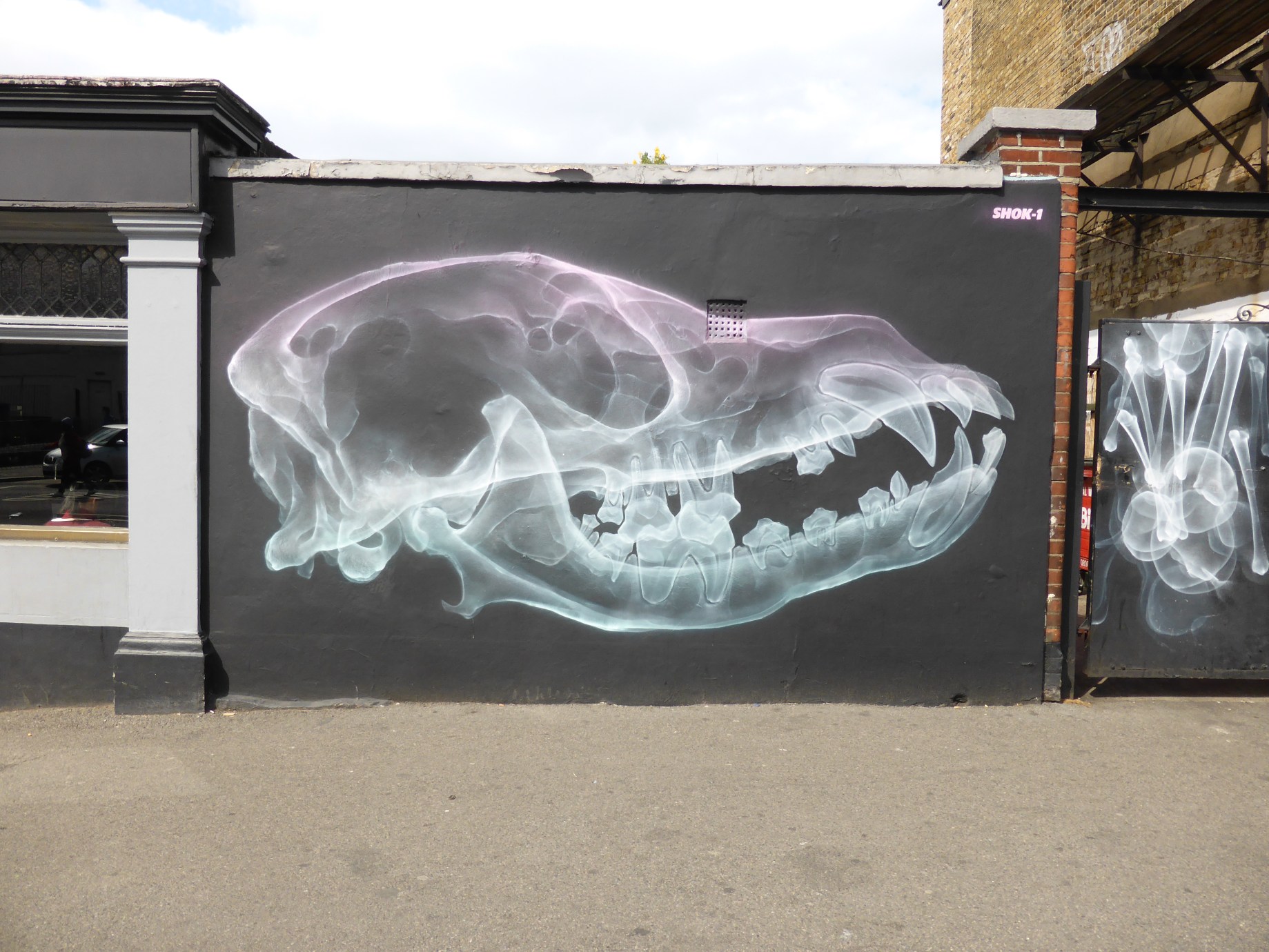 Over the last week Shok-1 was at work in Forest Road, Walthamstow, belatedly adding his contribution to the ‘Paint Your London’ Festival recently held in Walthamstow, put on by Wood Street Walls. In his works Shok-1 uses the many anatomical elements of the human body to transform and create his myriad hybrids creations that distinguish his glowing X-ray compositions. The magnificent translucent quality he creates is due to his meticulous technique with cans and caps, which he likes to keep a closely guarded secret, you can see why with the use he makes of this technique, leaving one in awe of the works he creates on walls.